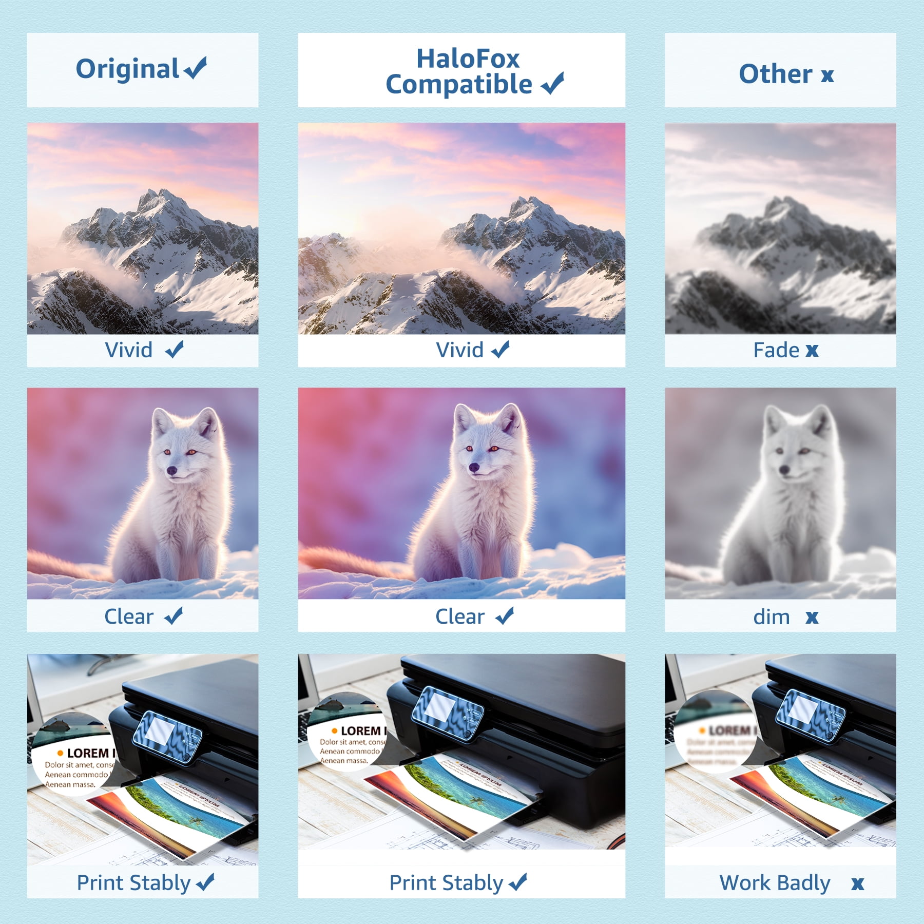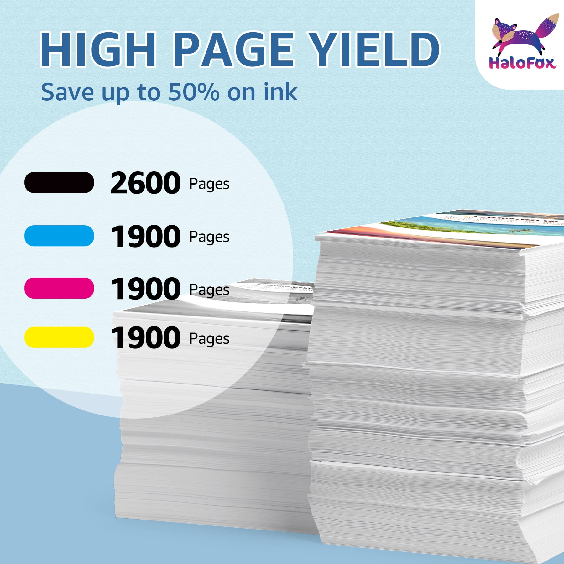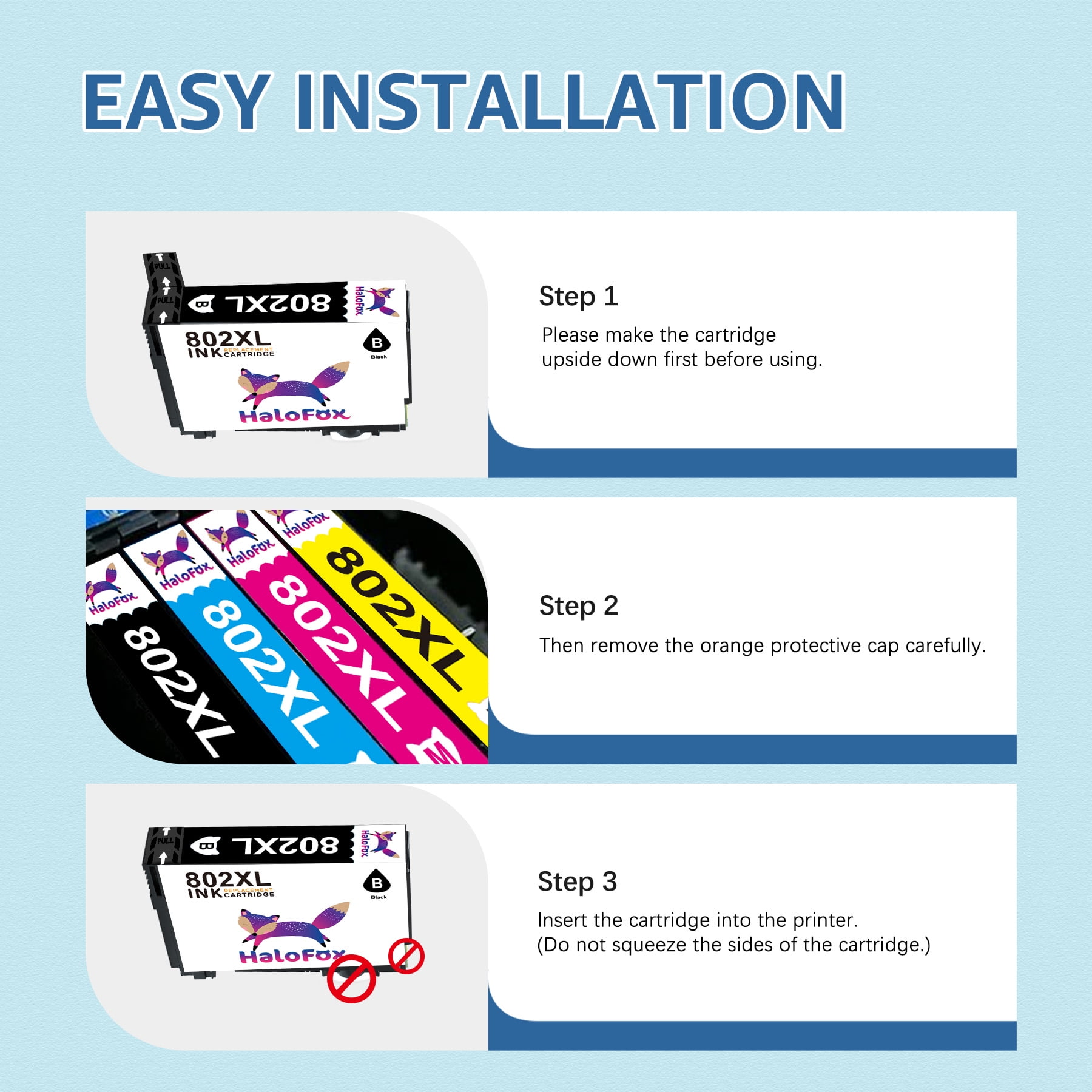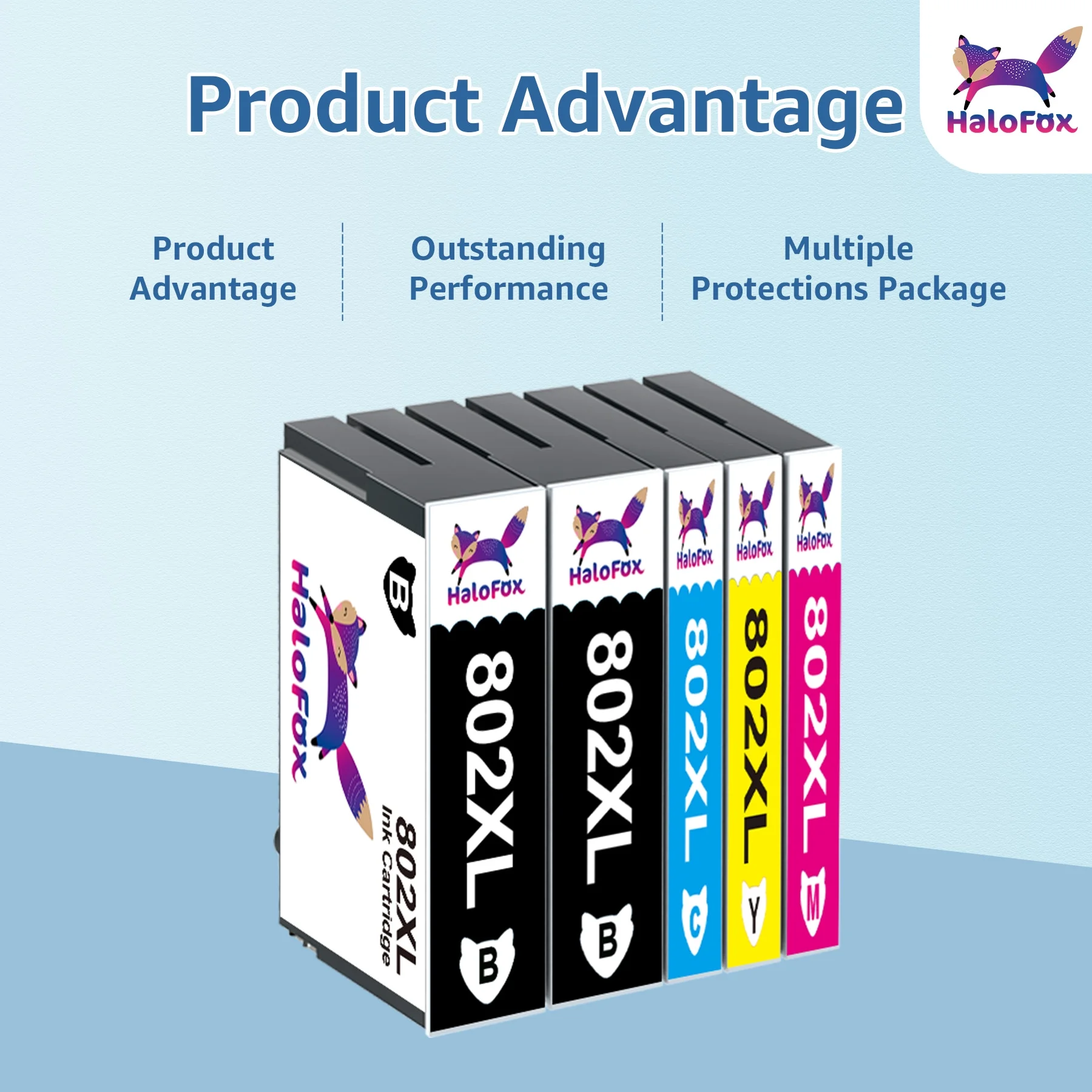 📃Model: HaloFox compatible ink cartridges replacement for 802XL 802 802 XL T802XL T802 ink cartridges 🖨️Compatible Printers: Epson Workforce Pro WF-4720, Workforce Pro WF-4730, Workforce Pro WF-4734, Workforce Pro WF-4740, WorkForce Pro EC-4040, WorkForce Pro EC-4030, WorkForce Pro EC-4020 Printer 📃High Page Yield: Black is 2600 Pages per cartridge at 5% coverage,Color is 1900 pages per cartridge at 5% coverage 📦Package include: 1 x User Guide, 2 x Black 802XL, 1 x Cyan 802XL, 1 x Magenta 802XL, 1 x Yellow 802XL, total 5 cartridges 📃Ink Quality: premium ink delivers crisp text and graphics 📃Do not touch the copper-colored electric shock or ink nozzles to avoid appearing clogged ink nozzles, non-jetting, and poor electrical connections. 📃Warm Tip: please confirm your printer model before ordering
