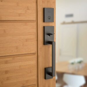 – San Clemente has a slim square low profile deadbolt and matching handle set with a modern interior lever.