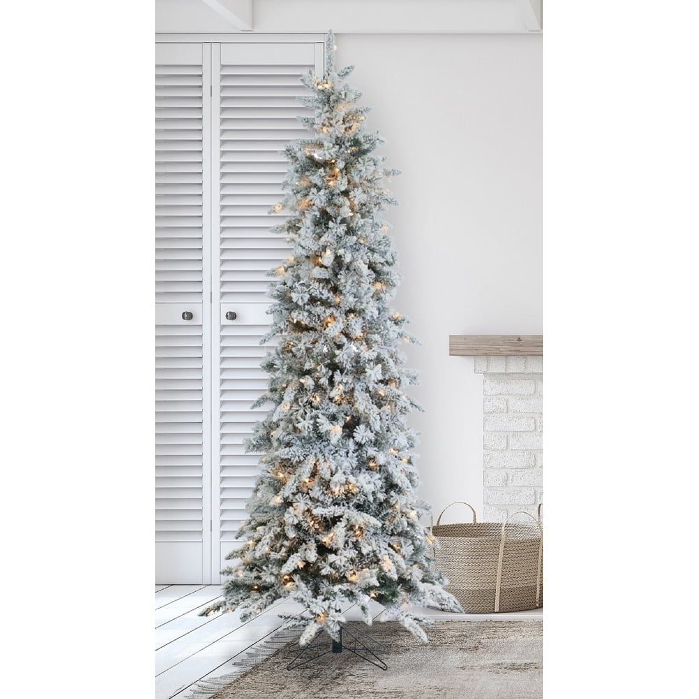 Sterling Ease into the holidays with this awe-inspiring pre-lit artificial narrow flocked pencil Pine Christmas tree so realistic it could fool your gardener! A towering 9-feet high with that classic Alpine body and a shapely base diameter of 47-inches, this stunning Alpine comes with 650 clear incandescent bulbs to add a warm, hearth-and-home glow, but without the mess and fire dangers of a live-cut tree. Safe, fire-resistant needles provide an amazing 1256 Alpine branch tips to put your favorite ornaments on display. It’s an eye-catching centerpiece providing the cheer to make your holidays a lasting memory. Comes with a 29-inch diameter, sturdy four-prong stand for safety and stability.