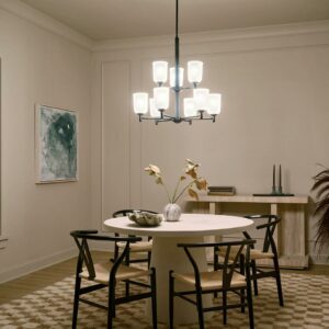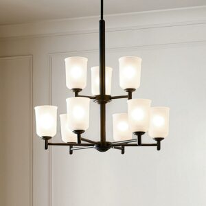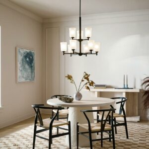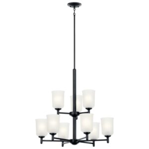 Kichler Lighting-43672BK-Collection: Shailene, Material: Steel, Finish Color: Black, Width: 26.25″, Height: 26.5″, Chain Length: 36″, Lamping Type: Incandescent, Number Of Bulbs: 9, Wattage: 100 Watts, Dimmable: No, Moisture Rating: Dry Rated, Desc: The straight lines and up-sized satin etched glass of this Brushed Nickel 9 light chandelier from the Shailene Collection create the perfect casual look for the updated urban lifestyle. Sloped Ceiling Adaptable: Yes / Chain Length: 36.00. ,-Shailene – 9 light 2-Tier Chandelier – 26.25 inches wide-Black Finish -Traditional Installation