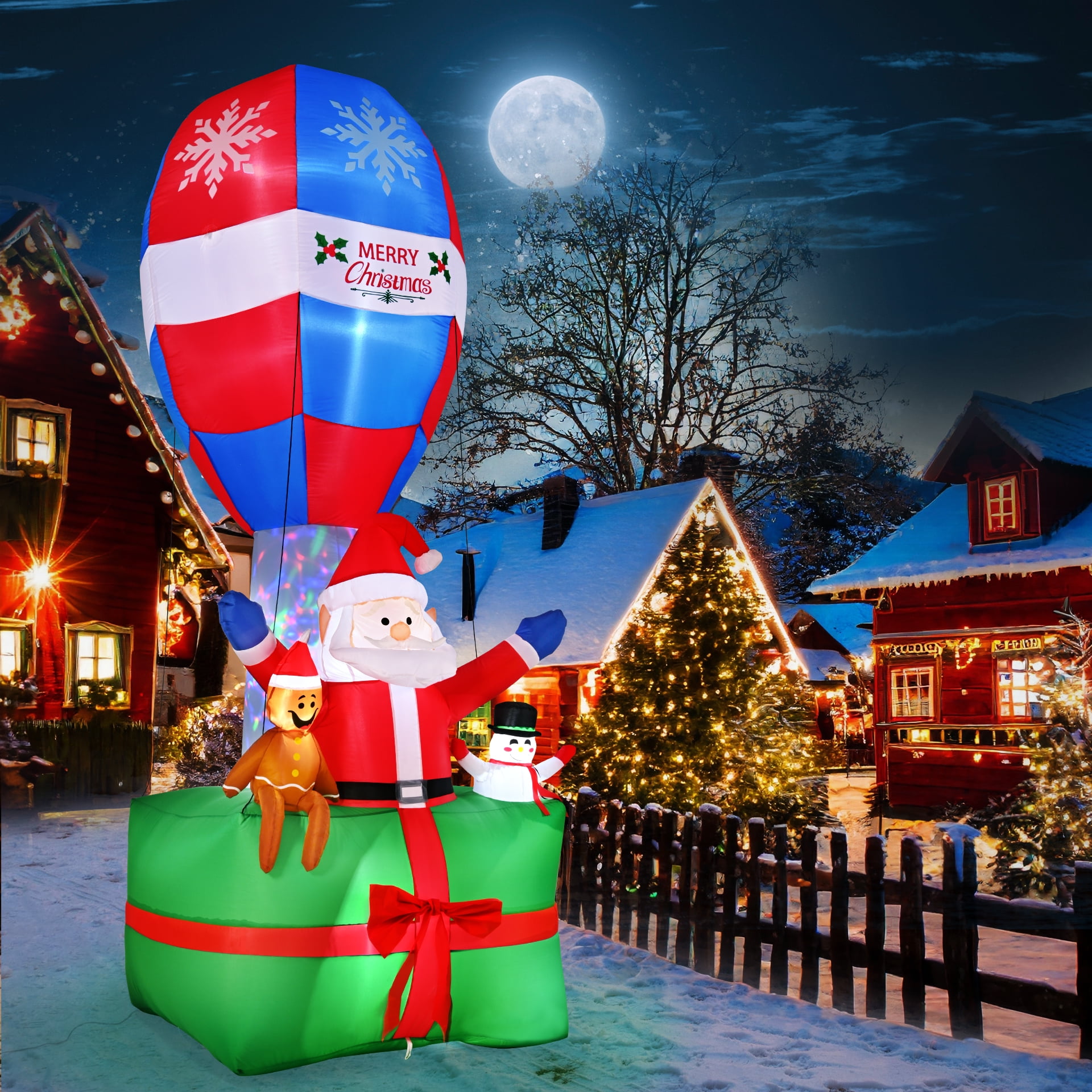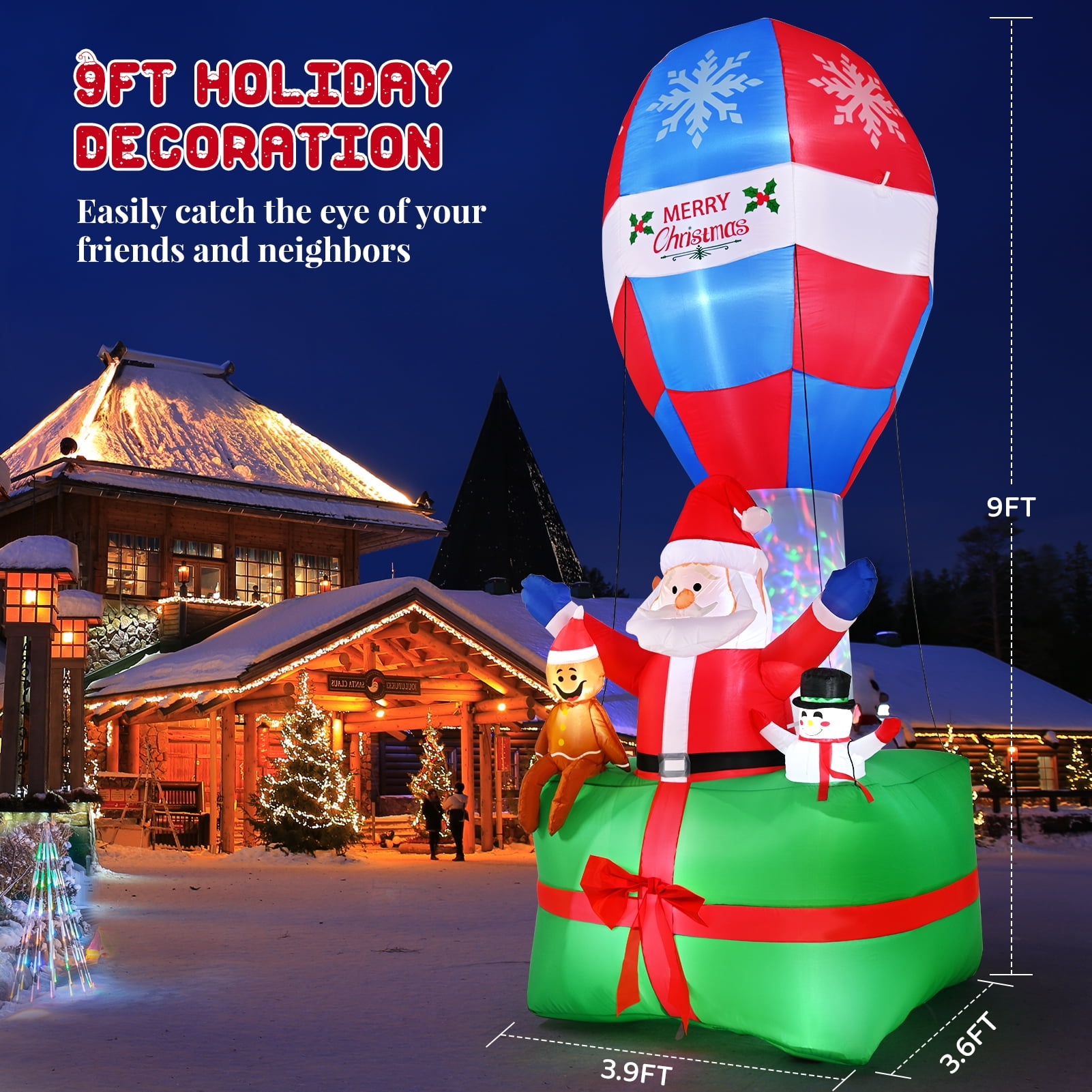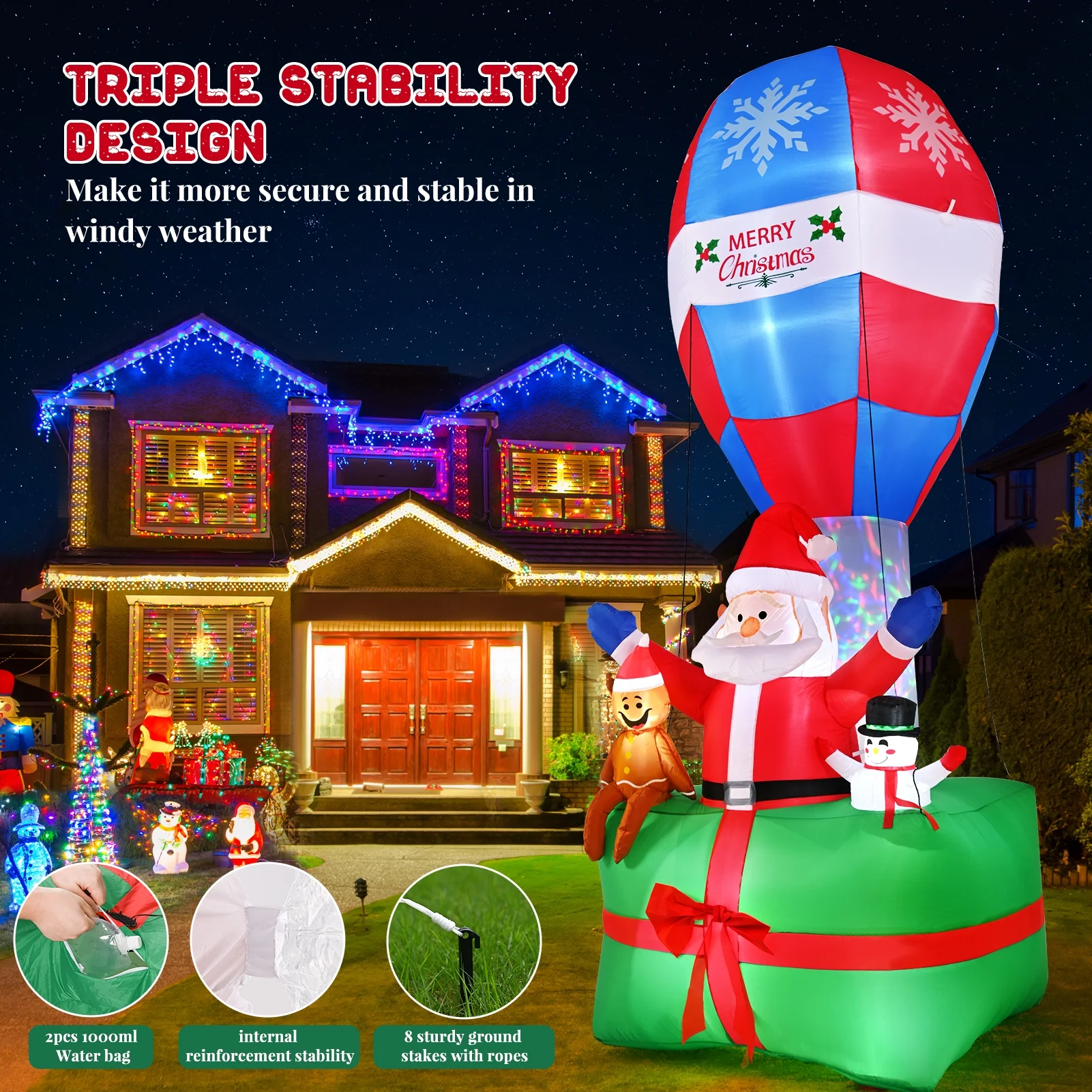 9Ft Christmas Inflatables Outdoor Decorations, LED Lighted Santa with Gingerbread Man and Snowman, Gift Box with Giant Balloon Blow Up Yard Decoration for Xmas The Christmas inflatables outdoor decorations are wonderful for yard decoration, home, lawn, holiday, Indoor Outdoor Garden Christmas Decorations. The festive atmosphere of Christmas will revolve around your family. Outdoor inflatable Santa Claus is made of durable polyester. CE and UL standard certified LED light and durable blower bring you strong Christmas atmospherewith your family. Spreading holiday cheer and inviting everyone to embrace the magic of the season. The snowmen and penguin adds a lovely touch to this decoration! Package Included: 1 x Christmas Inflatable Santa with Gingerbread Man and Snowman, Gift Box with Giant Balloon 8 x stakes, 4 x ropes, 2 x bags 1 x Plug with UL Certification 1 x Powerful Blower 1 x Gift Box Outside Christmas Decorations for Yard, Garden, Christmas Event, Shopping Mall