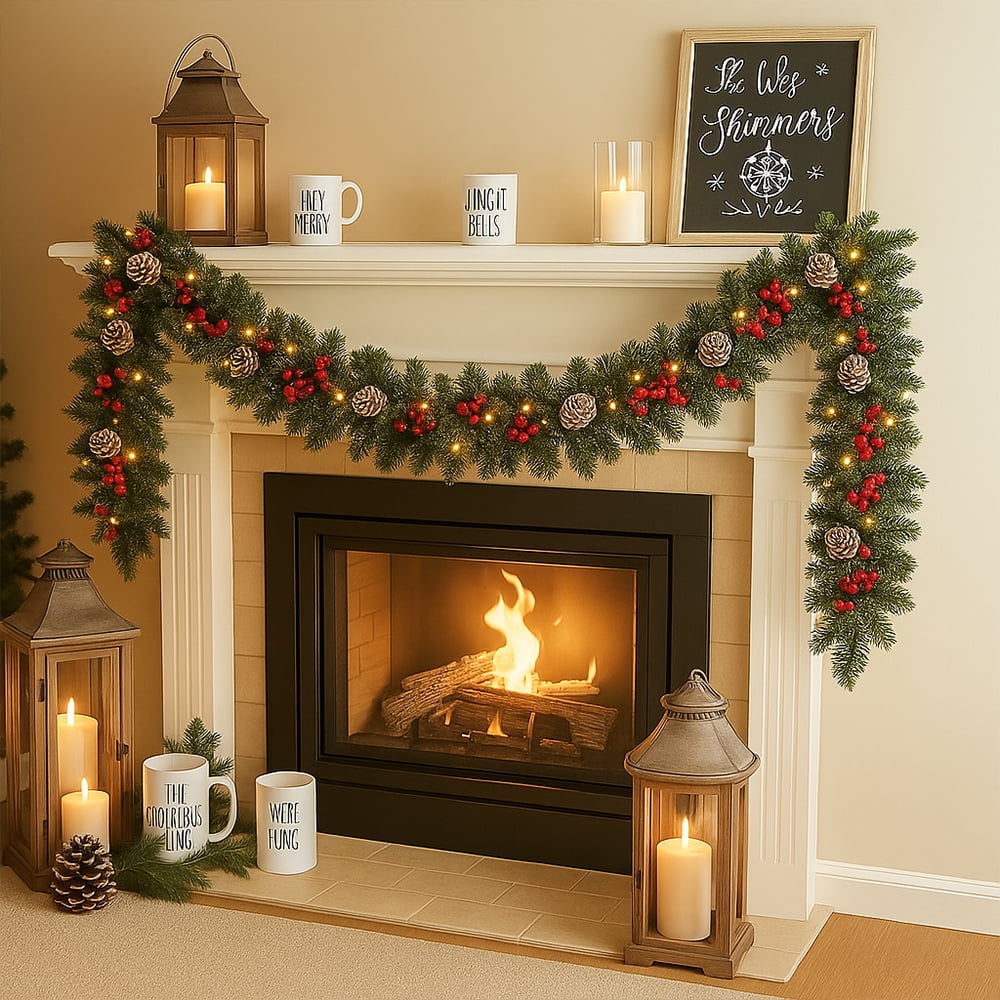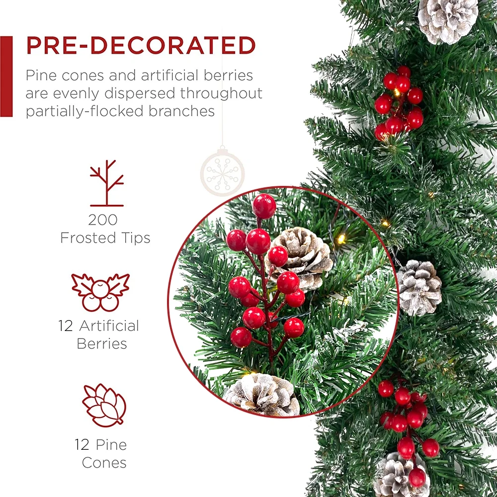 9ft Pre-Lit Christmas Garland with 50 Waterproof LED Light and Pine Cones and Berries, 220 Branches Battery Operated Christmas Garland Decoration for Xmas Holiday Party