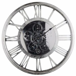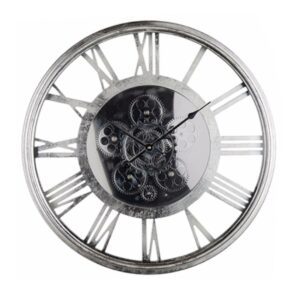 Minimalist Sleek Clock, Metallic Gray- Saltoro Sherpi Minimalism meets sleek style in this wall clock. Lending a subtle shine with its metallic body and reflective dial, it creates a beautiful play with Roman numerical, exposed mechanical gear and simple hands. Make it a part of contemporary decor that matches its style. The piece unassumingly sits on any light colored wall. Specifications: Designed in Sleek Style It has a Subtle Shine Exposed Mechanical Gear