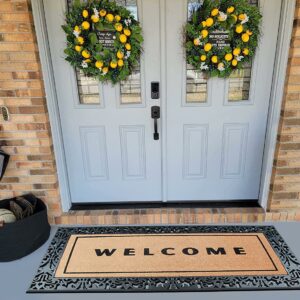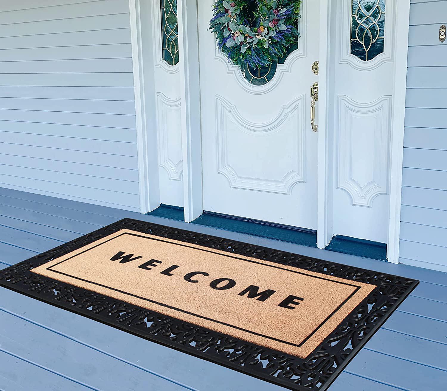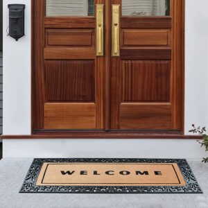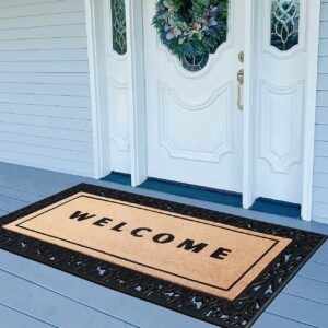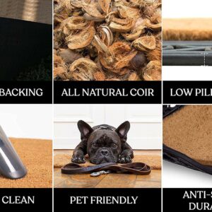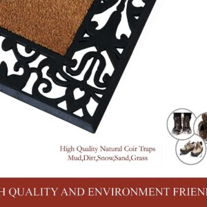 – SUPER TOUGH DOOR MAT: constructed with thick coir bristles on the topside molded with rubber base, the doormat is built tough by nature; its strong bristles create a wiping area and the rubber base adds to the sturdiness. This premium outdoor rug will help stop dirt, debris, moisture and other particles from being tracked into your home and will last at least 3 times longer than regular door mats.