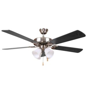 The AA Warehousing HARLI 52 in. Indoor Ceiling Fan with Light – Brushed Nickel showcases a traditional design with a robust metal and wood construction. This ceiling fan features a contemporary, brushed nickel finish that’s accented by rich, black blades. It offers double pull-cords, 3-speed action, and a reversible motor, allowing you to achieve your perfect level of air flow.