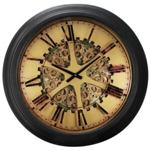 - Large Roman numerals, an antiqued face and black hands an image of gears in the center
