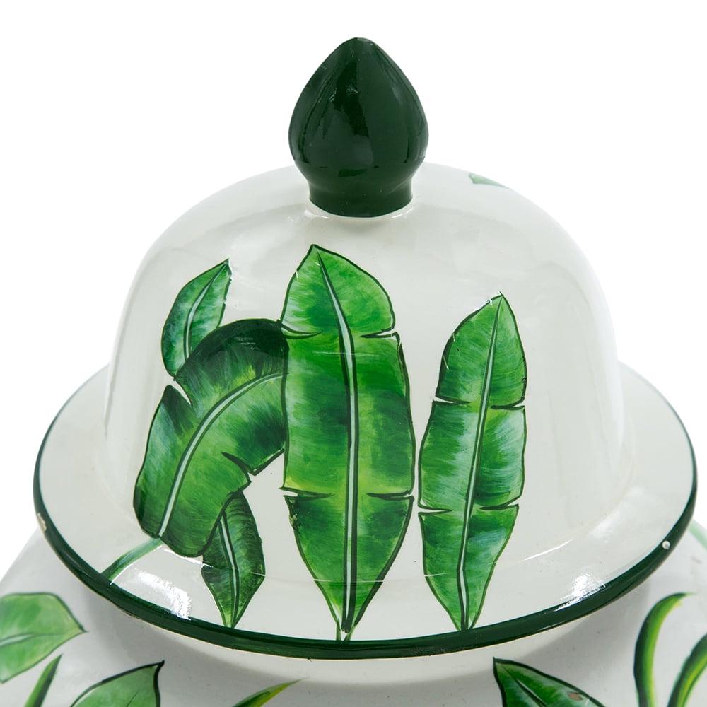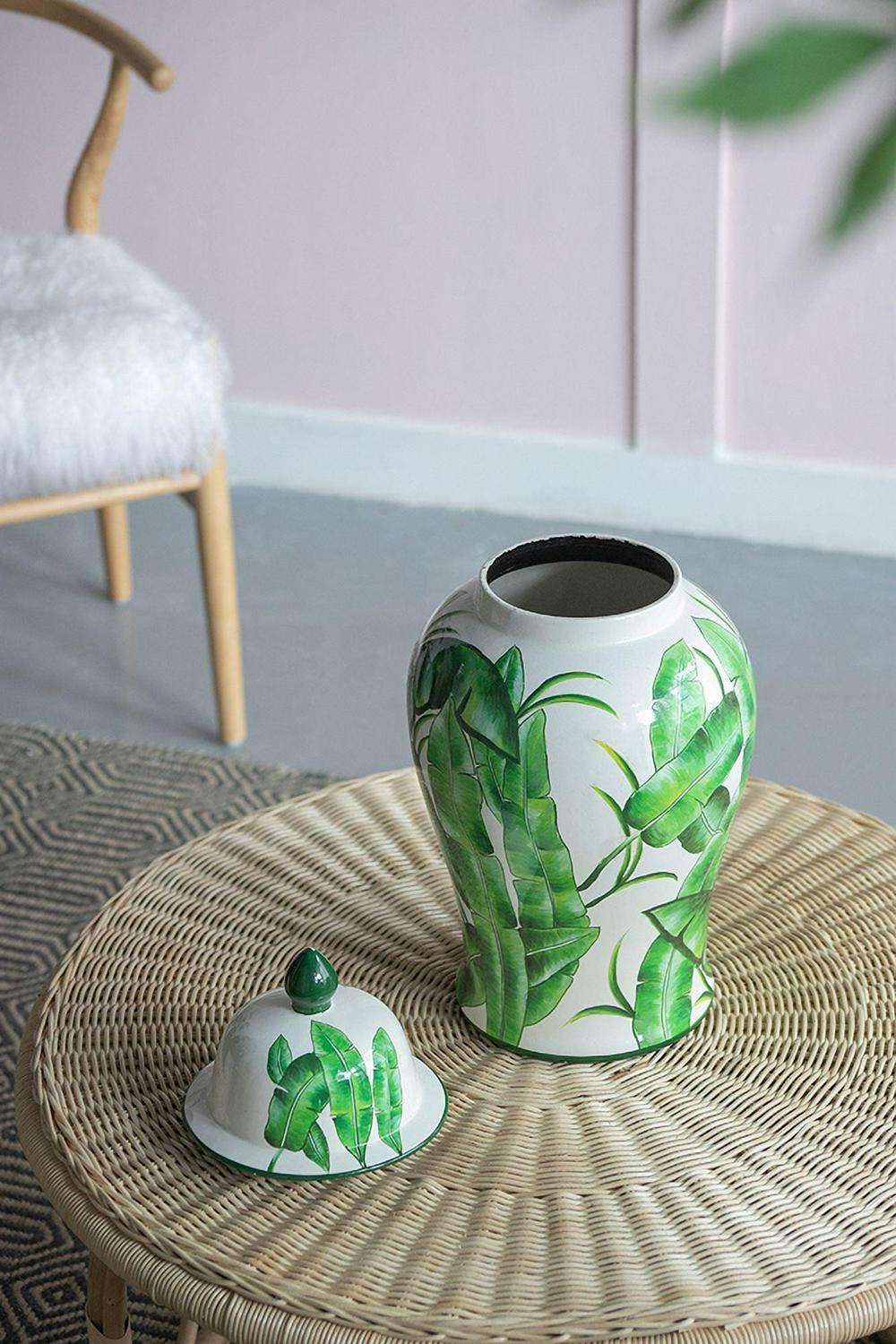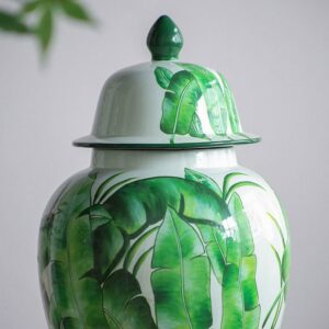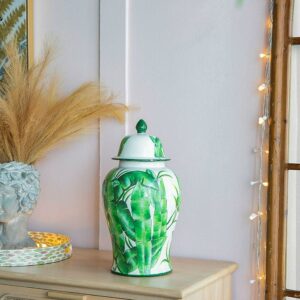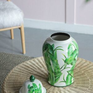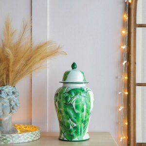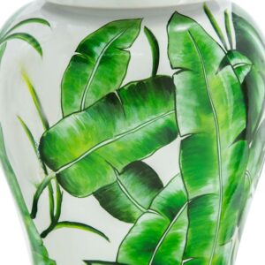 Delightfully bring in a touch of sophistication into your home and office with the addition of our Green and White Porcelain Temple Jar from A&B Home. Outlined with a tall and round profile, this product is finely crafted from porcelain, and measures 9.4″ in diameter and 18.1″ in height, including the lid. The marvelous green leaves are beautifully featured on white background, which complements the astonishing gloss of the porcelain with vibrancy and tropical charm. Effectively setting it up onto your tabletop with trays, bowls, vases, planters, and other decorative objects will pleasantly elevate your interior design by giving it a cohesive look. Proudly display this jar as your accent piece on your coffee tables in your living room, the console table of the hallway, or any space that needs an adornment.