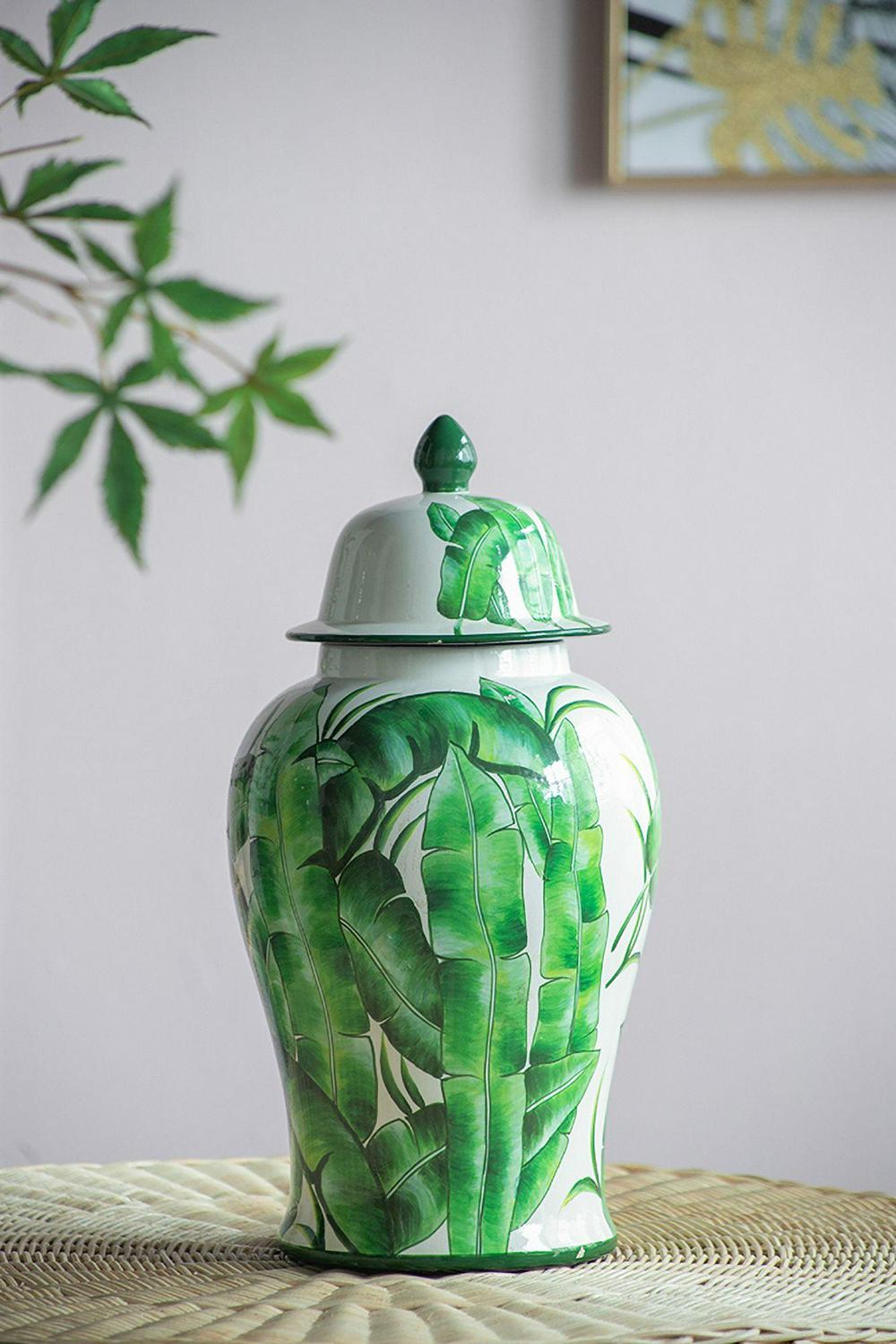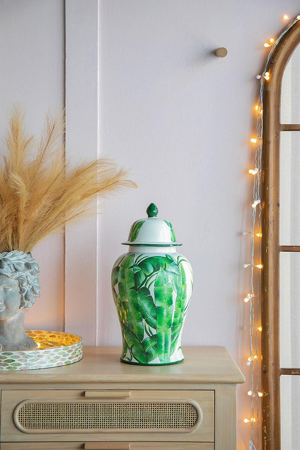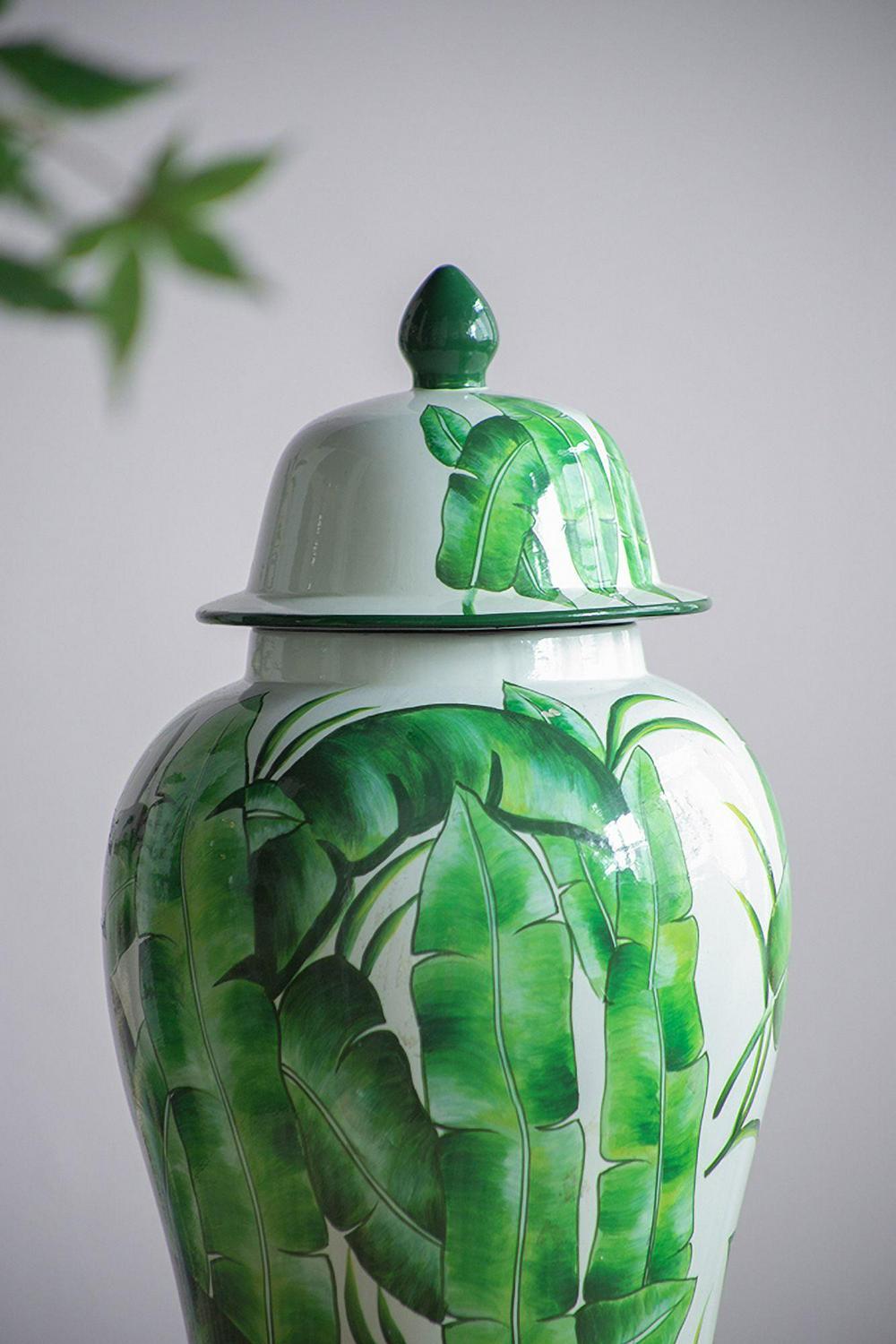 Delightfully bring in a touch of sophistication into your home and office with the addition of our Green and White Porcelain Temple Jar from A&B Home. Outlined with a tall and round profile, this product is finely crafted from porcelain, and measures 9.4″ in diameter and 18.1″ in height, including the lid. The marvelous green leaves are beautifully featured on white background, which complements the astonishing gloss of the porcelain with vibrancy and tropical charm. Effectively setting it up onto your tabletop with trays, bowls, vases, planters, and other decorative objects will pleasantly elevate your interior design by giving it a cohesive look. Proudly display this jar as your accent piece on your coffee tables in your living room, the console table of the hallway, or any space that needs an adornment.