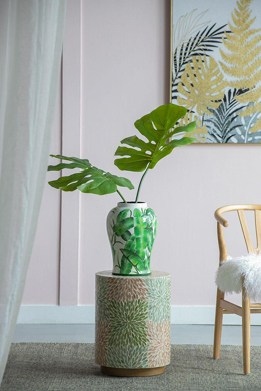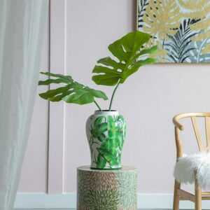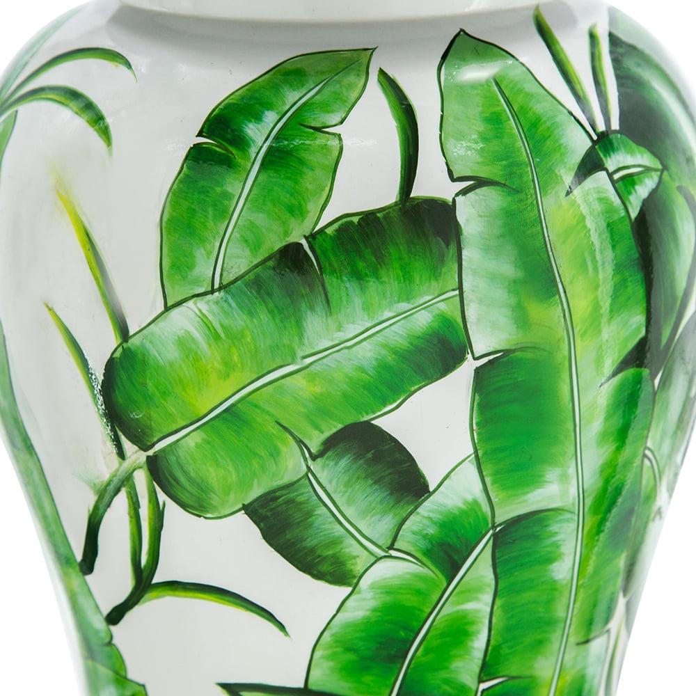 - Finely crafted with porcelain and featured with tropical leaves