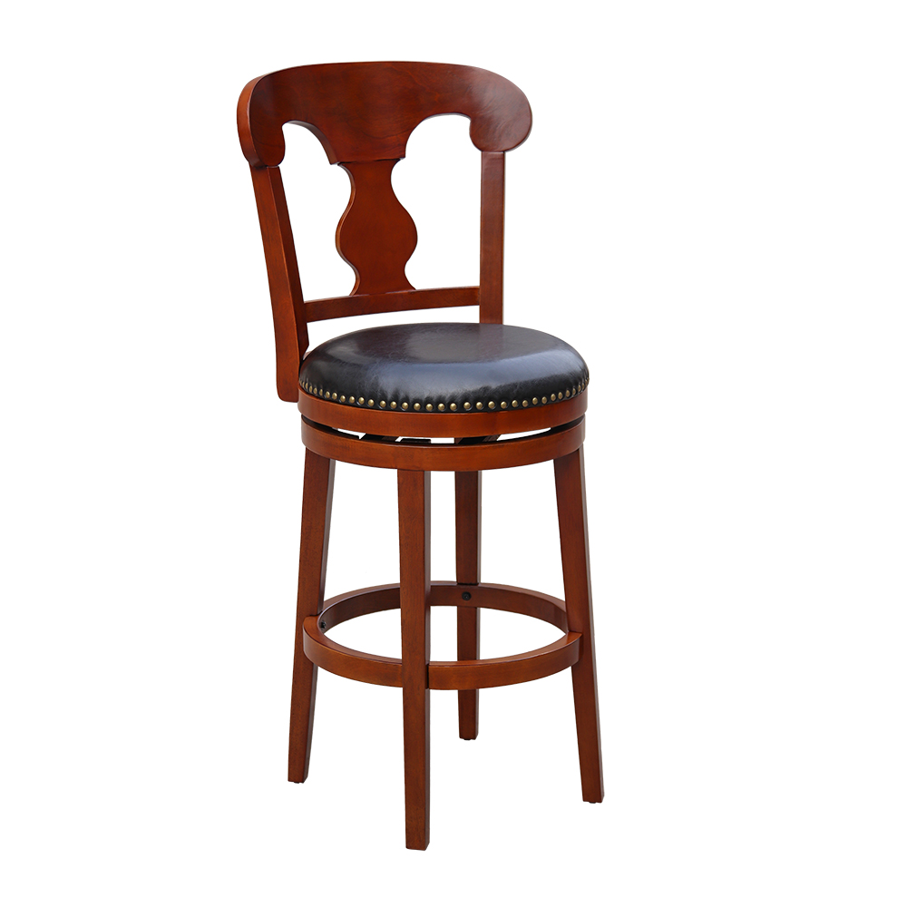 Swivel range: 360 degrees The frame of this bar stool is crafted from a blend of solid wood and engineered wood with natural wood knots. It features a full back, built-in footrest, nailhead trim, and a swivel capability. Seat Height: 30″ Upholstered with dark brown faux leather in walnut color wood finish, round seat for most comfortable seating experience. Natural wood grain color variation. Adult assembly required.