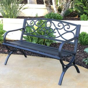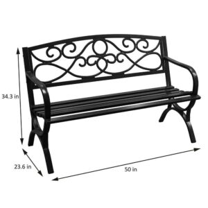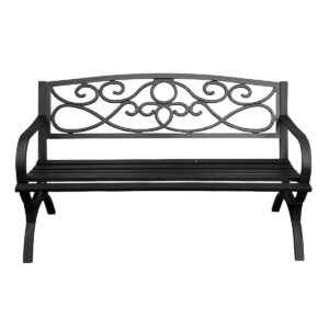 Enjoy the outdoors by lounging on this garden bench made from durable steel. A unique backrest design distinguishes this bench from the rest, while armrests, slatted seating. A black finish make it comfortable and attractive.