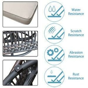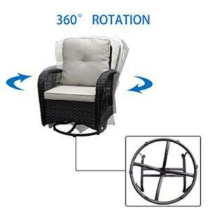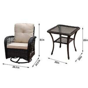 Material – Made of strong steel frame with powder coated and light brown resin wicker. It is durable enough to withstand rain and wind for long time using. Featuring sturdy construction and durable rattan, this can withstand the test of time and high temperature. Contents – 2 Chairs, 1 Table , Soft Cushions, Complete installation tools and installation instruction. Design – Molded rattan design is more durable than woven rattan, and will not warp, dent, rust or peel. 5-mm thick tempered glass table top fixed on the frame. Swivel and 360 degree rotation mechanism offers most comfort. Quick Assembly – Partial Assembly. Ready to assemble with detailed assembly instructions included, and easy to rearrange thanks to it’s lightweight design. Perfectly use for Patio, Backyard, Porch, Garden, Poolside,Balcony.