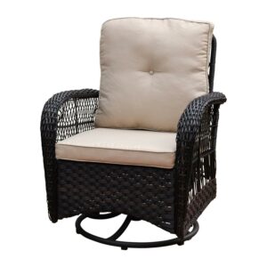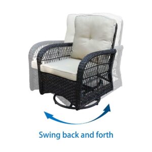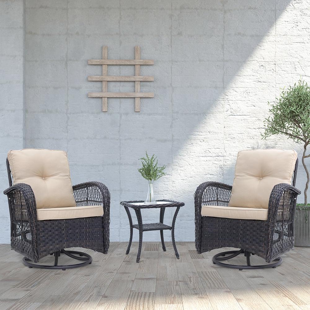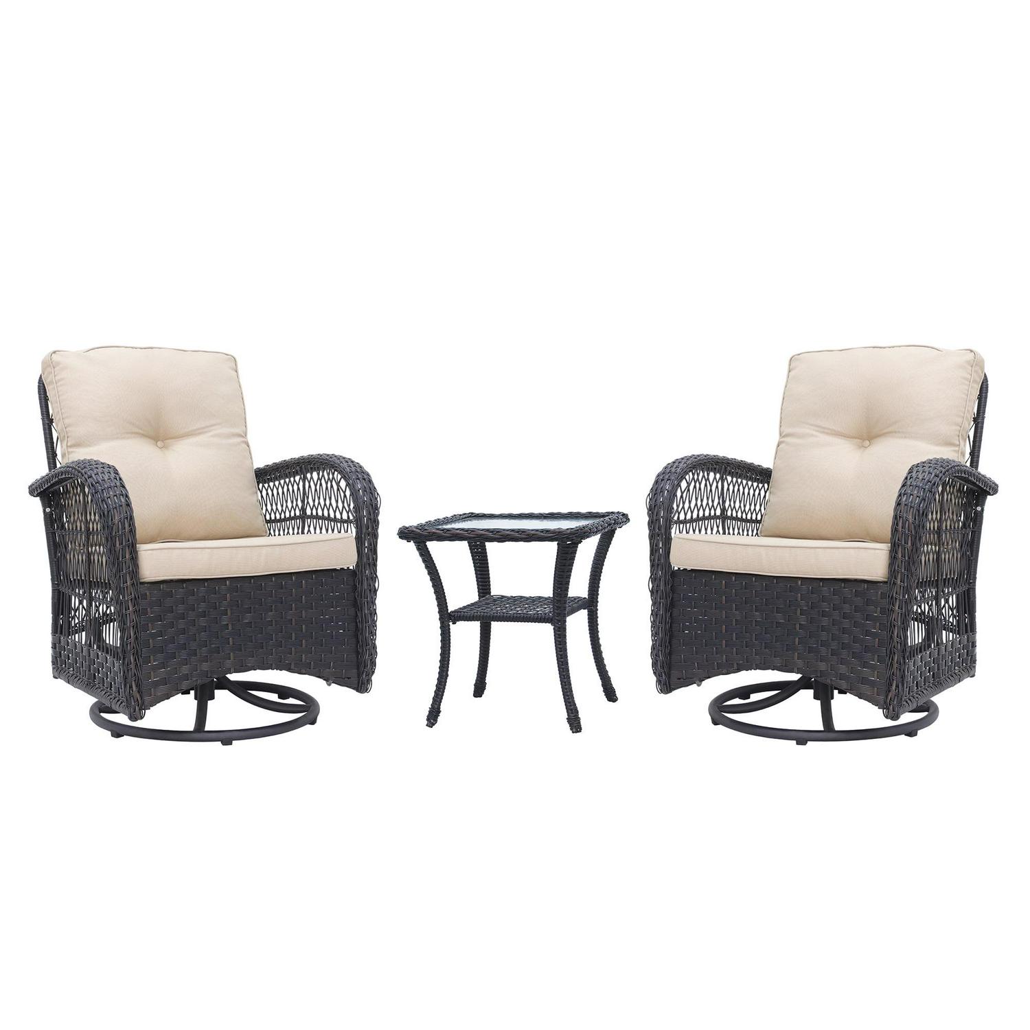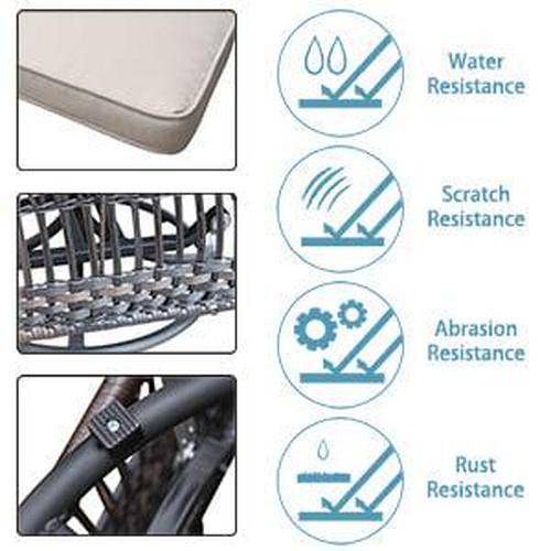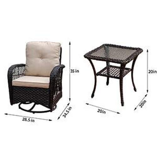 This lovely wicker conversation set features 2 big sized 360 swivel chairs, made of sturdy steel frame and handwoven weather-resistant wicker. Spacious deep seat with 6 in. thick comfortable cushions will relax you in a whole Summer season. 20 in. the square table is the good size for outdoor use, include a pattern weaving shelf and tempered glass top. Whether you are enjoying a cup of coffee alone on the front porch or indulging yourself with families or friends in an evening drink on your back terrace, you will do so in comfort and style. The beautiful decorative weave with natural highlights is perfect what your need for setting up your outdoor living space. You will surely enjoy it for many years. Weather-resistant qualities keep it lasting Durable, powder-coated steel frame Includes mildew-resistant cushions for lasting outdoor use Classic wicker construction fits in with a variety of decor styles Comfortable rocking function The rust-resistant steel frame offers durable support Special Design: 360-degree swivel performing chairs with gentle rocking ability. The outdoor sofa set features a generous, extra deep seat, creating superior comfort. A 360-degree full motion sofa gives you an enjoyable and cozy feeling.