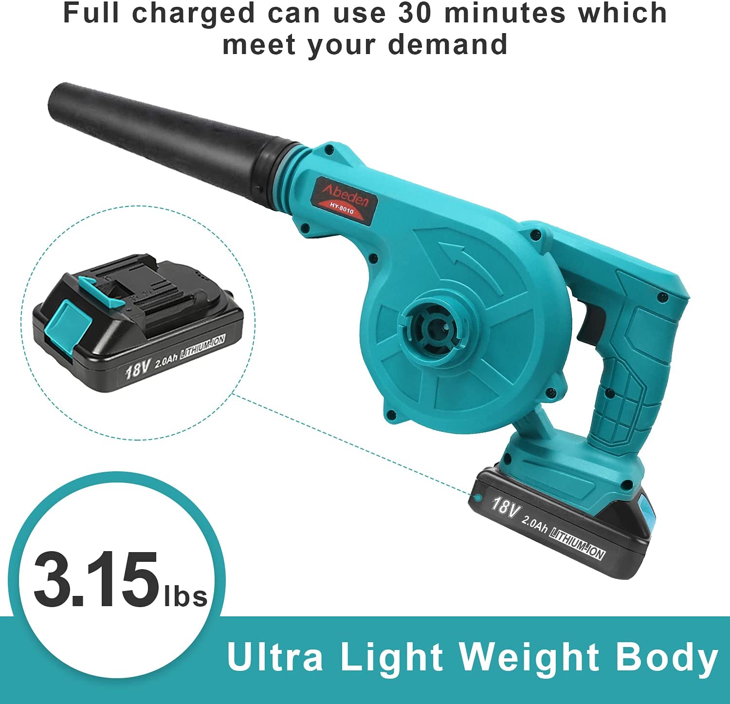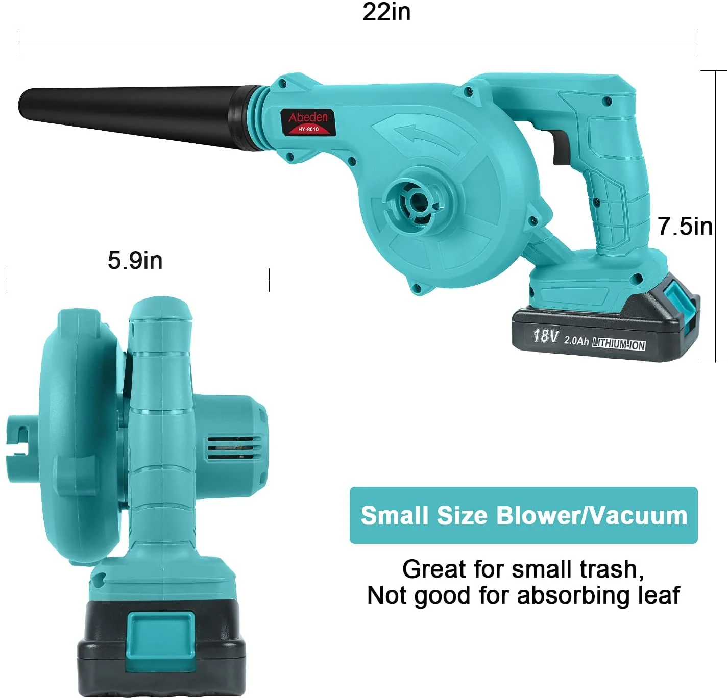 Abeden 2-in-1 Cordless Handheld Leaf Blower/Vacuum, Equip with boost turbofans & all-copper motor which provide up to 18000rpm strong power. It’s air volume can reach 2.8m³/min. You can press the trigger switch to adjust the air volume you want. The blower weights 3.15 lbs only,which make it effortless to use for a long time. 2 in 1 design not only helps you to clean the garden of fallen leaves and snow,but also can clean the corner and gap which is hard to clean. Perfect for the courtyard,garage,the car inside and engine compartment,etc. Cordless design allows you to clean up anywhere you want. PRODUCT SPECIFICATIONS: Brand: Abeden Color: Blue Power:600W Weight:3.15lbs/1.43KG Air Volume:0-2.8m³/min No-load Speed:0-18000rpm Attached Battery:18V 2.0Ah Lithium Battery Full-charging Time:2.5 hours Battery Working Time:About 30 minutes Compatible Battery:Makita 18V Batteries Special Feature: Suction + Air blowing 2-in-1 Scope of use: Blowing Leaf,Cleaning Dust,Small Trash,Car,Computer Host… WHAT’S IN THE BOX? 1*Bare Tool 1*Blow Tube 1*Fast Charger 1*18V 2.0Ah Lithium Battery 2*Reusable Collection Bag 1*User Manual 1*Canvas Carrying Bag