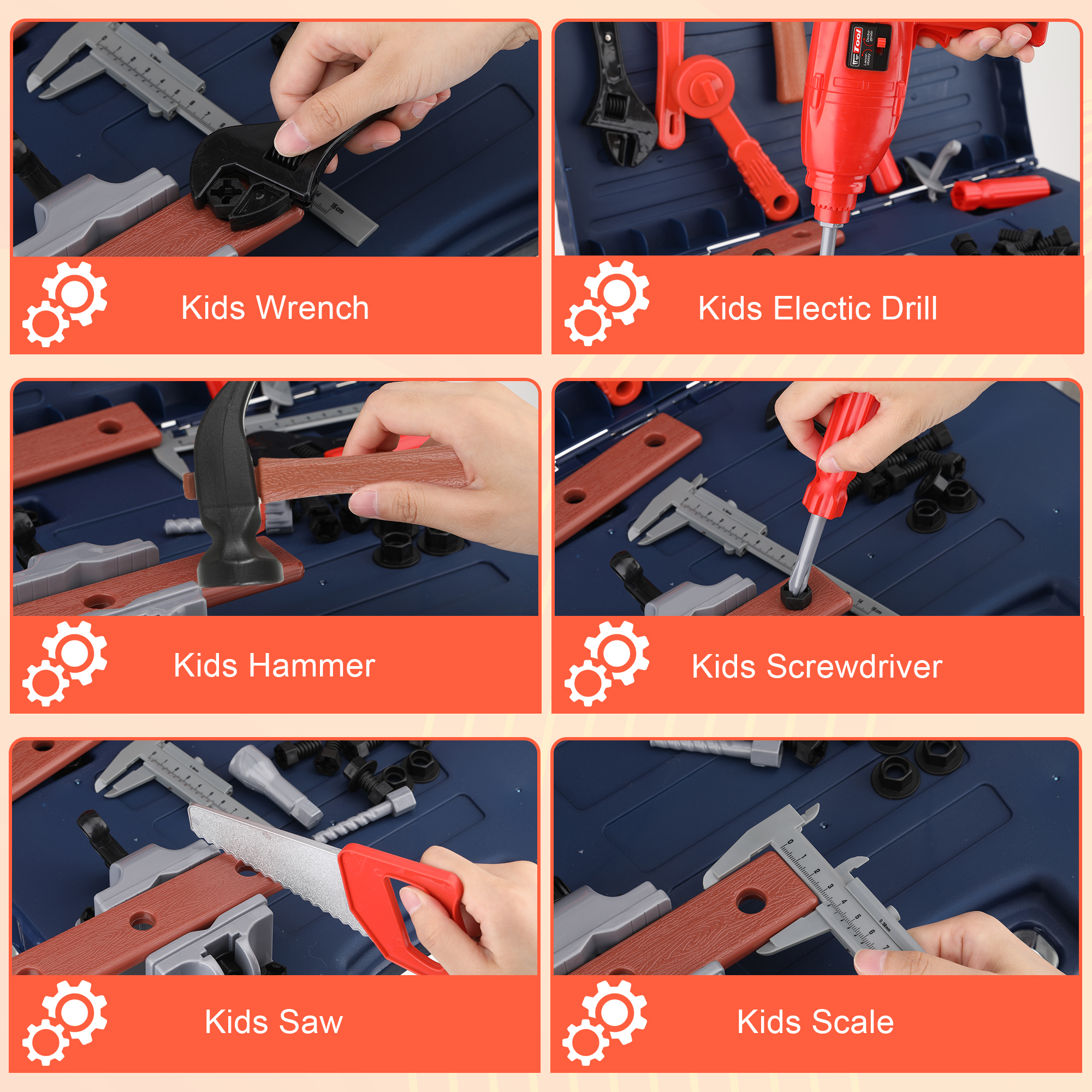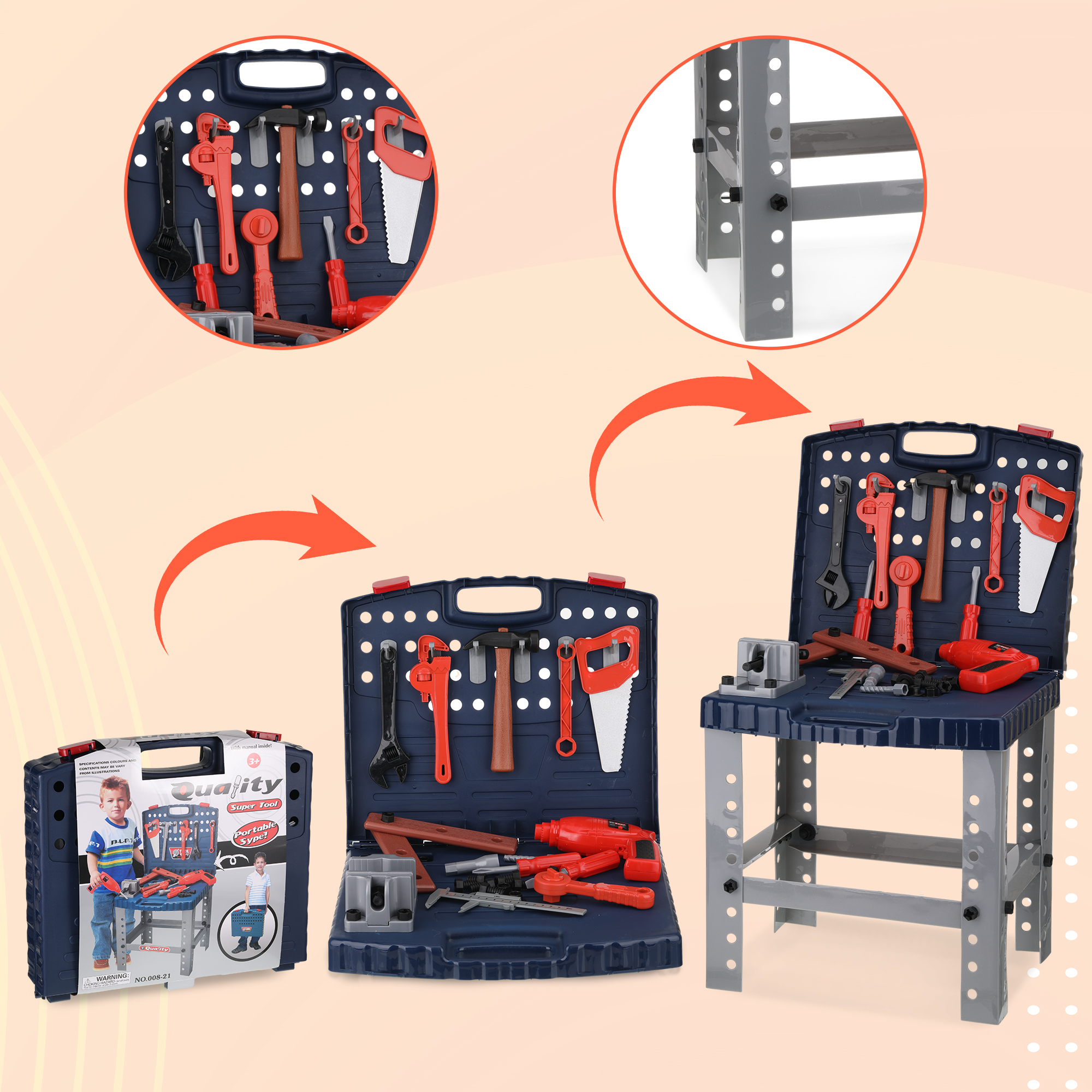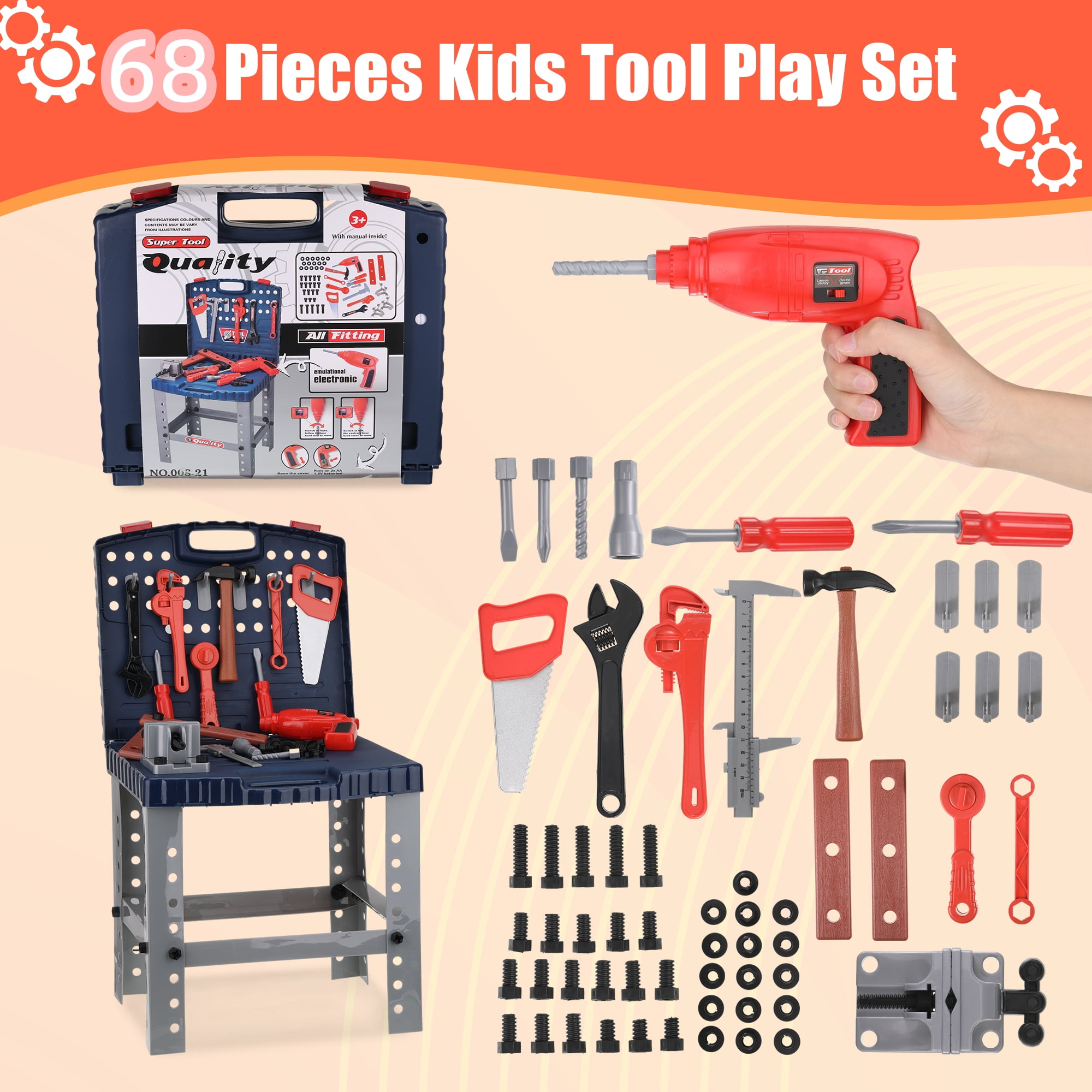 Description: SAFE: This foldable tool bench is designed for children, made with ABS that is non-toxic and hypoallergenic, ensuring a safe playtime experience. VARIETY FOR INSPIRATION: With 68 pieces, this tool box toy offers a wide range of options for children’s exploring and learn, promoting eye-h