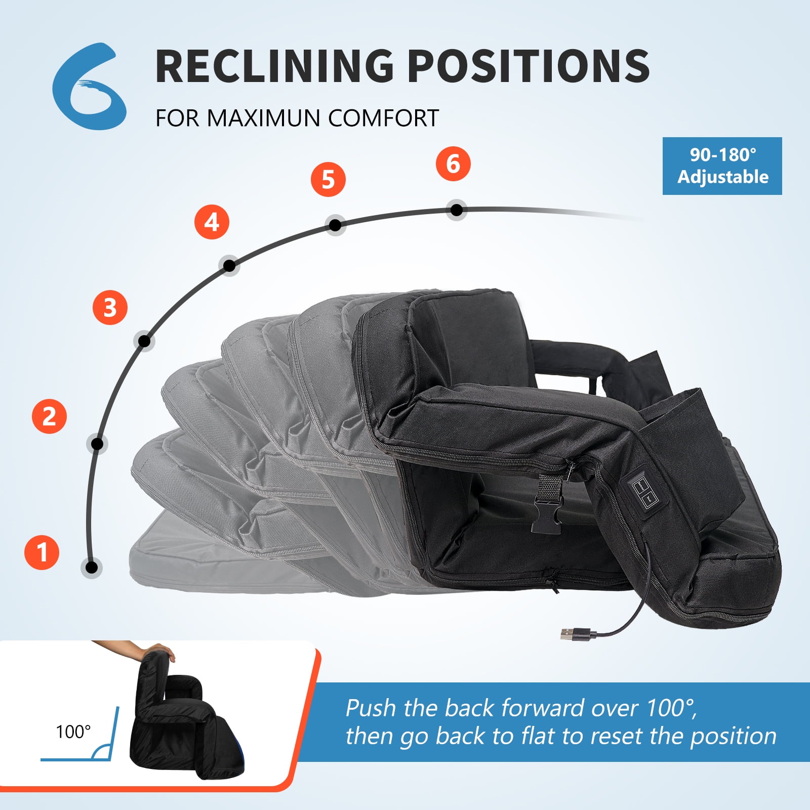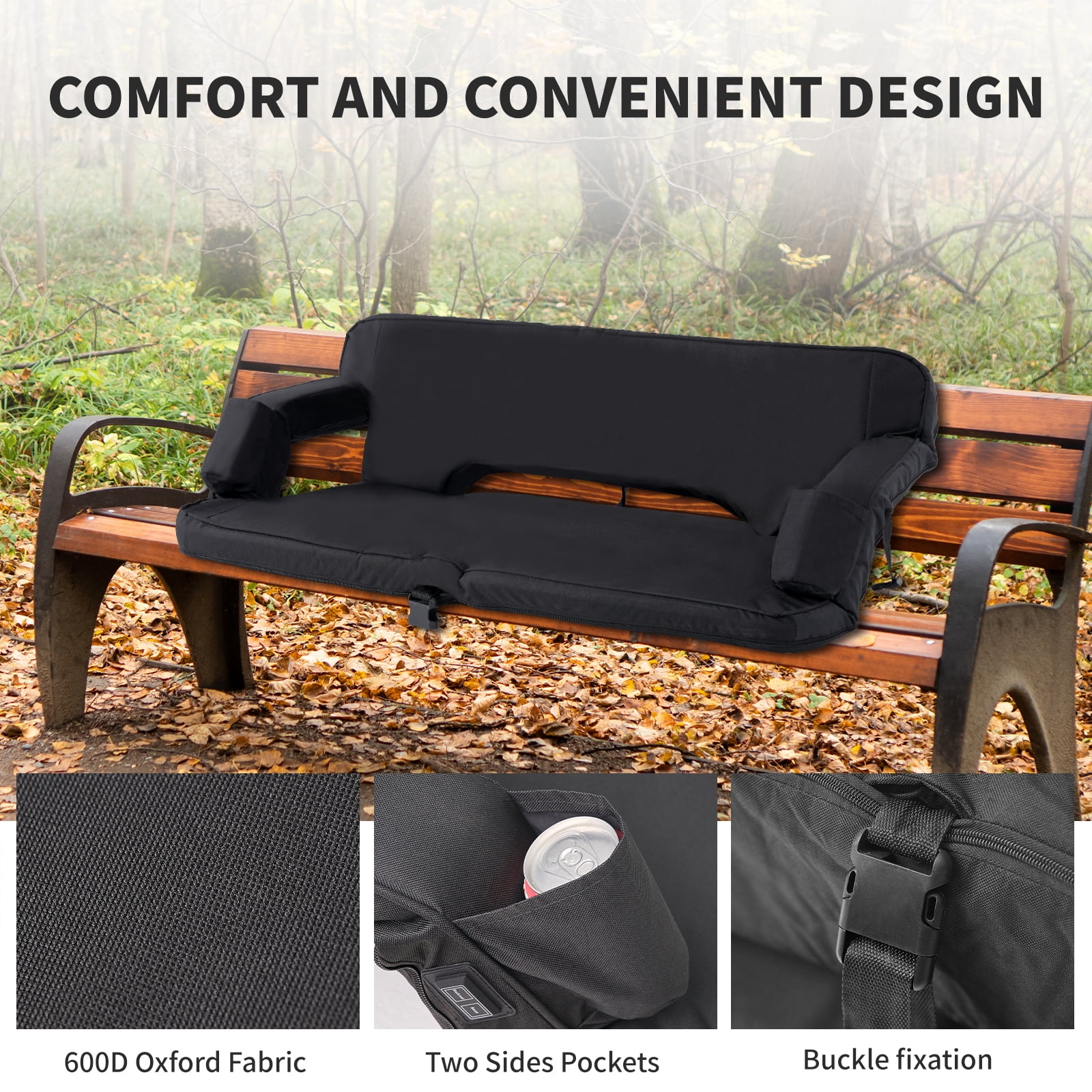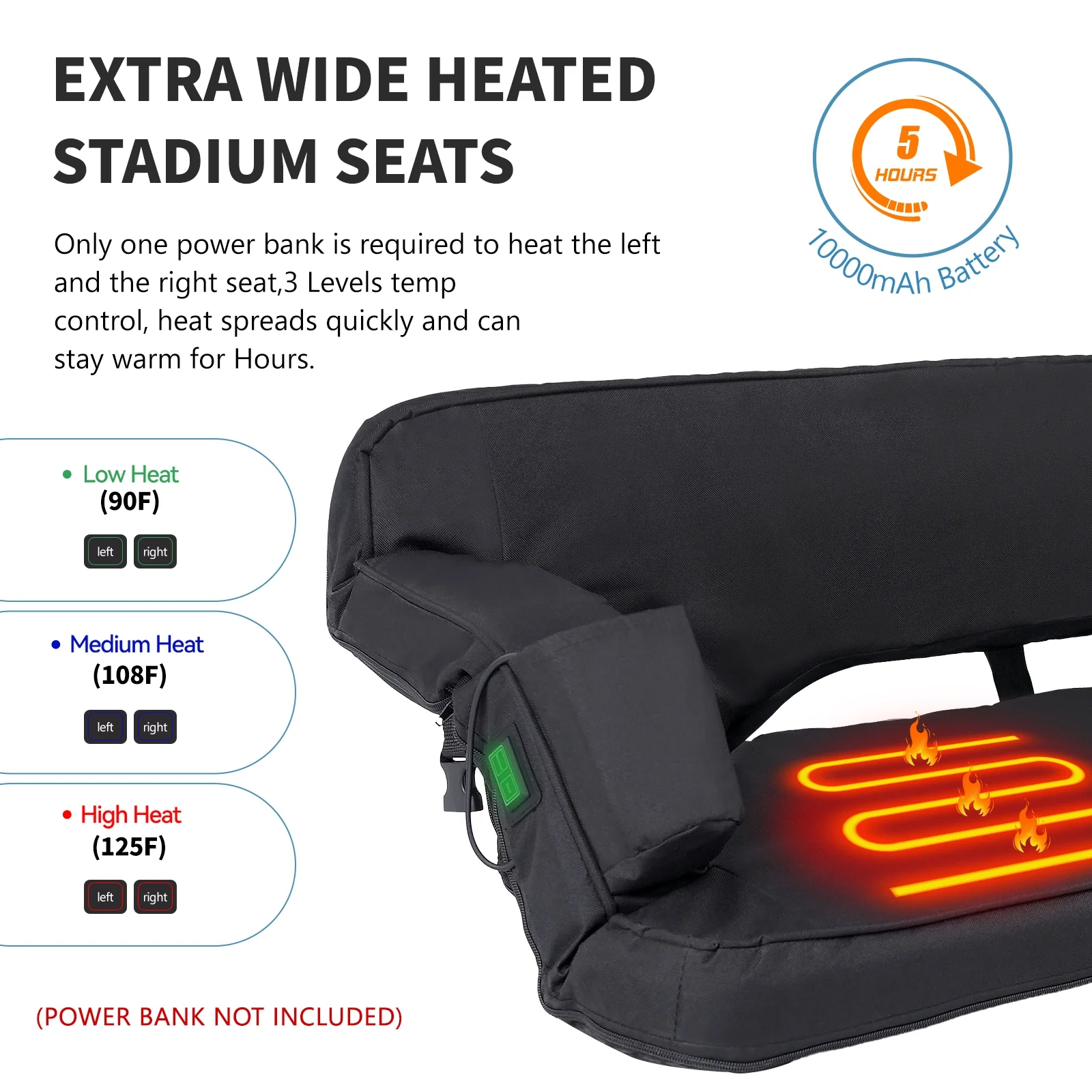 【Heated Stadium Seat for Bleachers】The heated stadium seat is made of high-quality 600D/420D Oxford cloth fabric, high-density foam filling, and steel tube, has a waterproof and non-slip bottom, so you can always enjoy dry, clean seats even in outdoor wet environments. You can safely keep warm and watch your favorite football, basketball, baseball games, or any sports, whether indoors or outdoors on stadium seat chair with reclining back and arm support and wide seat. 【Dual-Zone Independent Controlled Heating System】The stadium seat is divided into 3 heating modes, high/medium/low, the max temperature can be heated up to 125°F. There are two buttons on the right armrest to control two seat cushion heating respectively, one cable only needs 1 power bank to heat two cushion. (POWER NOT INCLUDED) 【Oversized Double Bleacher Chair for Couple】The extra-large stadium seat is designed to comfortably accommodate two people simultaneously. Experience optimal comfort with padded cushions and a supportive backrest. 37″ width with armrests up, 44.5″ width with armrests down. The extra-large seat offers a plush and relaxing surface for both individuals, enhancing the overall enjoyment of sporting events, concerts, and more. 【6 Reclining Positions】The stadium seat can be adjusted to 6 different positions, from upright to flat, making it easy to find the most comfortable posture and avoid back, neck, shoulder and waist pain. 【Convenient Heated Stadium Seat】The heated bleacher chair has 2 side pockets. You can conveniently store your personal items, such as phones, snacks, coin purse, glasses, free your hands with snacks while enjoy the game. At the same time, the specially designed cup holder of the recliner chair can prevent your drink from spilling. When you don’t use these pockets, it can be hidden under the zipper without affecting the beauty of your heated sports seat. 【Folding Bleacher Seat】The heated chair is lightweight and easy to carry with the foldable design, it is designed with backpack straps and fixing straps. You can fix the seat on the bench quickly without worrying about it moving. You can carry this heated camping chair conveniently to stadiums, parks, beaches, etc. wherever you want to go, perfect to use at sporting events, outdoor camping, boating, concerts, or even just for extra seating at home.