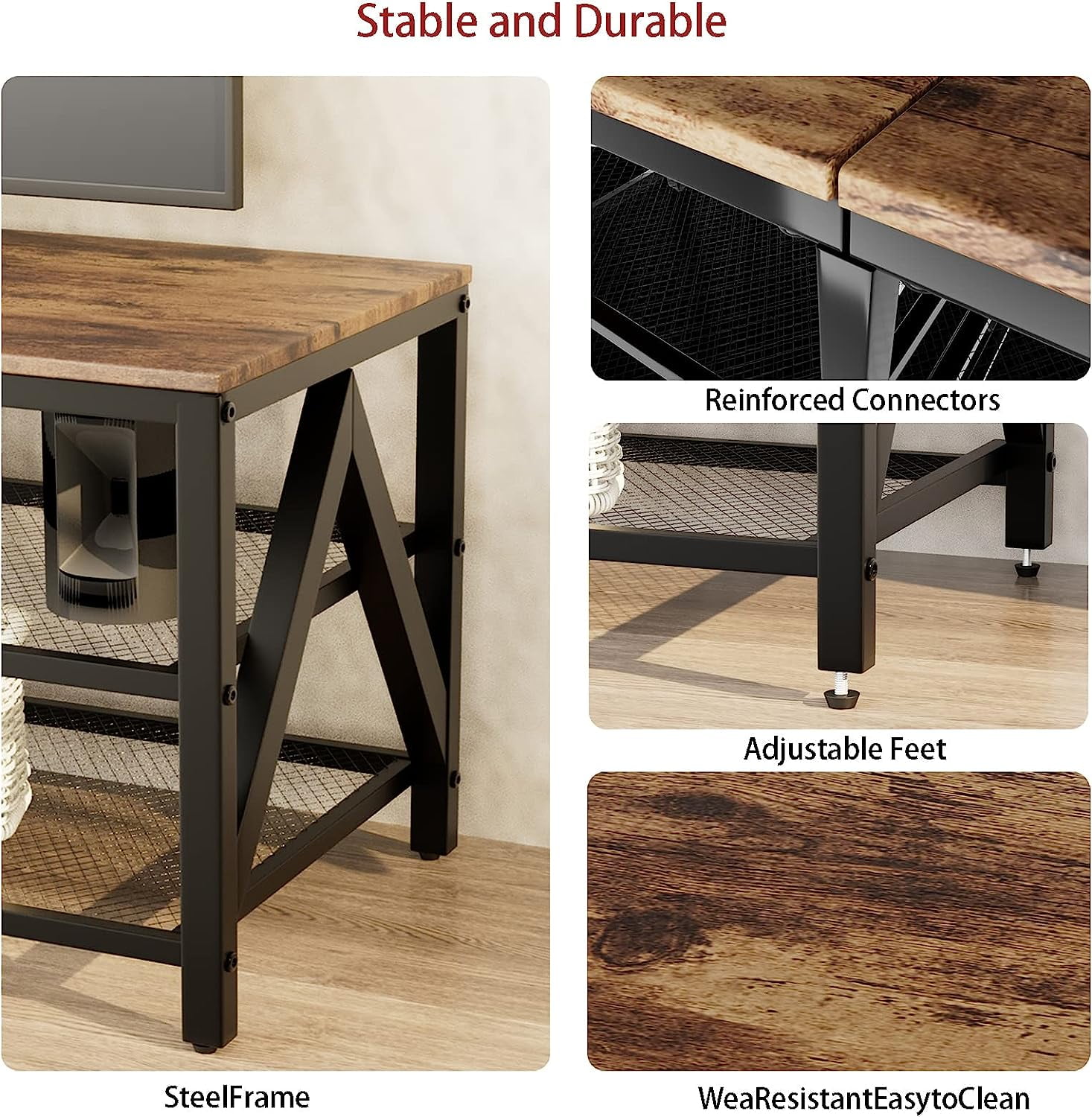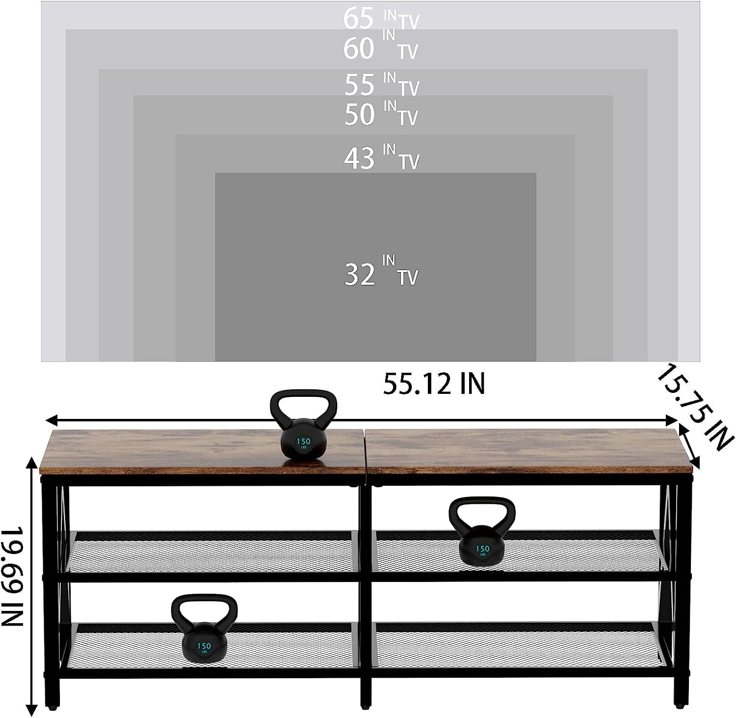 The size of the TV stand is (55.12 x 15.75 x 19.69)” /140 x 40 x 50 (L x W x H) cm. Suitable for TVs from 32-65 inches. And the weight capacity is 150 pounds. Two levels of storage open space can place more items, and the grid design helps to ventilate and dissipate heat from overheated electronics such as cases and stereos. The single-tier height is 9.85″ in, so you don’t have to worry about overheating in tight spaces The inverted V-shaped tripod structure on the side makes the TV table more sturdy stable, and more special. The table legs have height-adjustable feet, which make you have no worries about scratching the floor as well as can cope with a variety of floor conditions The retro TV cabinet is suitable for many scenes, not limited to TV shelf cabinets. It can also be a good decorative piece for your room. The wood texture is suitable for a variety of styles of furniture to match, so you can’t go wrong choosing it The TV stand is easy to assemble, the instructions are easy to understand, and the parts packages are paired one by one, as well as more of the same parts, in order to deal with the missing situation can be assembled in a timely manner, we do not have assembly worries, a single person can also be installed successfully, the fastest in about 15 minutes you can get a nice TV stand it! Specifications: Color: Rustic Brown & Black Material: Steel Frame & Premium MDF Board Overall Size: 55.12″ L x 15.75″ W x 19.69″ H (140 x 40 x 50 cm) The single-tier height: Is 9.85″ in Max Weight Capacity: 150 lbs