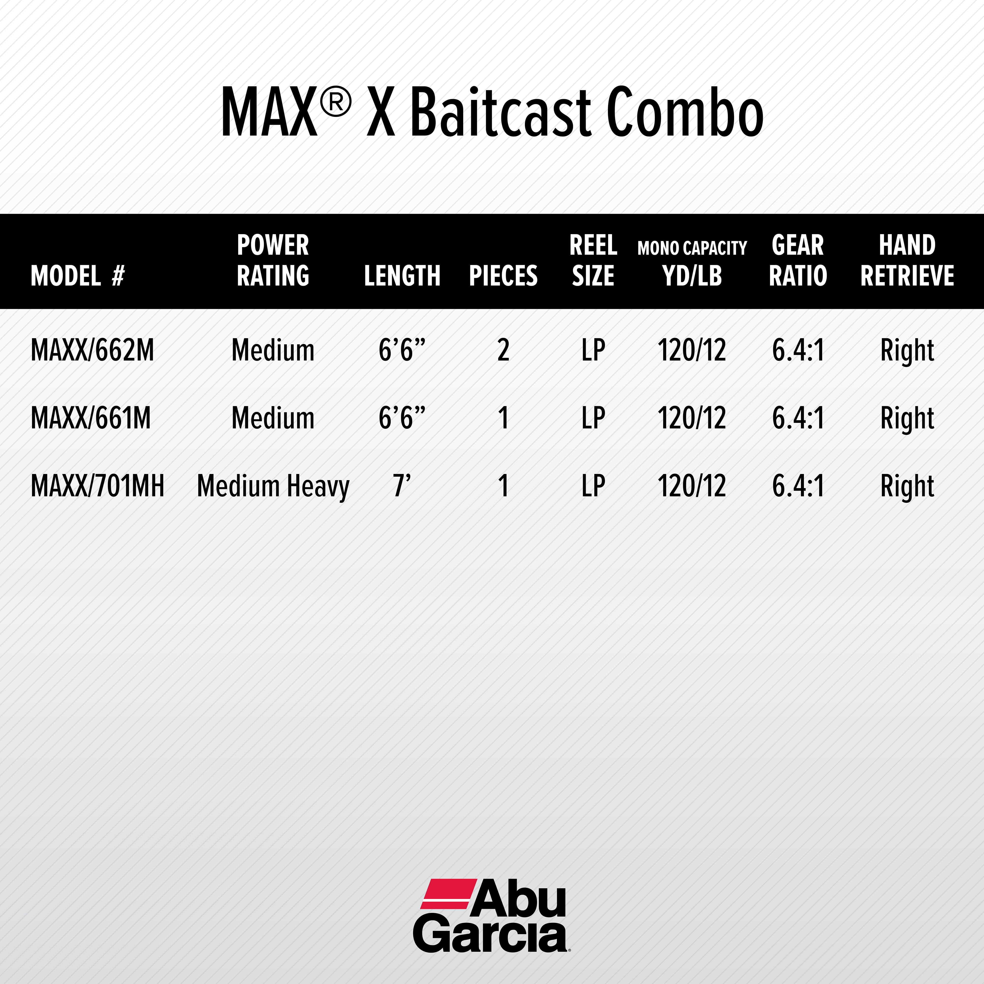 ABU GARCIA MAX X 6’6” FISHING ROD AND REEL BAITCAST COMBO: The aluminum handle with soft-touch handle knobs gives you all-day comfort. SUPERIOR CONSTRUCTION: Lightweight and durable, graphite frame and sideplates with a machined aluminum spool. 1 piece, 24-ton graphite rod for a lightweight design and increased sensitivity. RECOVERY RATE: Recover 25” | 64cm of line for every turn of the crank. Gear ratio of 6.4:1. SYNTHETIC STAR DRAG DRAG: Max: 15lb | 6.8kg. Mono Capacity yd/lb: 150/10 120/12 85/17. Braid Capacity 155/20 120/30 80/50. 5 TOTAL BEARINGS: 4 stainless steel ball bearings plus 1 instant anti-reverse bearing provides smooth operation for any fishing experience. 8-15LB LINE RATING, MEDIUM POWER: The Max X Baitcast Combo is up for the next challenge. Lure rating of 1/4-5/8. 8 DURABLE GUIDES: Stainless steel guides are built to withstand tough fights and rough treatment without fraying the line. ABU CUSTOM INTEGRATED REEL SEAT with molded polymer comfort grip paired with a Split handle made for Right handed anglers.