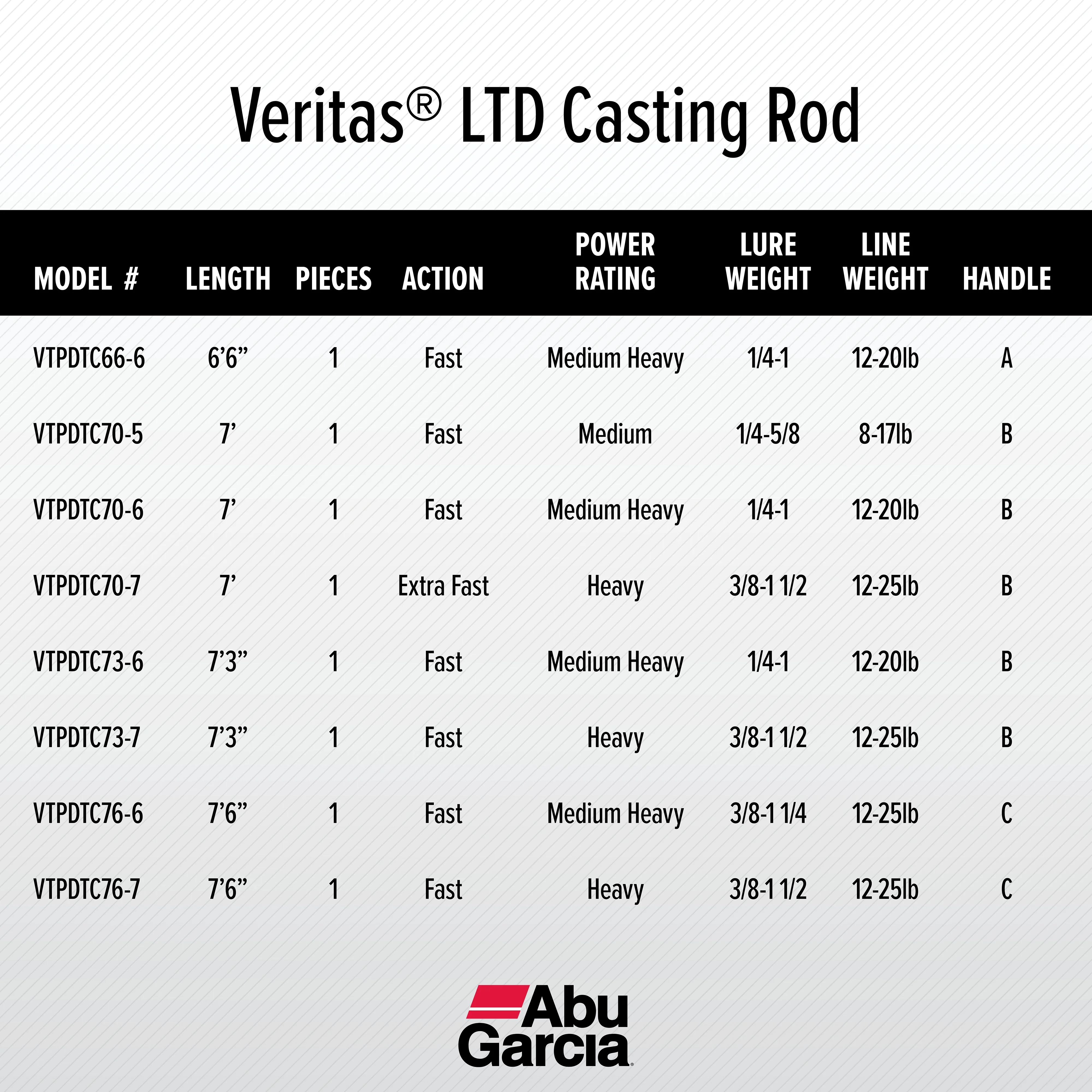 ABU GARCIA VERITAS LTD 7’3” CASTING ROD: A balanced and lightweight rod with Winn Advanced Polymer Dri-Tac Grips. 12-20LB LINE RATING, MEDIUM HEAVY POWER, FAST ACTION: The Veritas Casting Fishing Rod is up for the next challenge. Lure rating of 1/4-1 oz. GRAPHITE CONSTRUCTION featuring exclusive Powerlux 100 to deliver a 15% stronger* and 5% lighter** rod. Total weight is just 5.6 oz. *On average, based on controlled lab testing, compared to identically constructed Veritas rods without Powerlux resin. Results may vary. **On average, based on controlled lab setting, compared to prior generation Veritas rods without Powerlux resin. Results may vary. 10 TITANIUM ALLOY GUIDES: built with zirconium inserts to allow for a lightweight balanced rod. Also features ROCS (Robotically Optimized Casting System) guide train for maximized casting distance with lighter lures. ERGONOMIC CUSTOM REEL SEAT provides a dependable anchor point for the reel. WINN ADVANCED POLYMER DRI-TAC GRIPS: (type B) with a rubber rod butt delivers greater weather and wear resistance. 1 PIECE FISHING ROD: Designed for increased sensitivity. HOOK KEEPER: The Texas-rigged hook keeper will work with all bait applications. Rod comes with a 3-year limited warranty.