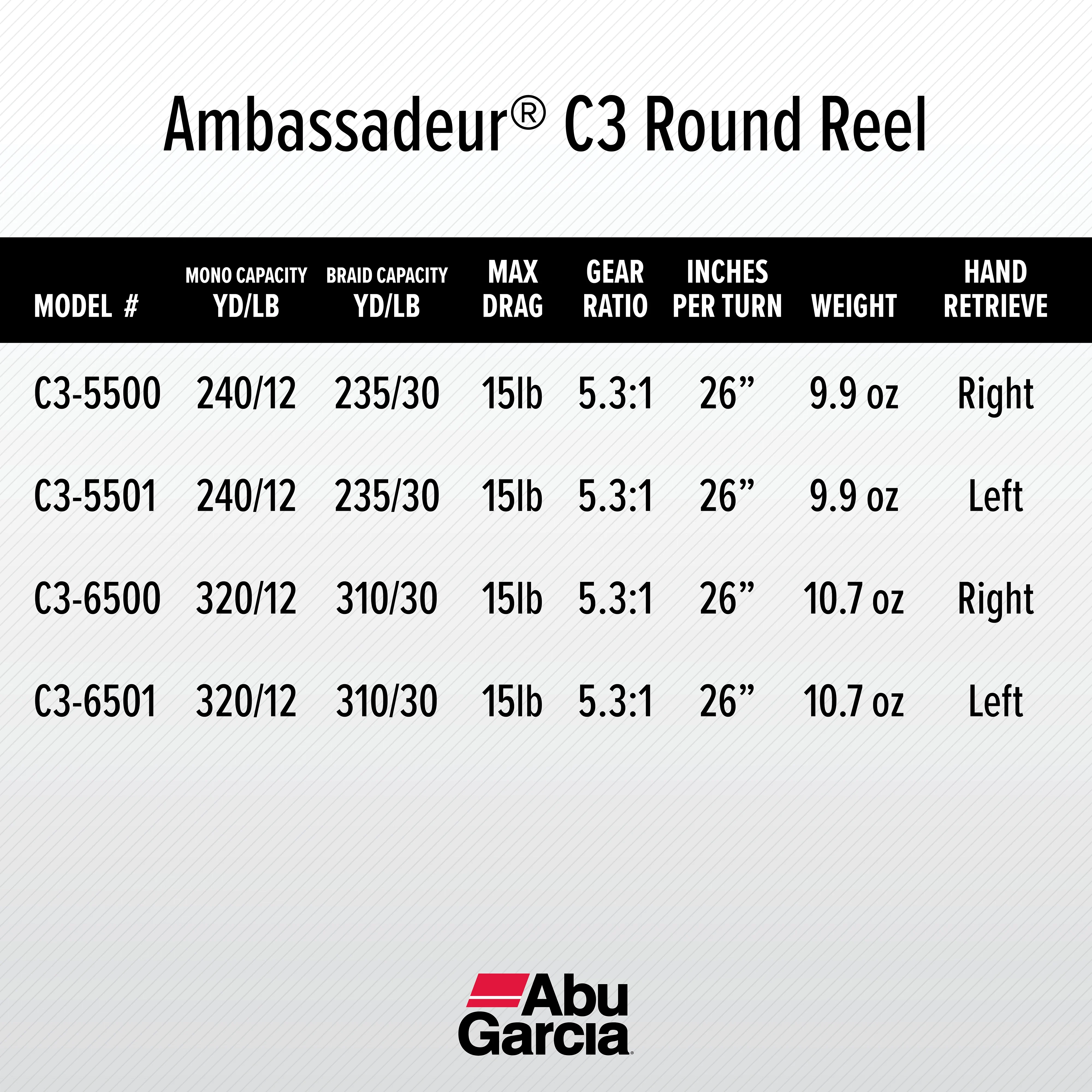 LIGHTWEIGHT CONSTRUCTION: The spool of the Abu Garcia Ambassadeur C3 Casting Reel is made from machined aluminum, which provides strength without adding excess weight. This Swedish made Casting reel is both durable and lightweight at 9.9 oz. RECOVERY RATE: Recover 26” | 66cm of line for every turn of the crank. Gear ratio of 5.3:1. SYNCHRONIZED LEVEL WIND SYSTEM: Provides even line lay and a smooth retrieve. DRAG SPECS: Carbon Fiber Star Drag, Max: 15lb | 6.8kg. The Carbon Matrix drag system provides smooth, consistent drag pressure across the entire drag range. LINE CAPACITY: Mono Capacity yd/lb: 240/12. Braid Capacity 235/30. RIGHT HANDLE POSITION: Versatile performance for all handedness. The ergonomically designed compact bent handle and star give you all-day comfort. 6 PIN CENTRIFUGAL BRAKE: Gives you consistent brake pressure throughout your cast. 4 TOTAL BEARINGS: 3 stainless steel ball bearings + 1 instant anti-reverse bearing provides smooth operation for any fishing experience.