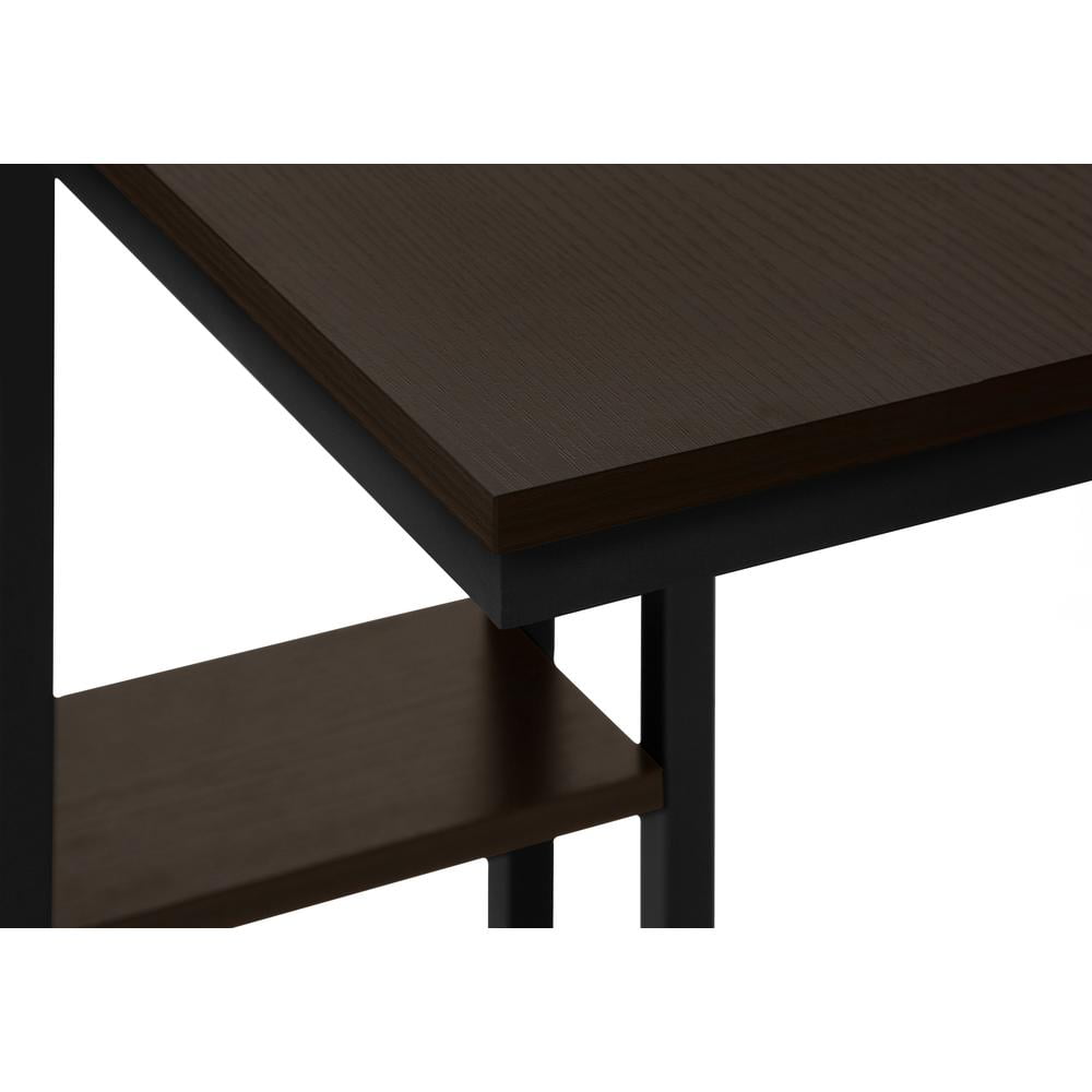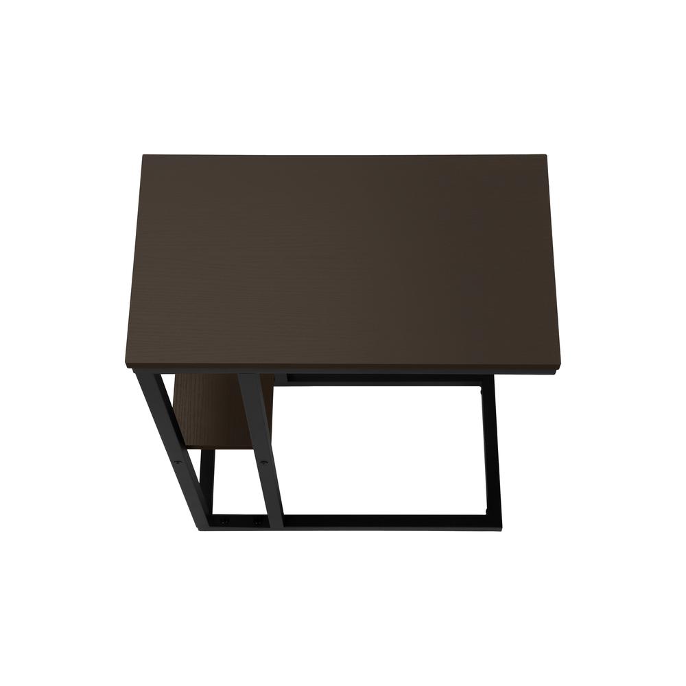 Straight lines and clean angles give this C-shaped accent table an elegantly modern look. The rectangular tabletop in a dark brown espresso finish is supported by a black metal frame with a secondary shelf underneath the table for convenient placement of smaller items. Slide this versatile end table under a sofa or chair to place snacks or mobile devices or use as a side table next to a bed. Features: Materials: Particle board, metal Finish: Espresso C-shaped accent table with a base that can be slid underneath sofas for convenience Features a dark brown espresso rectangular tabletop and a metal frame with a small secondary shelf Sturdy yet lightweight enough to be moved as needed Assembly required: Illustrated instructions and all hardware are provided for convenience (additional tools may be needed) Specifications: Product Dimensions: 25.25″H x 18.25″W x 10.25″D Product Weight: 9 lbs