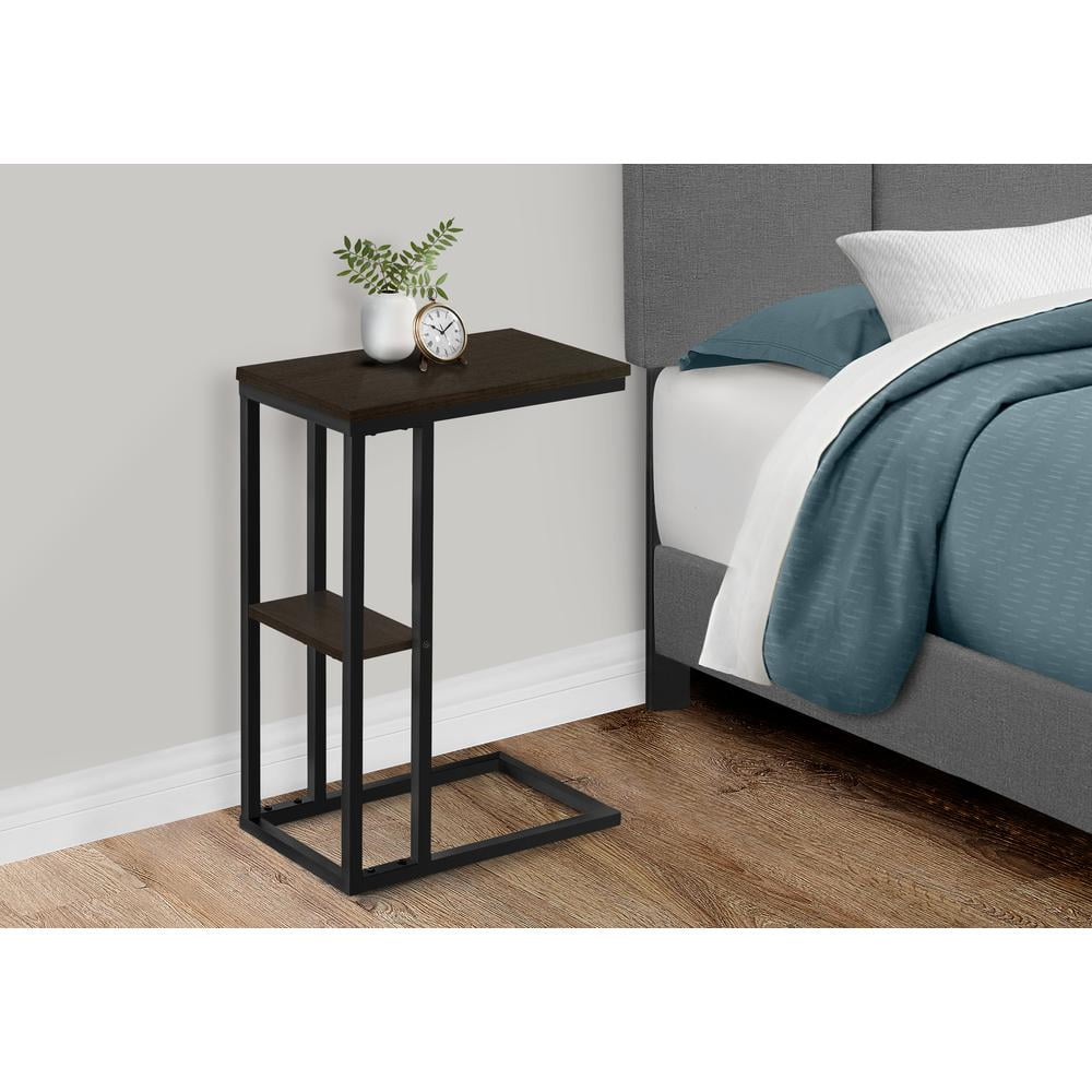 Product dimensions: 18.25 inches long x 10.25 inches wide x 25.25 inches high Materials: particle board,metal C-shaped accent table with a base that can be slid underneath sofas for convenience Features a dark brown espresso rectangular tabletop and a metal frame with a small secondary shelf Sturdy yet lightweight enough to be moved as needed Assembly required: illustrated instructions and all hardware are provided for convenience addit