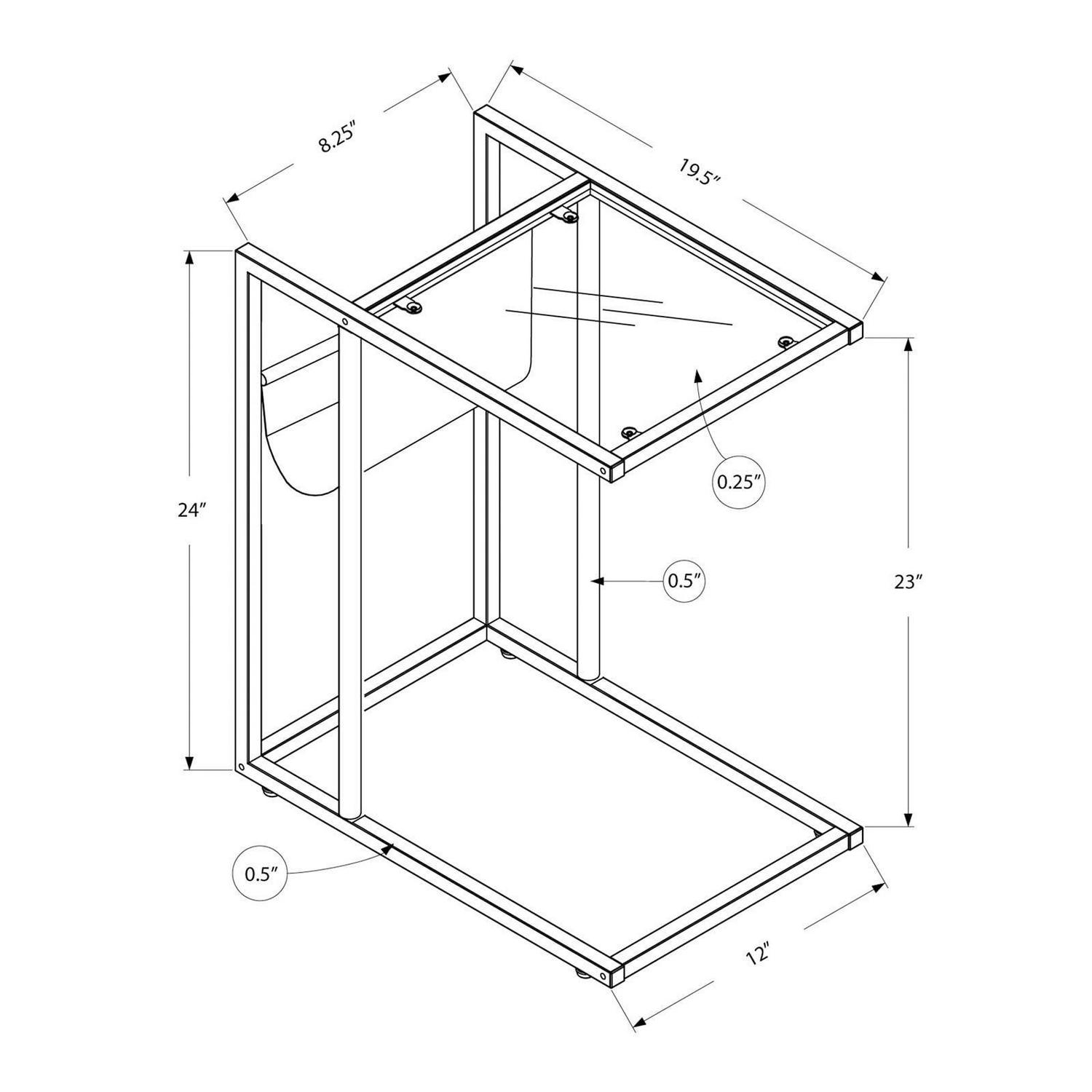 A versatile style for use as a sofa side table, accent table or end table Includes a practical leather look magazine holder in an easy-grab spot Sturdy chrome metal base holds everything together effortlessly; sits slightly off the ground to prevent damage to your floor Clear tempered glass table top is both stylish and easy to clean; handles your favorite flower pots or photo frames easily Product Dimensions: 12 Inch L x 20 Inch W x 24 Inch H
