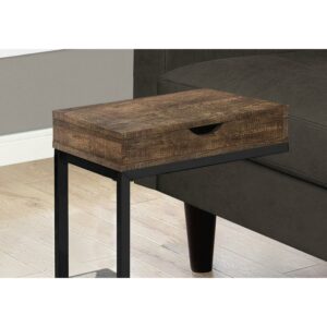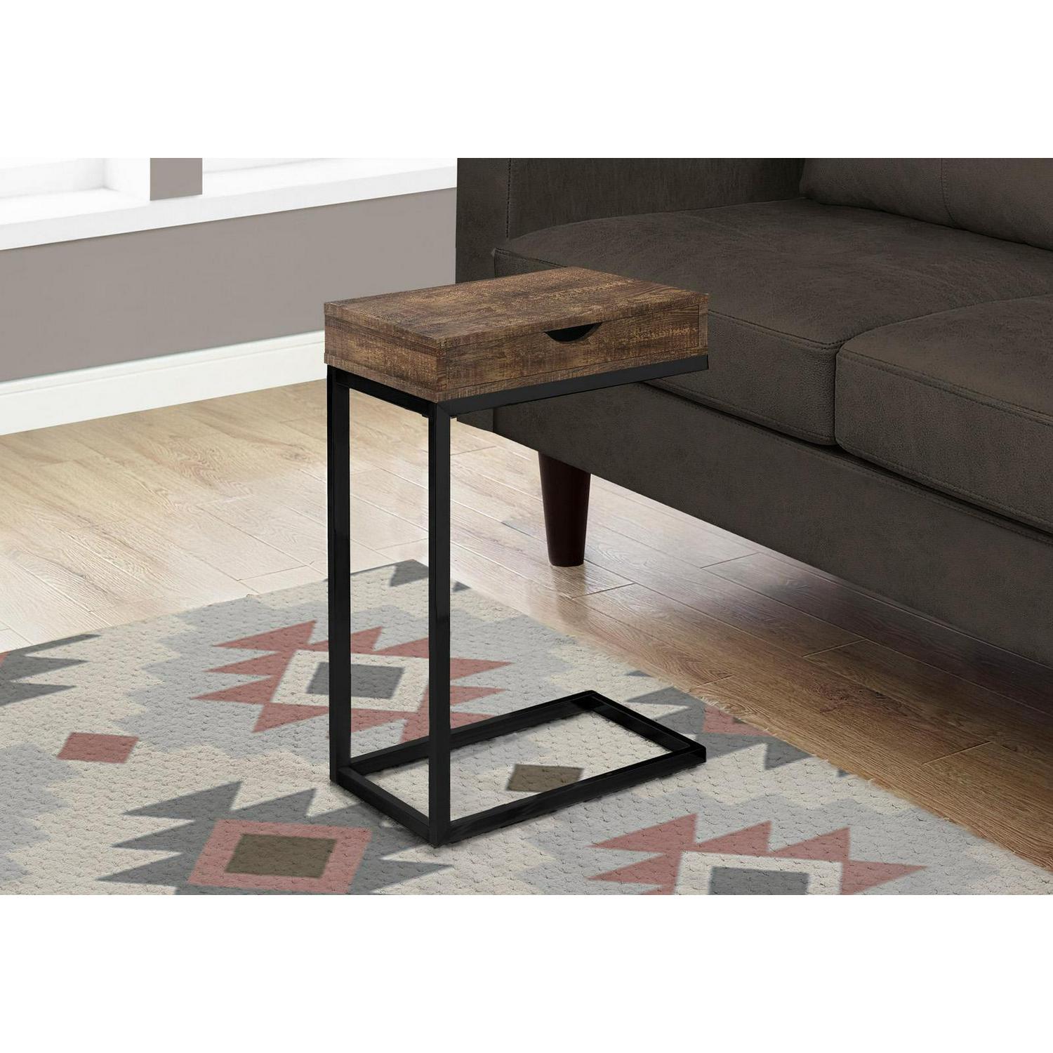 Boasting spiffy styling, its sturdy black metal base is as elegant as it gets Thick panel rustic wood look finish in white wash brings a traditional touch to the contemporary design of this C table Snack table during your favorite movie or simply an accent table to dress up your living room decor Includes storage drawer for remotes, coasters or other accessories Product Dimensions: 16 Inch L x 10 Inch W x 25 Inch H