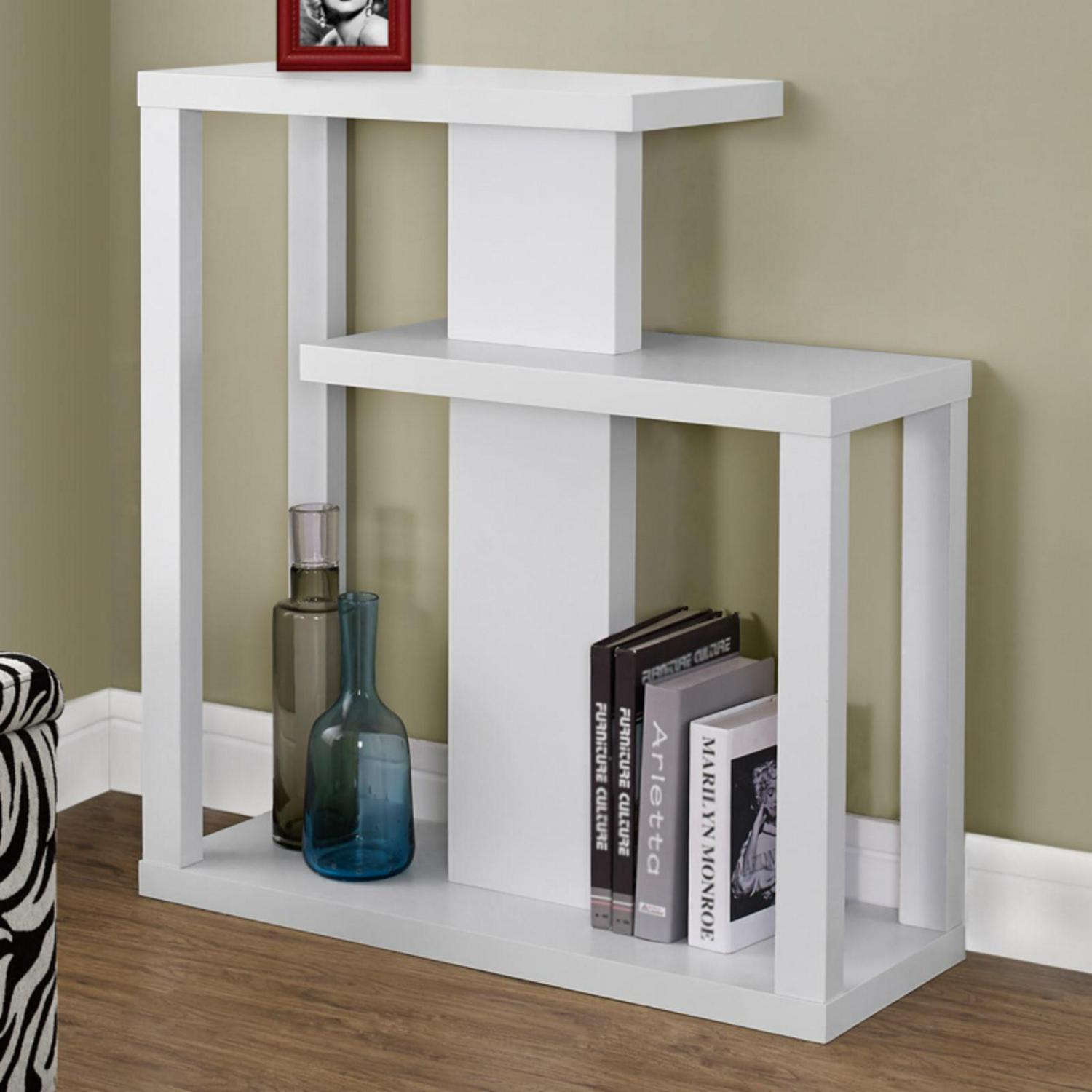 Three tiered open concept design in a contemporary style Ample display space for your decorative items Can be used as a sofa or hall console table Warm dark taupe wood-look finish blends well in any décor