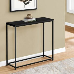 Bring an extra dimension to your entryway with this simple accent console table. The spacious black laminated surface will bring your decorative pieces to life or use it as a convenient spot to put down your keys; phone; or mail. Finished on all sides; this contemporary hallway table with an open black metal frame; can easily be used in a variety of spaces such as behind a sofa; a small hallway; foyer or anywhere that needs that compact accent furniture to give a small space a little bit of flare. Assembly is required