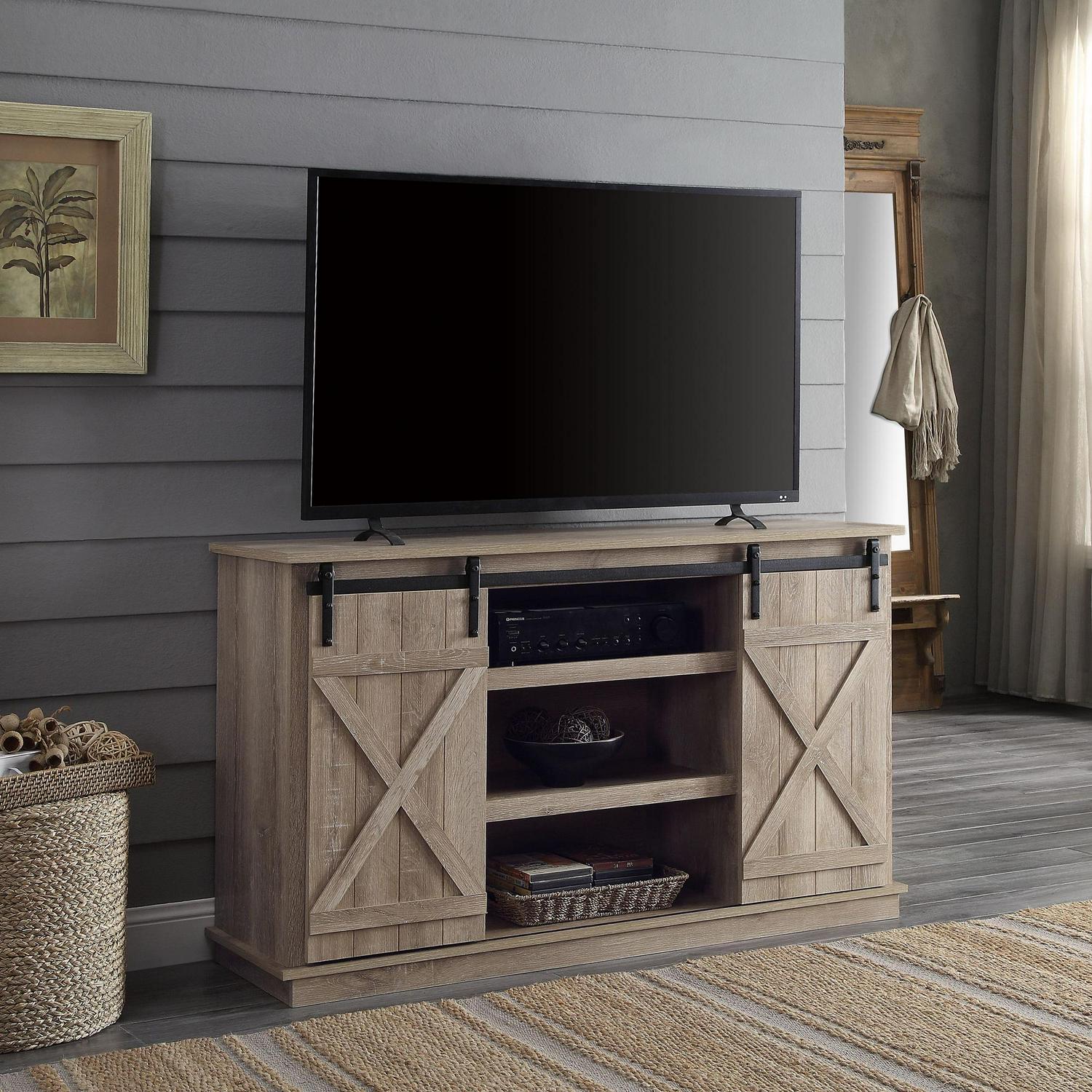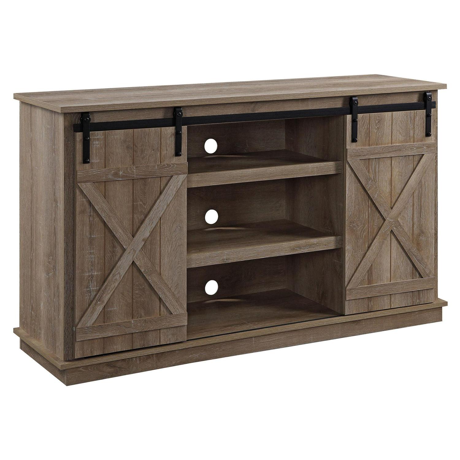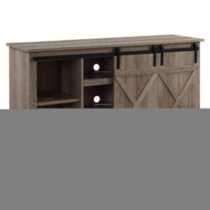 Highlight your living room with a down-to-earth aesthetic! The TV Stand features a rustic casegood and two sliding barn doors with X brace design. The sturdy metal track is paired with smooth sliding rollers, making you could easily move the barn doors to cover any storage spaces. There are four storage rooms and three media compartments with back holes for cable managements that is perfect for your audio visual equipment.