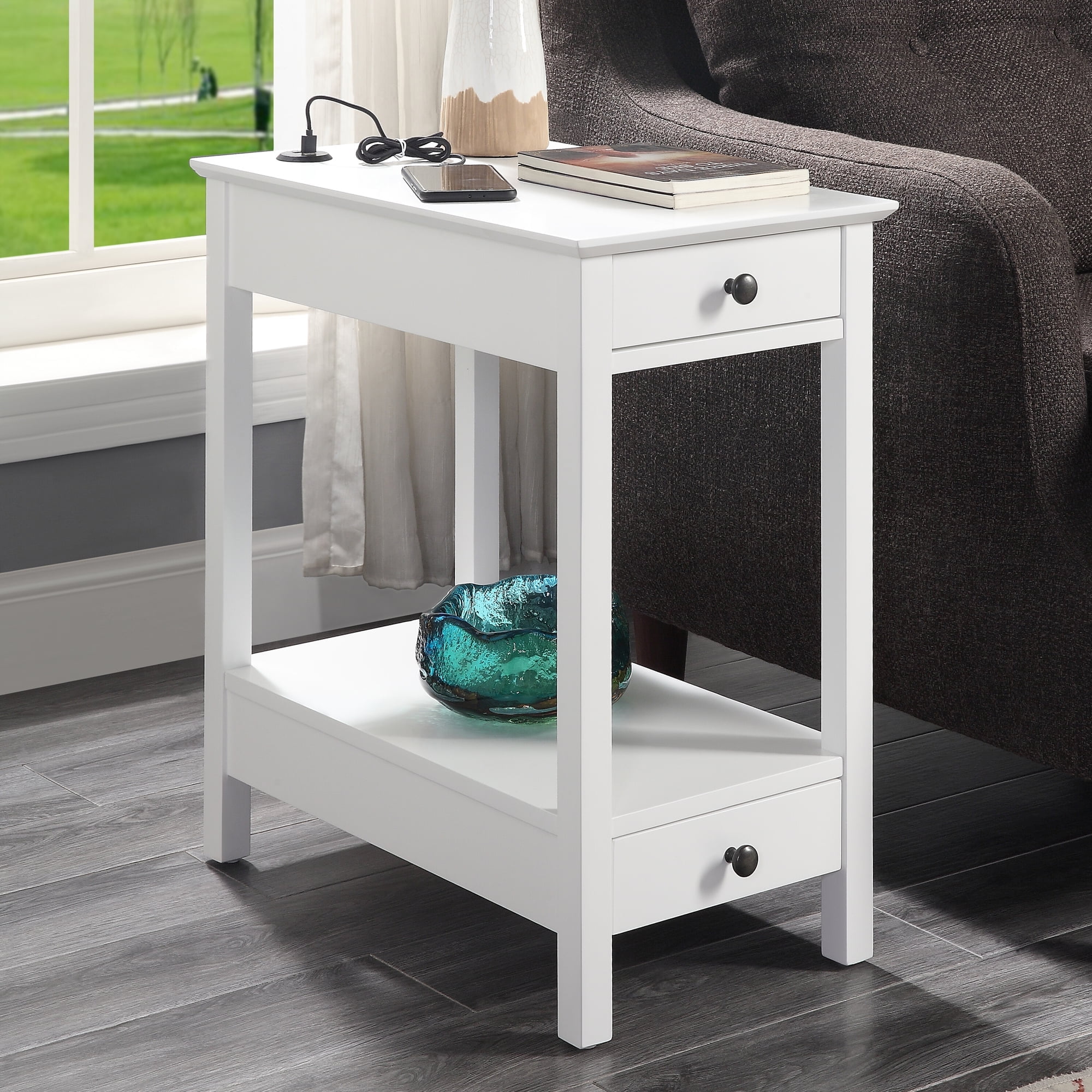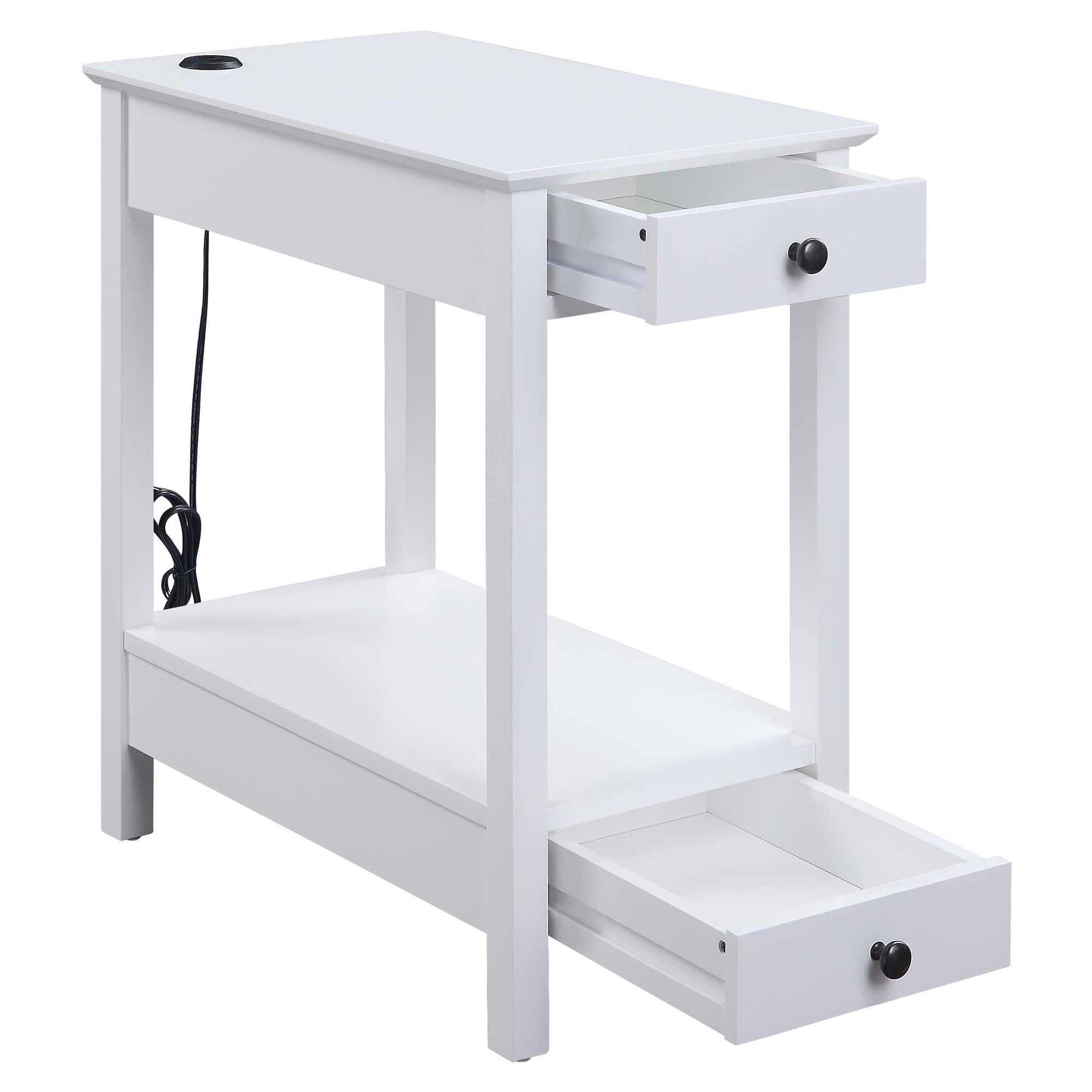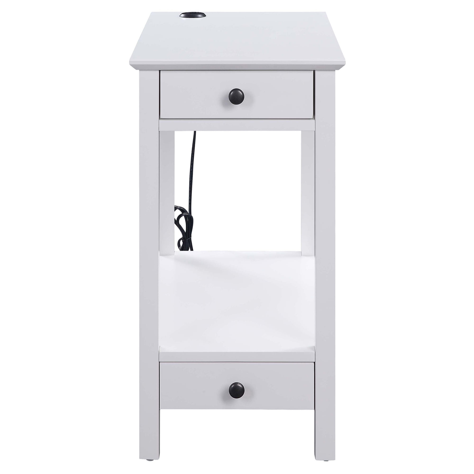 Acting as a perch for lamps, books, and other decorative accents, this Slayer side table is an asset in any living room. The rectangular table top includes a USB power dock so you can always stay connected. Featuring a drawer and two shelves, it becomes the perfect storage solution for novels, TV remotes, or small plants. Available in a white or black finish, this piece will bring modernity and functionality to your living room.