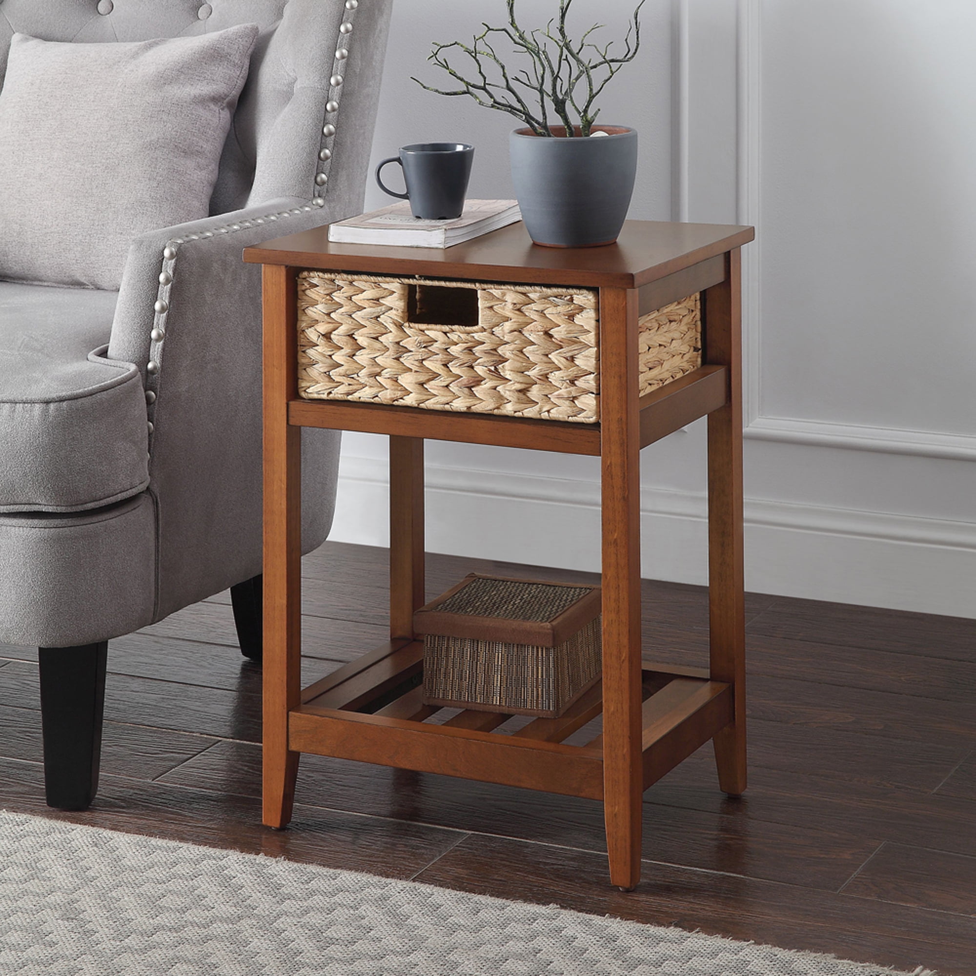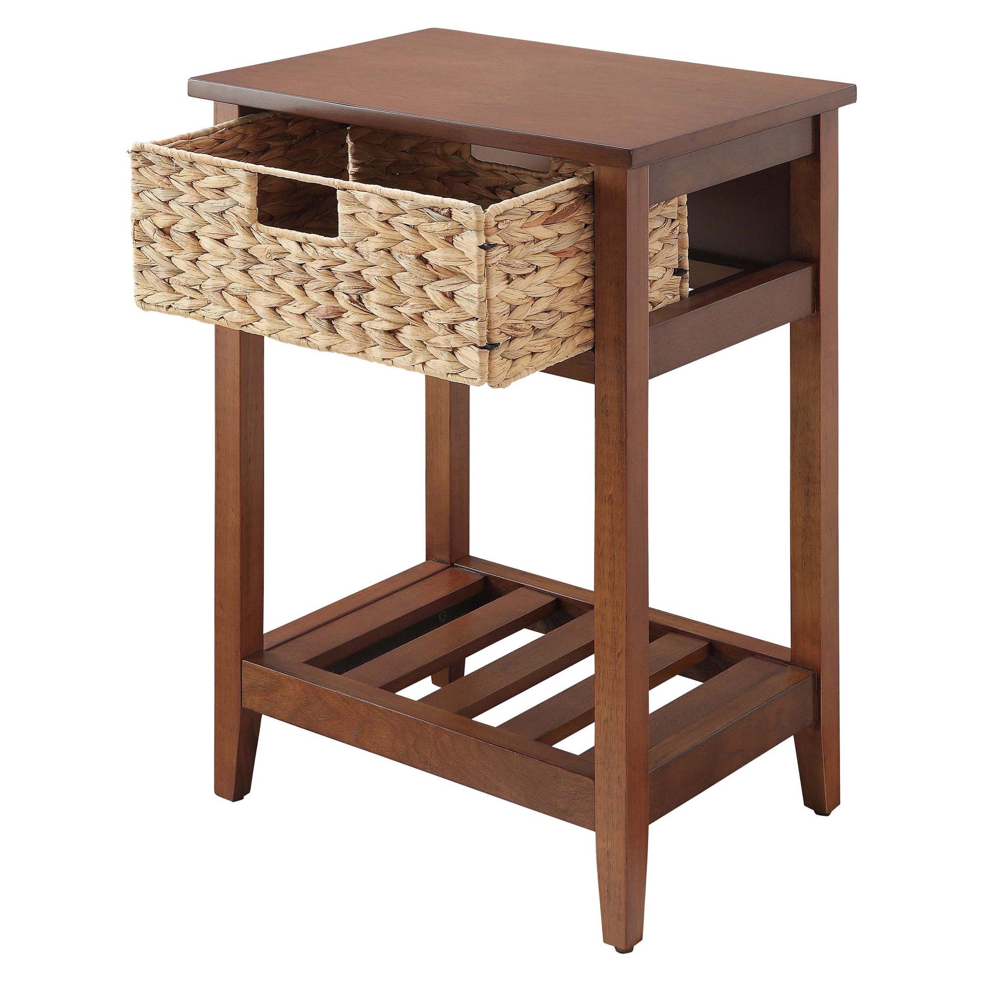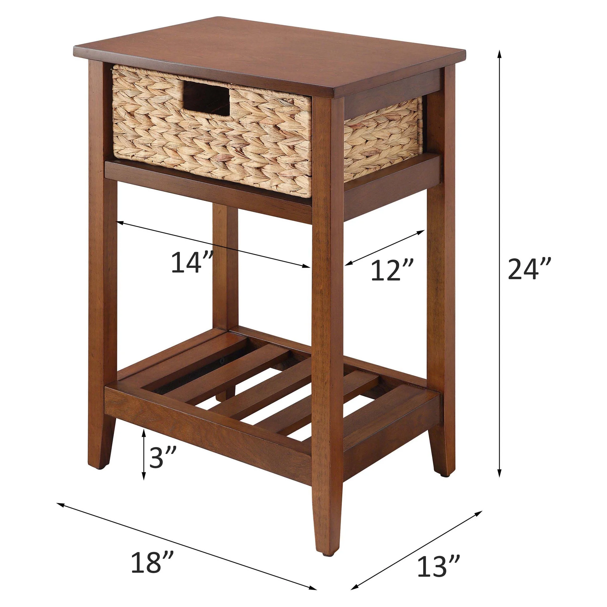 Rectangular table top 1 woven basket Wood drawer slide Grooves handle basket Floor clearance: 3″ Number of shelves: 1 Number of drawers: 1 storage dimension: 14″W x 12″D x 12″H Assembly required