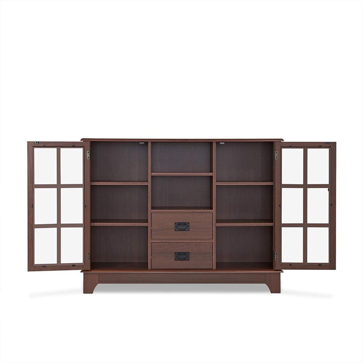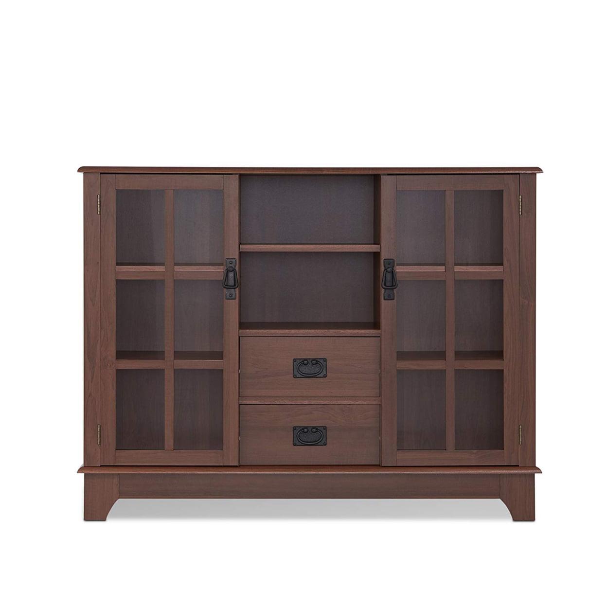 Extremely functional, the Dubbs cabinet features both open storage and drawer and framed glass door storage. Featuring 2 lower drawers and flanking doors that open to useful adjustable 2 shelves, this console table will help you entertain and keep items stored. The walnut finish and black arts and crafts hardware are helpful in blending into any decor.