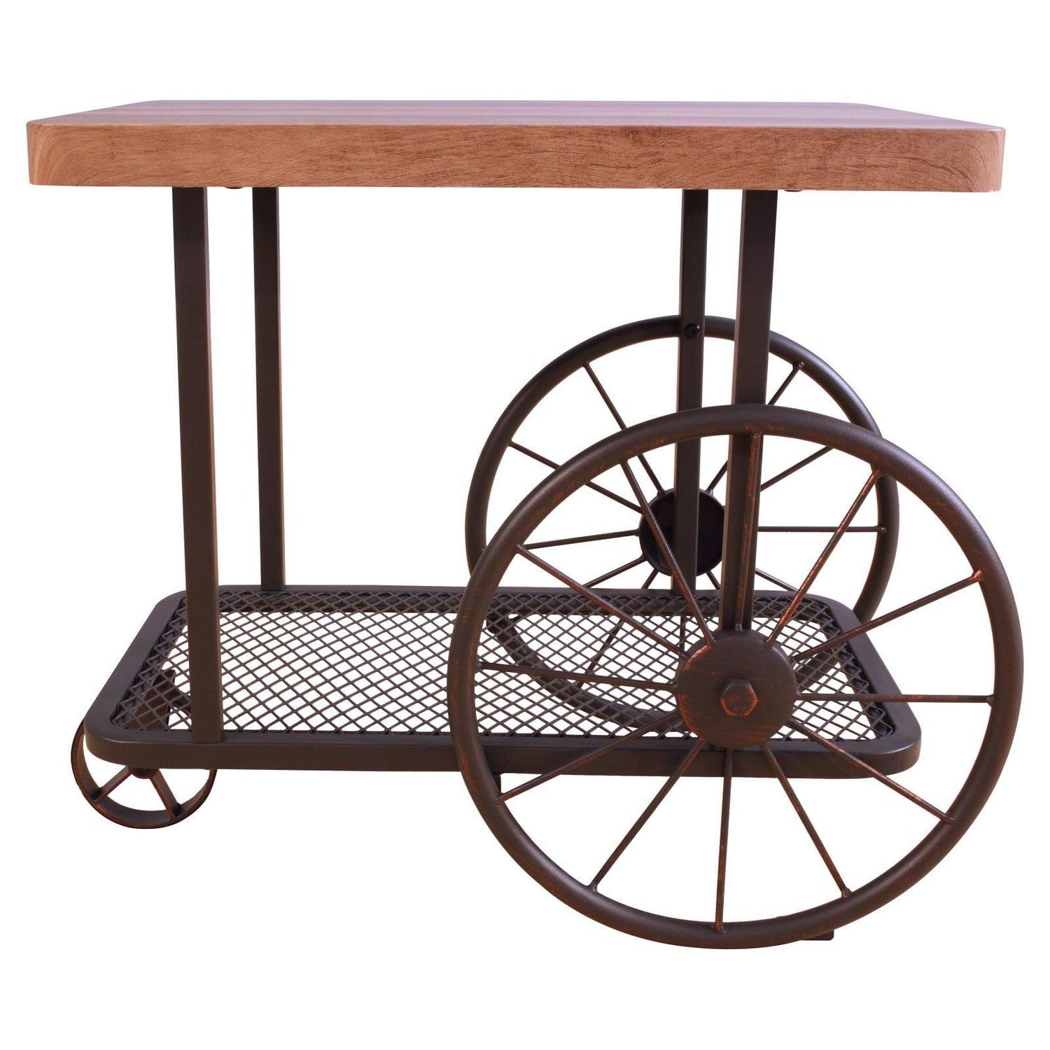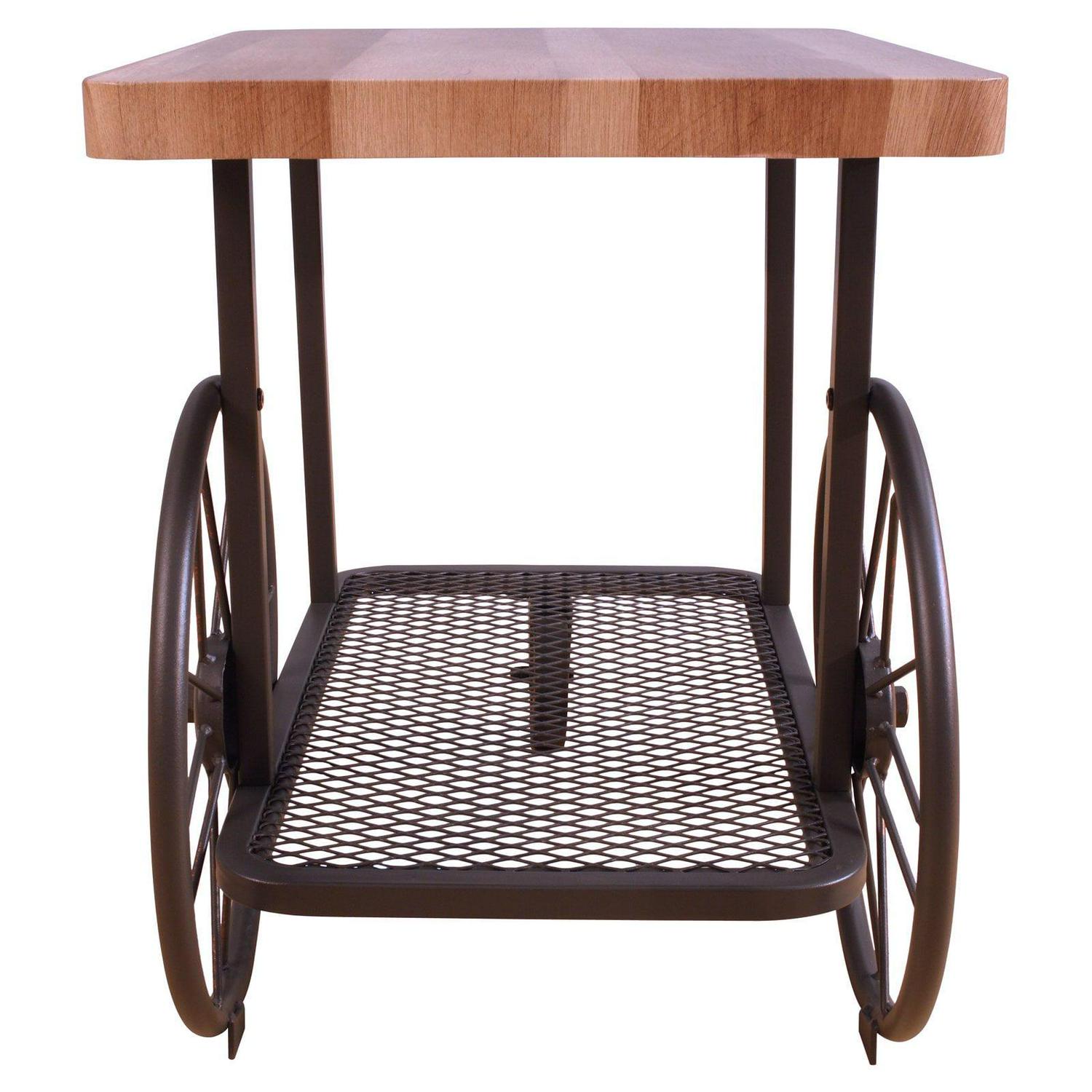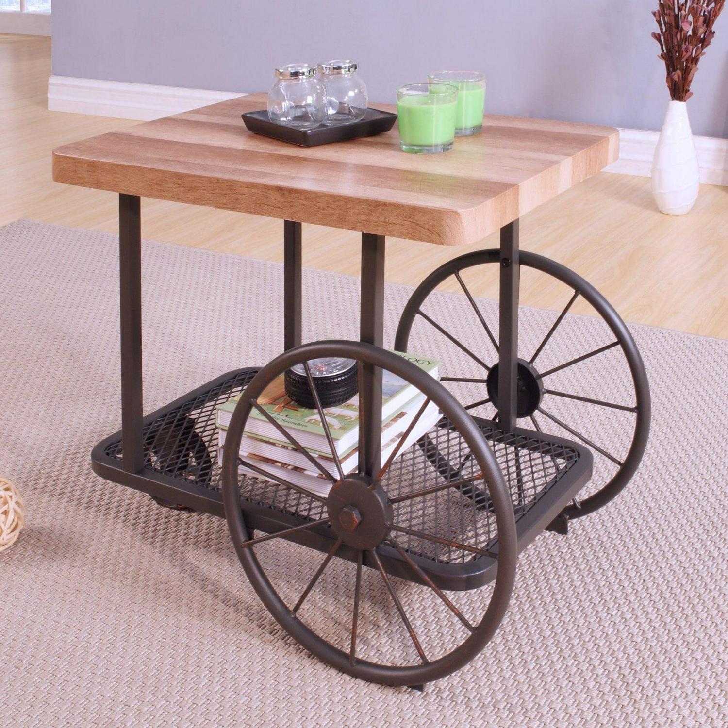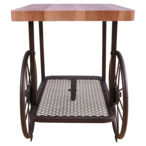 Unique and rustic, the ACME Francie End Table adds storage to your living area with a stylish, on-trend silhouette. Brimming with industrial-inspired appeal, this cart-style end table features two large wheels in back and a smaller one in front, providing mobility and an eye-catching profile. Constructed from a rustic black metal frame, this accent piece includes a lower mesh shelf and a wood butcher block top with rounded corners and a light, natural finish.