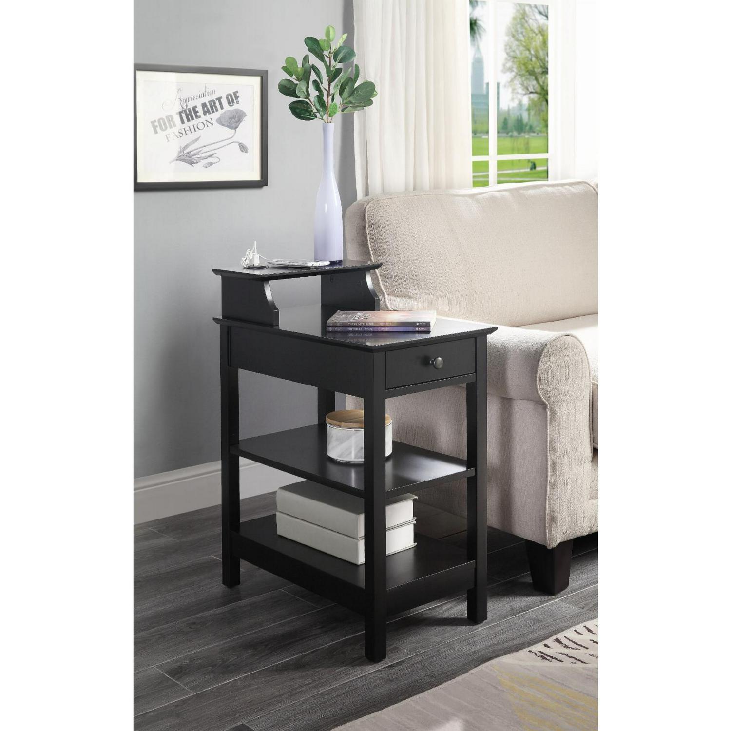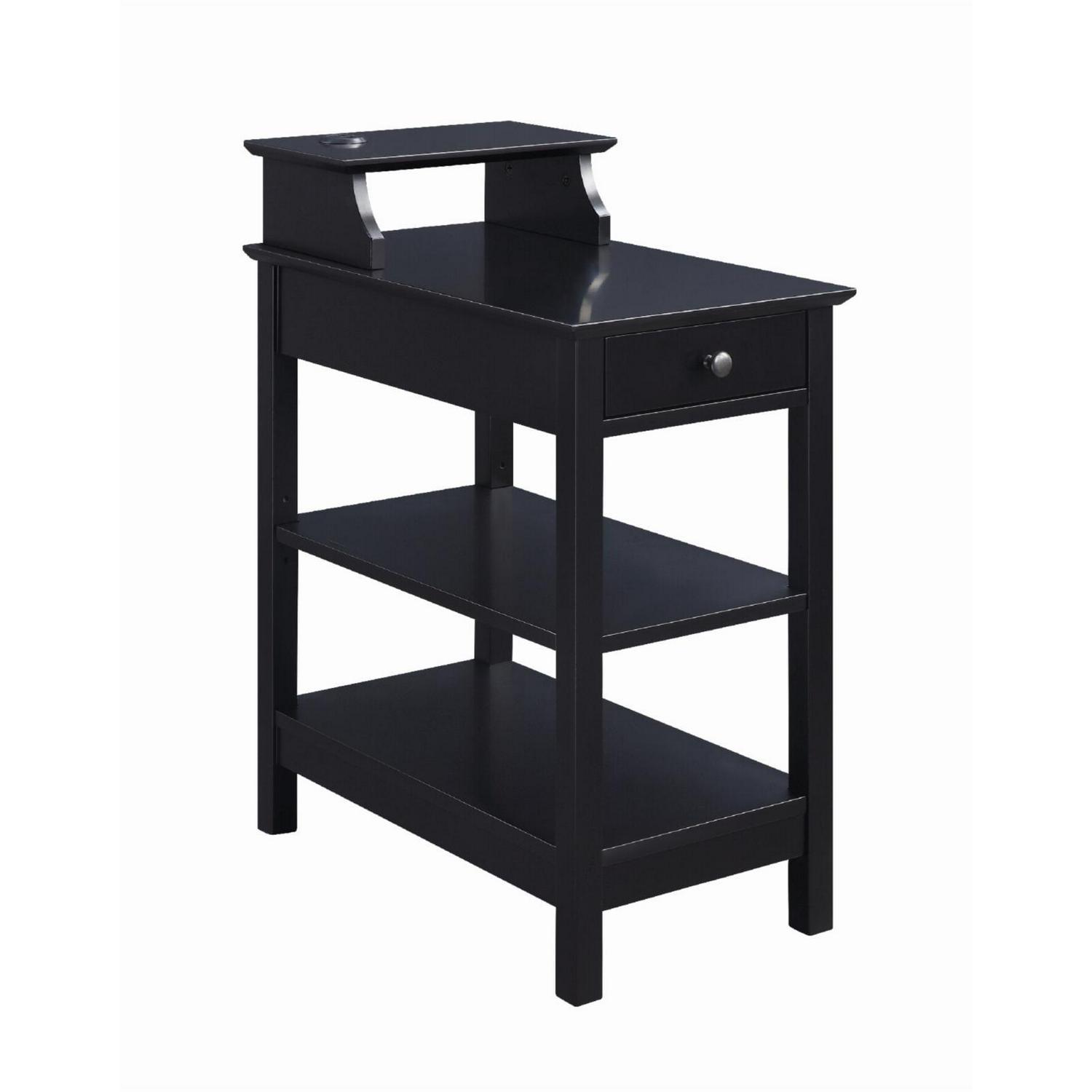 Description Acting as a perch for lamps, books, and other decorative accents, this Slayer side table is an asset in any living room. The rectangular table top includes a USB power dock so you can always stay connected. Featuring a drawer and two shelves, it becomes the perfect storage solution for novels, TV remotes, or small plants. Available in a white or black finish, this piece will bring modernity and functionality to your living room.