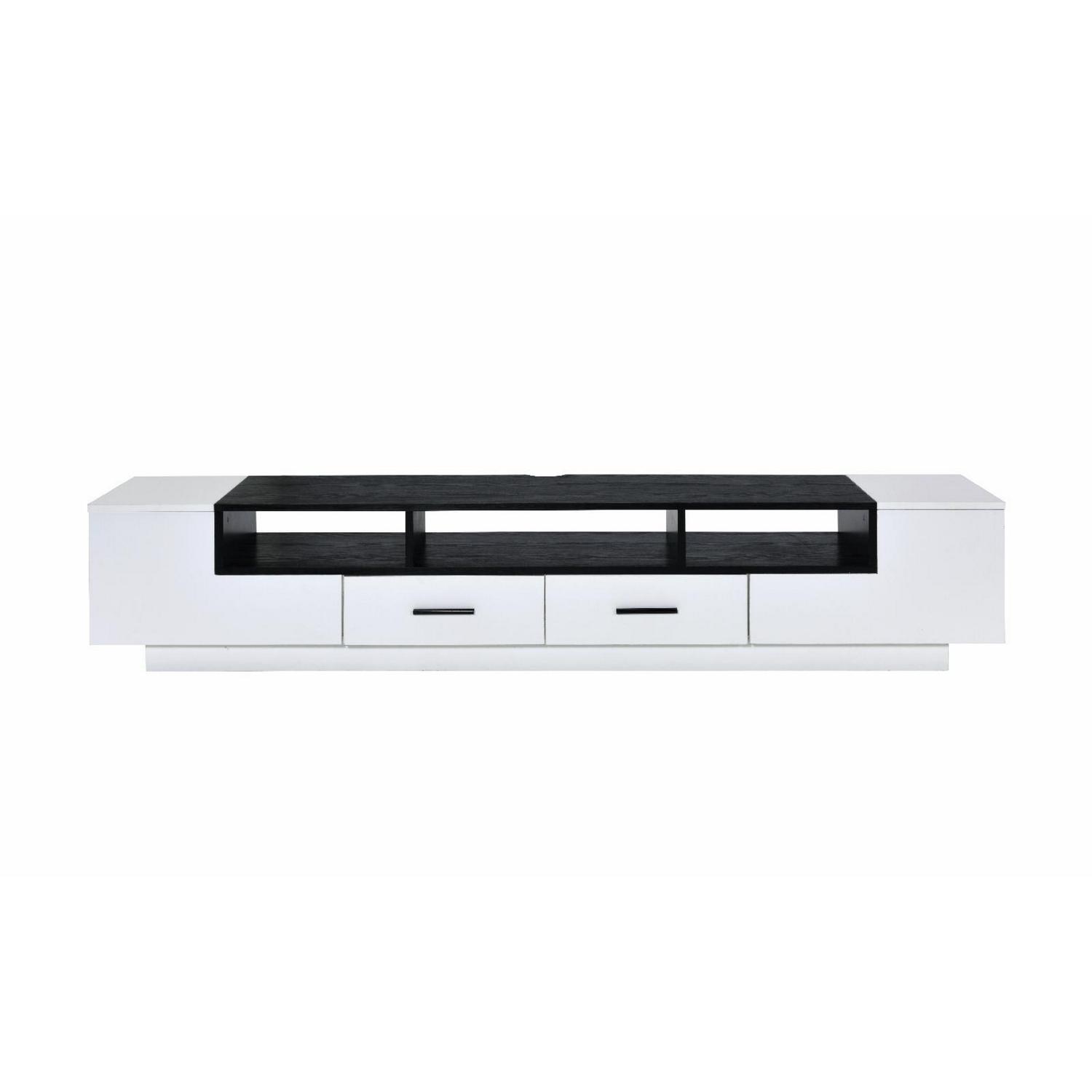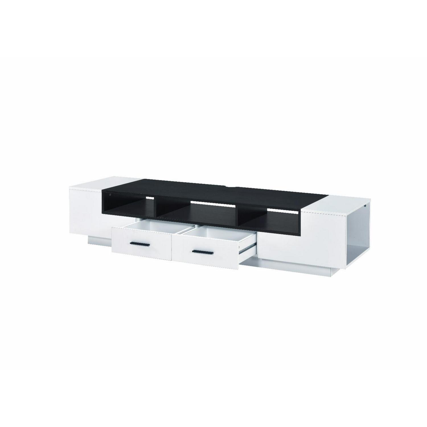 Bring an updated modern flair to your living room with this Armour TV Stand. Showcasing a clean-lined design, this piece offers open compartments and drawers for storage and displaying. Cord management is included to provide functionality while the wooden frame enhances stability. Finished in a beautiful white gloss and black hues, this TV stand will effortlessly match any décor.