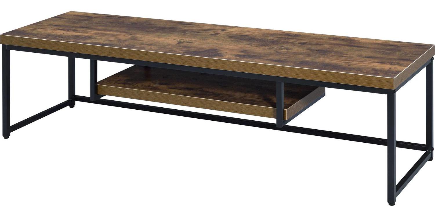 Rectangular Wood And Metal TV Stand With One Shelf, Brown And Black- Saltoro Sherpi This industrial look TV stand can be an innovative inclusion in any interior styling. Made up of engineered wood and metal, this TV stand finishes in brown and black color that will surely uplift the living room interior. Featuring such a robust design and style, this rectangular shape TV stand will surely serve its purpose to the most as it comprises one open shelf in the middle beneath the table top which can be used for storing media players and other things.