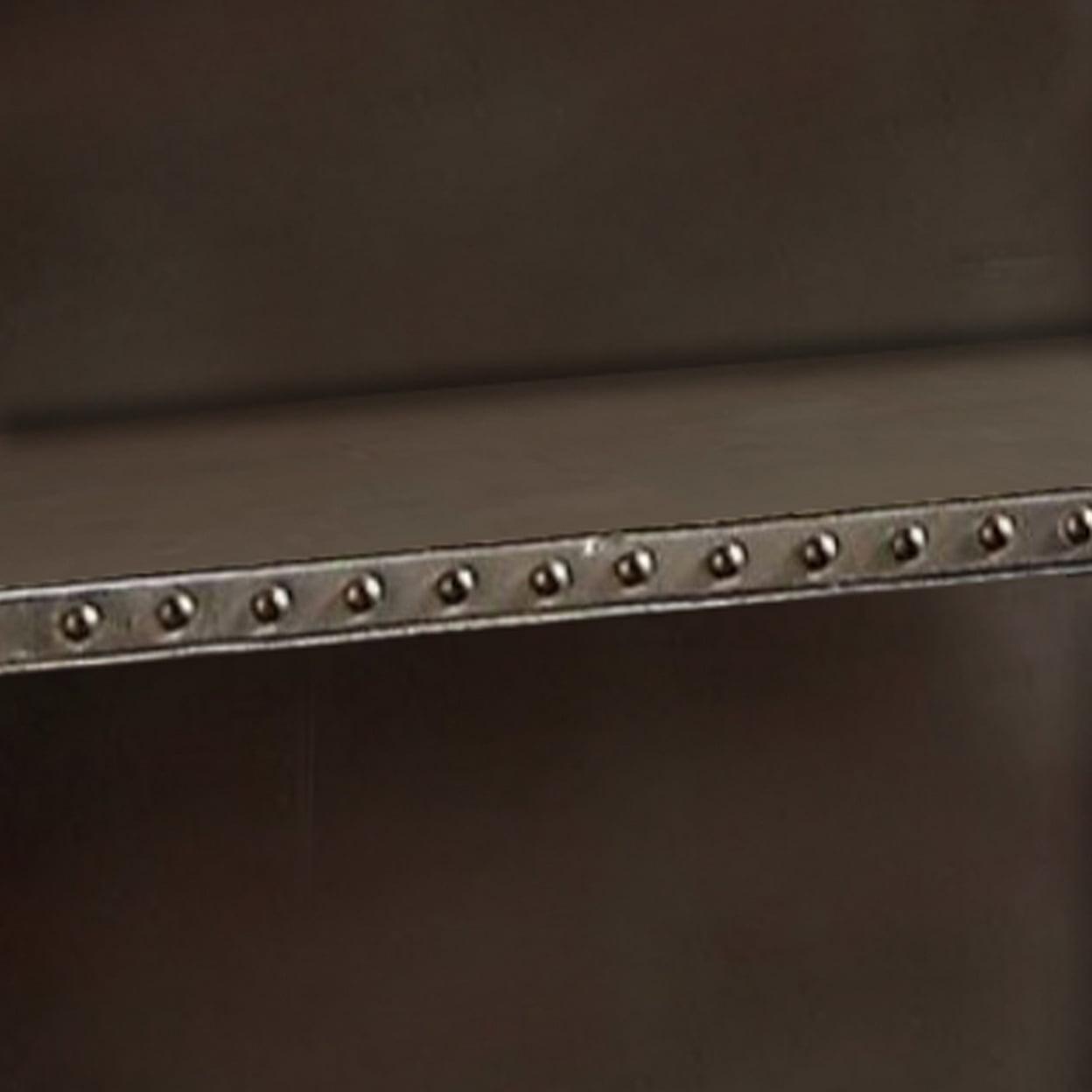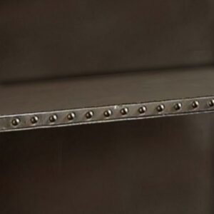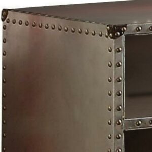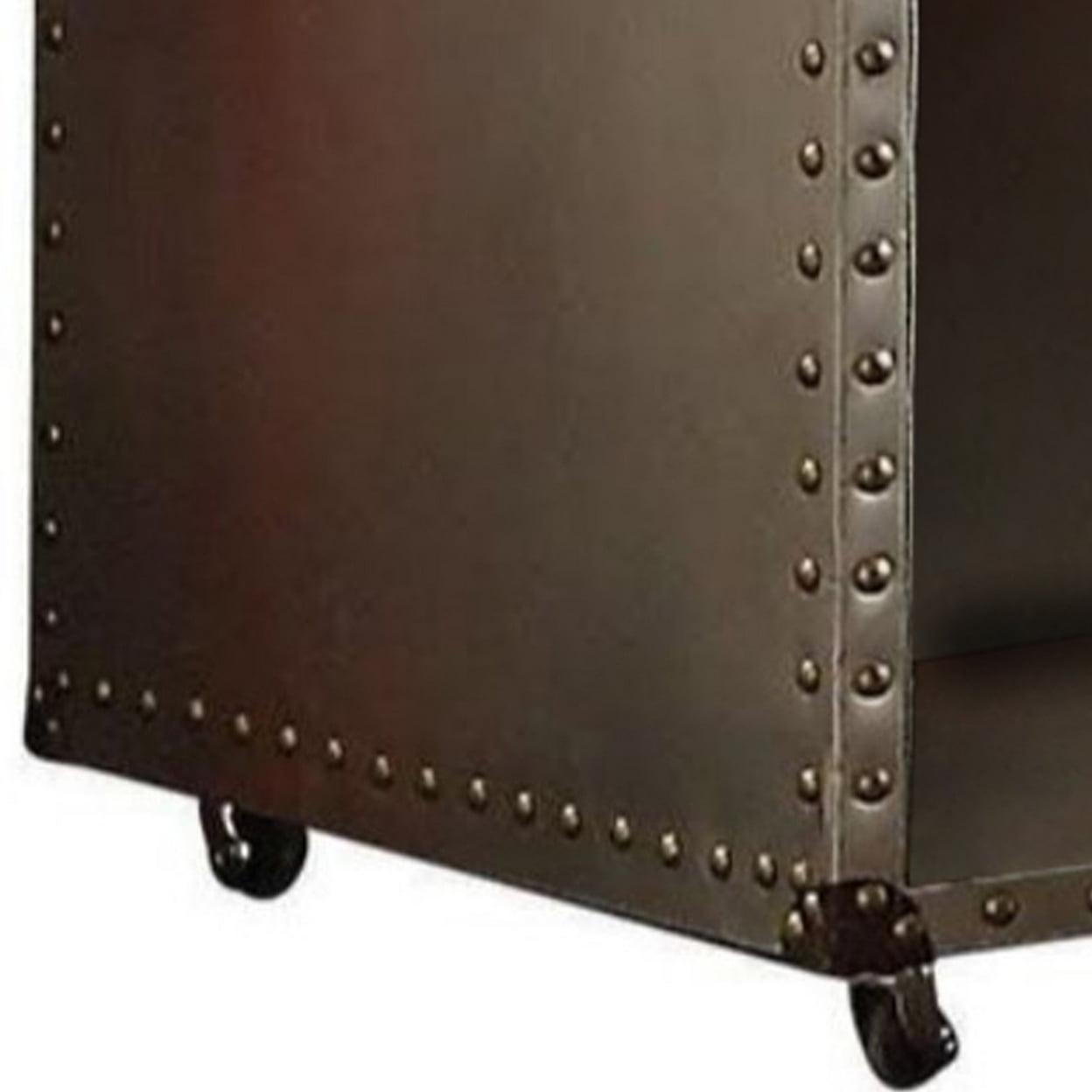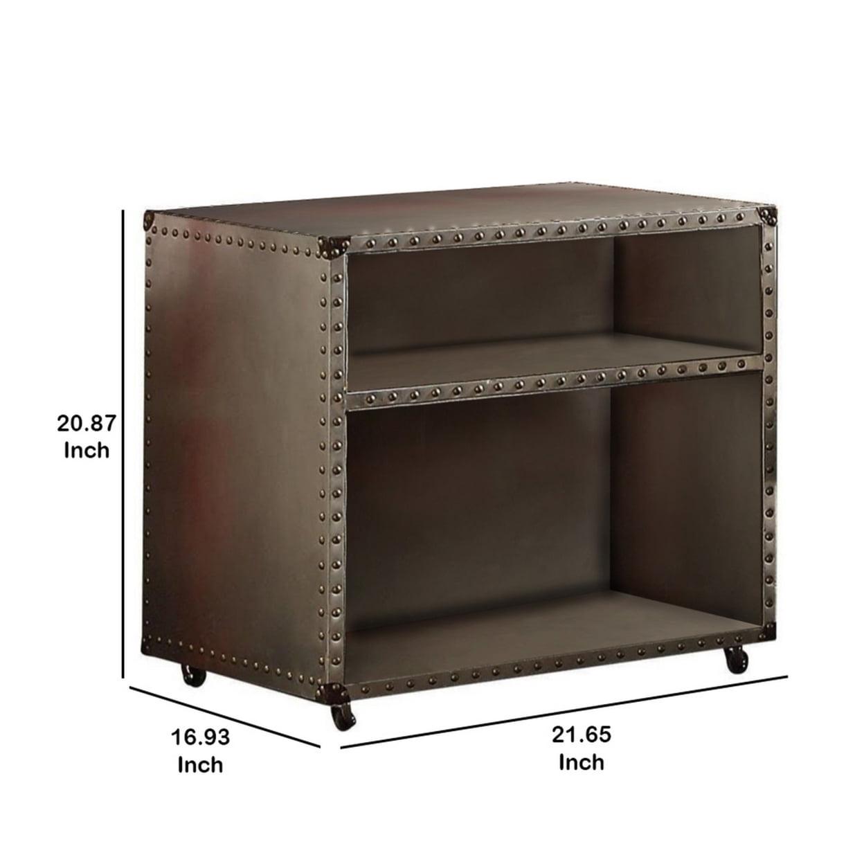 Rectangular Nightstand With USB Power Dock And Caster Legs In Aluminum Finish- Saltoro Sherpi Combining a classic design with vintage appeal, this nightstand is perfect for any theme bedroom from formal to casual looking. Finishes in rectangular shape, this nightstand features a USB charging dock with two open shelves for storing all bed side essentials. Featuring an aluminum finish, this nightstand also consists nail head trim accent on all edges and four casters attached to the base. With clean details, this sleek furniture piece is making a perfect addition to compact spaces home. Does not include any featured product other than one nightstand.