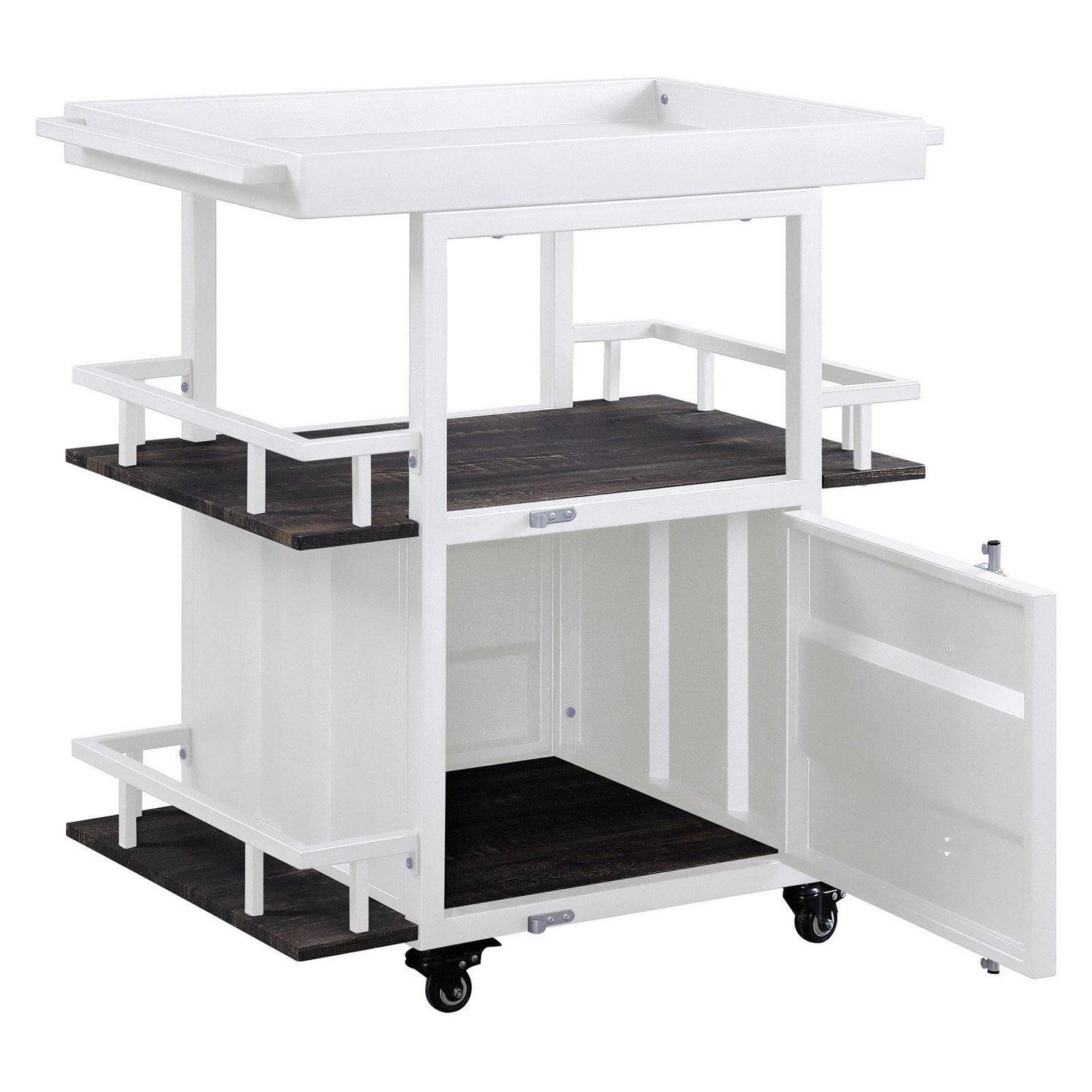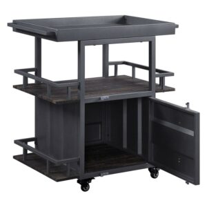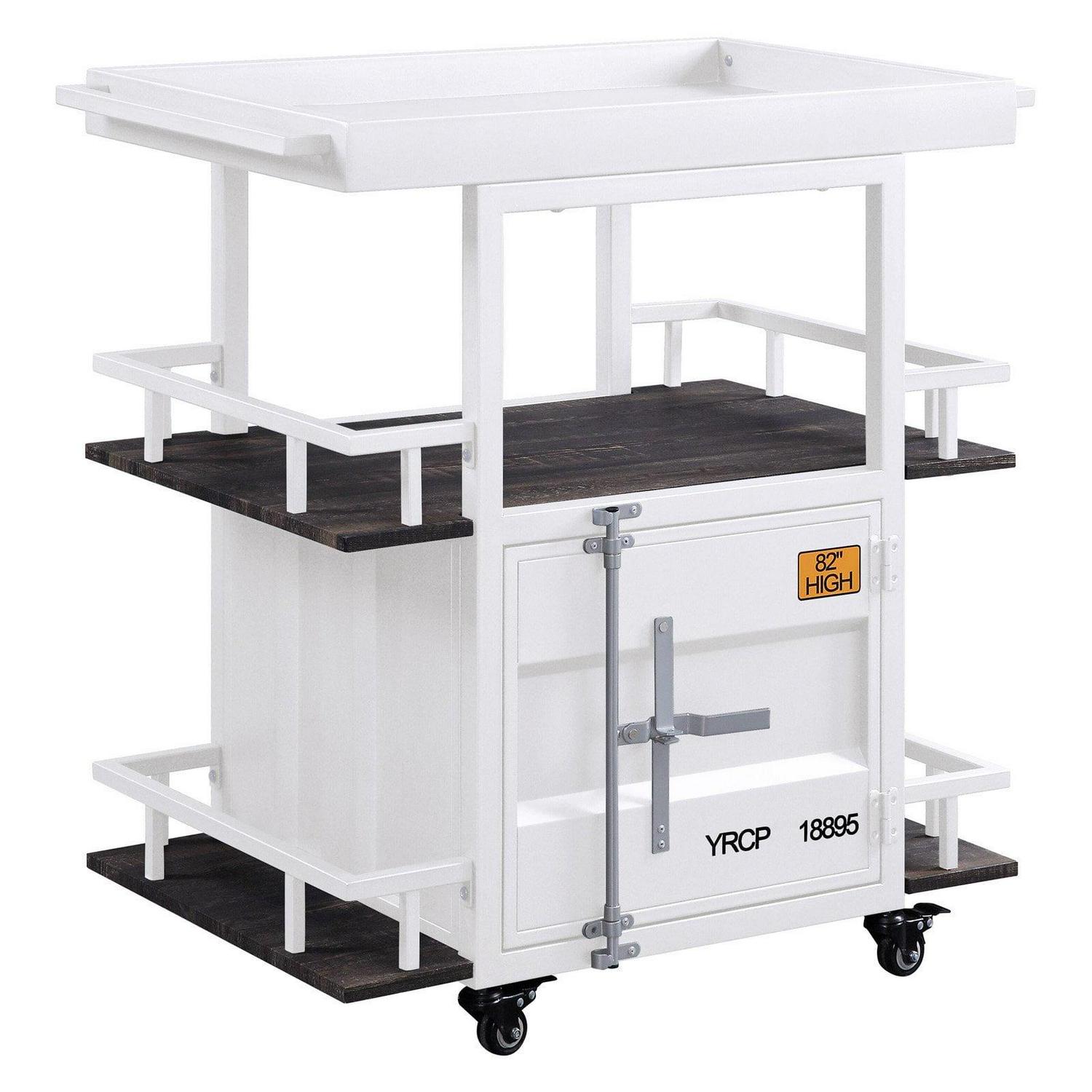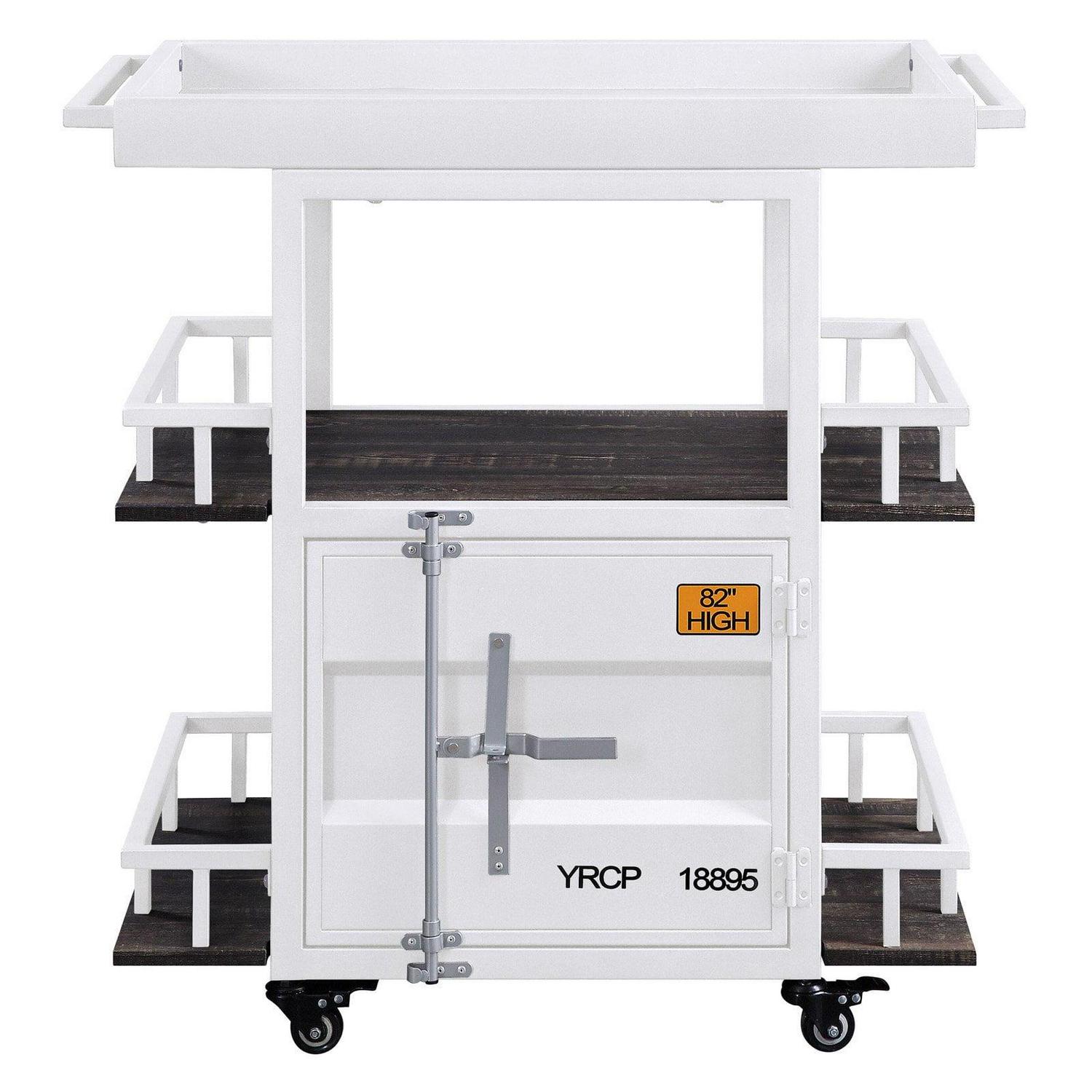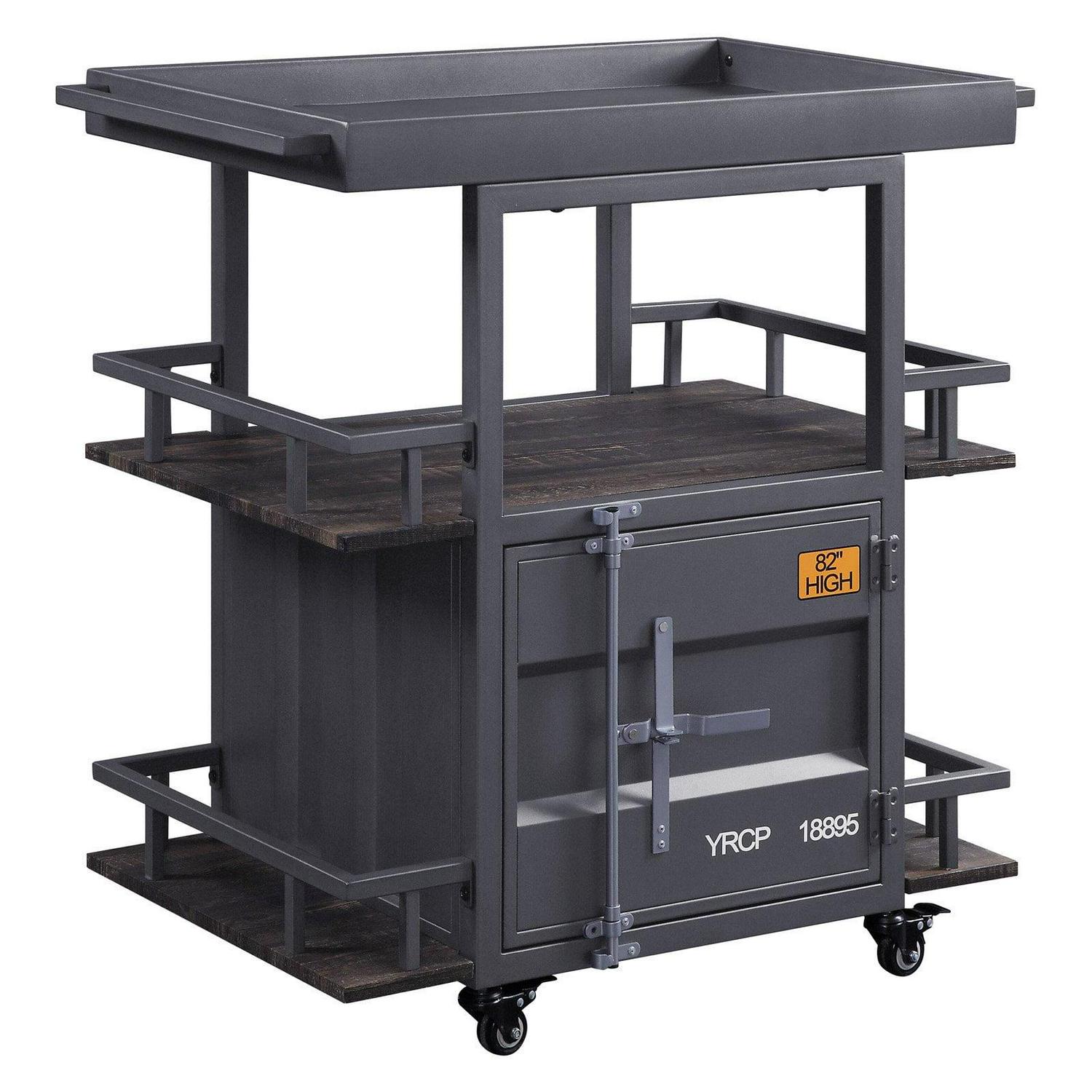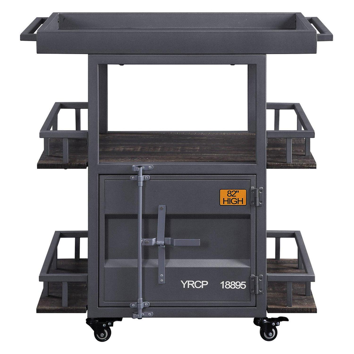 The Acme Furniture Cargo Serving Cart is just the industrial piece your dining space has been missing. This cart features a cargo container with a full-length lock that acts as a storage compartment. It sits on caster wheels and features three storage and display shelves made of wood with an antique walnut finish. Pair with matching pieces in the Cargo Collection.