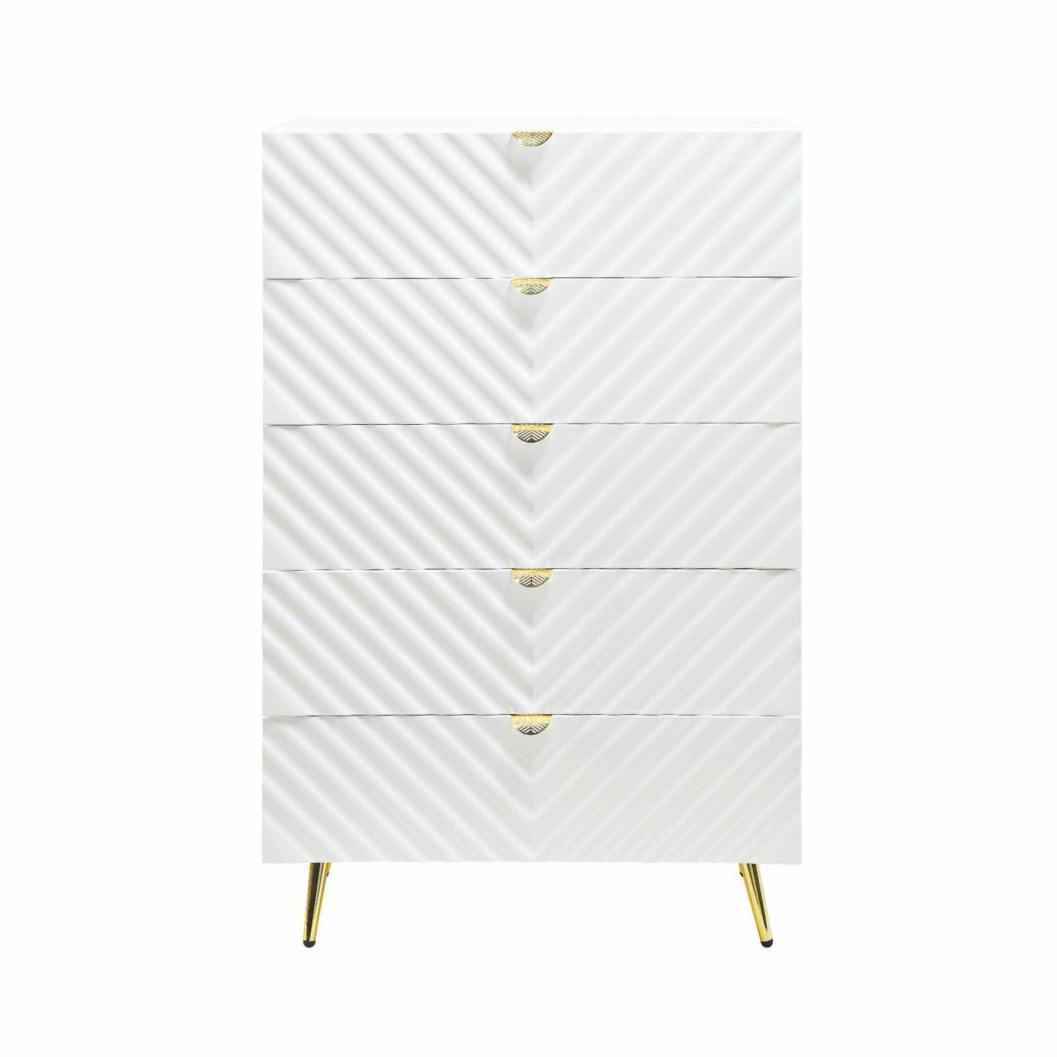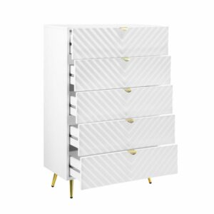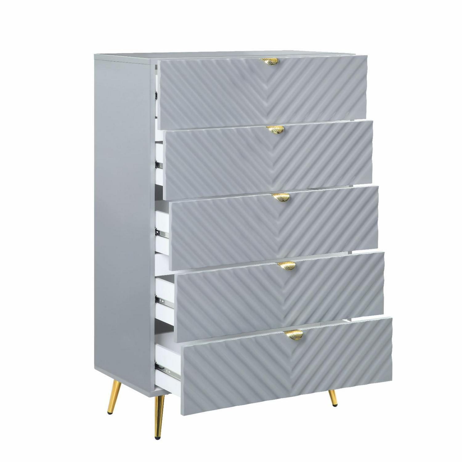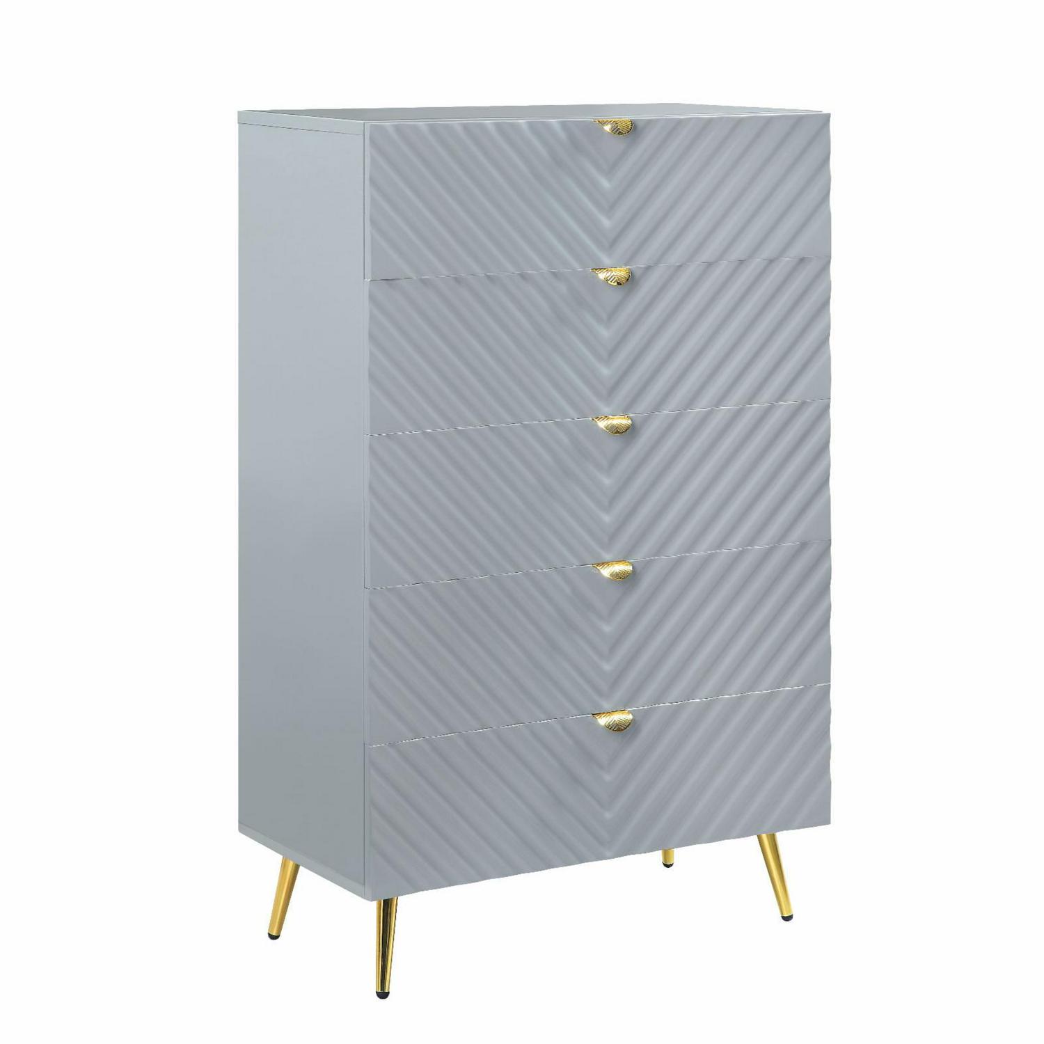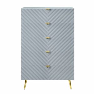 The Gaines Collection is a glamorous and sophisticated grouping that adds a chic style to any room. The optional finish and gold metal accents help to accentuate the clean lines of the pieces and add a pop of glamour. The diagonal line design adds visual interest and texture, making each piece stylish. With a variety of storage options to meet your needs.