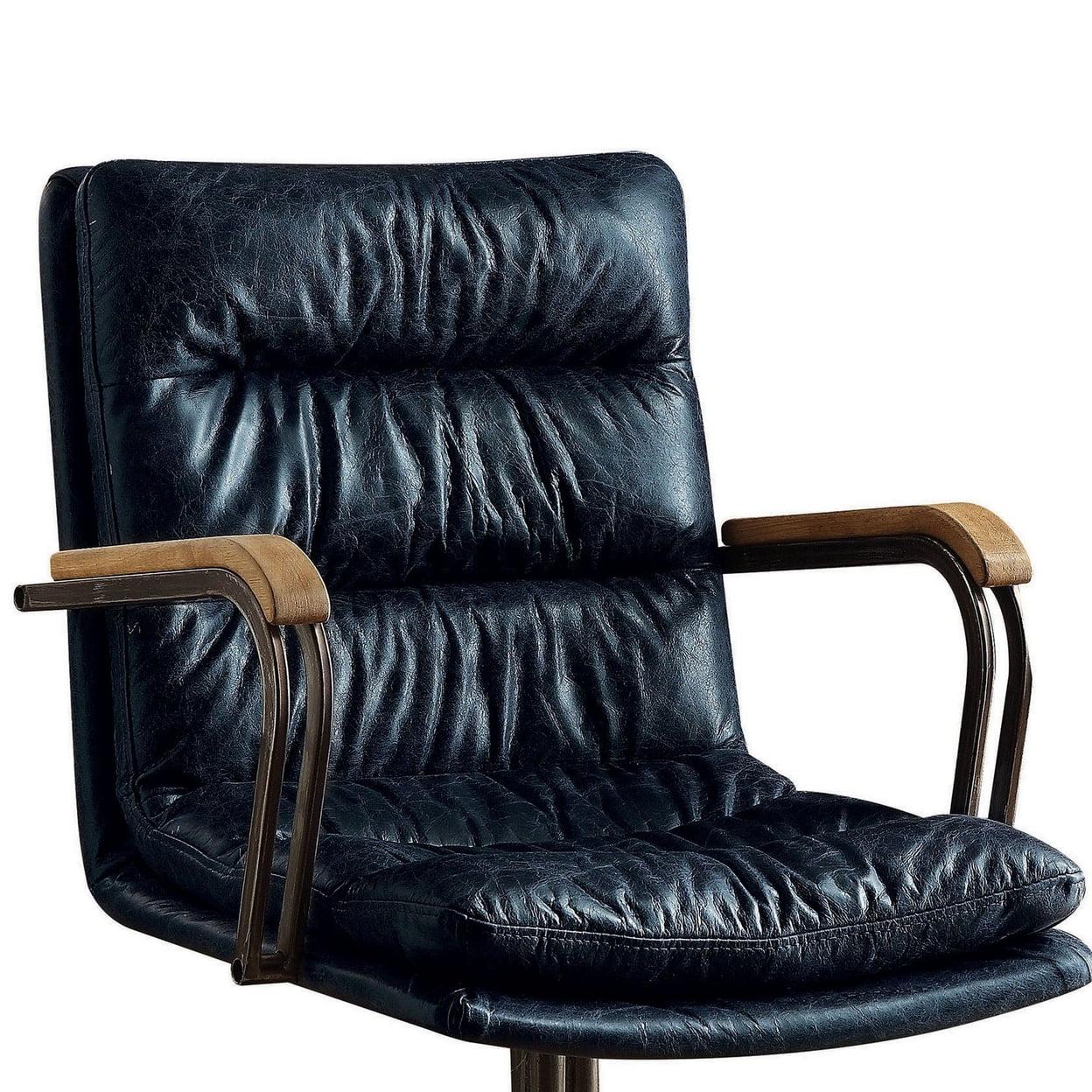 Metal & Leather Executive Office Chair, Vintage Blue- Saltoro Sherpi This vintage whiskey leather finish executive arm office chair its ideal for any casual or professional working area, provides a comfortable support with a cozy and convenient design. Carefully crafted this chair features swivel seat with no lift. This chair has padded back and leather cushion seat provides a comfortable sitting. This chair has sturdy 4 star base with rolling caster wheels for its easy relocation.