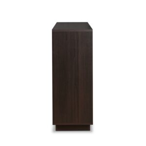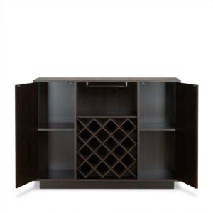 Store your beloved wines with this classic but trendy rectangular Hazen server to have them ready anytime. This server has 2 wooden doors with 1 shelf inside, wine rack and steam ware glass rack, providing plenty storage space for your convenience. Keep it close to your dining table to tuck away glasses, napkins and other essentials. Finished with espresso wooden frame, it will fit naturally in any design.
