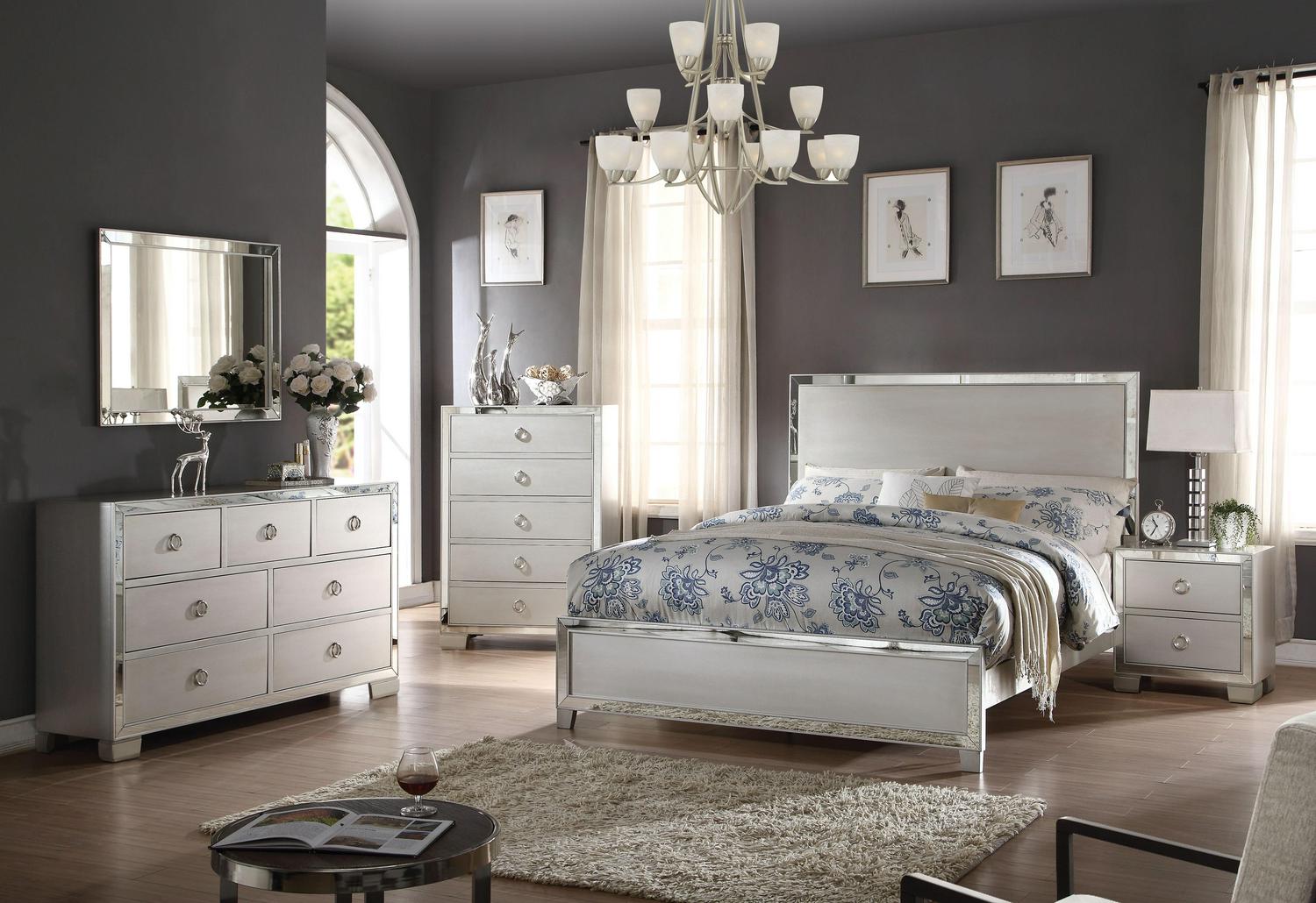 The Voeville II Collection will create a warmer and fresher environment in your master bedroom with its platinum finish. Features panel wooden headboard or upholstered PU headboard for you to choose from, complemented by mirror inlay trim, brings a unique more relaxing and modern taste. Create a fantastic look in your bedroom with the Voeville II Collection.