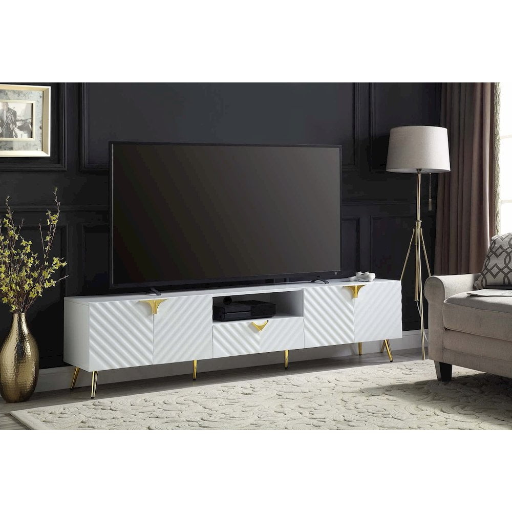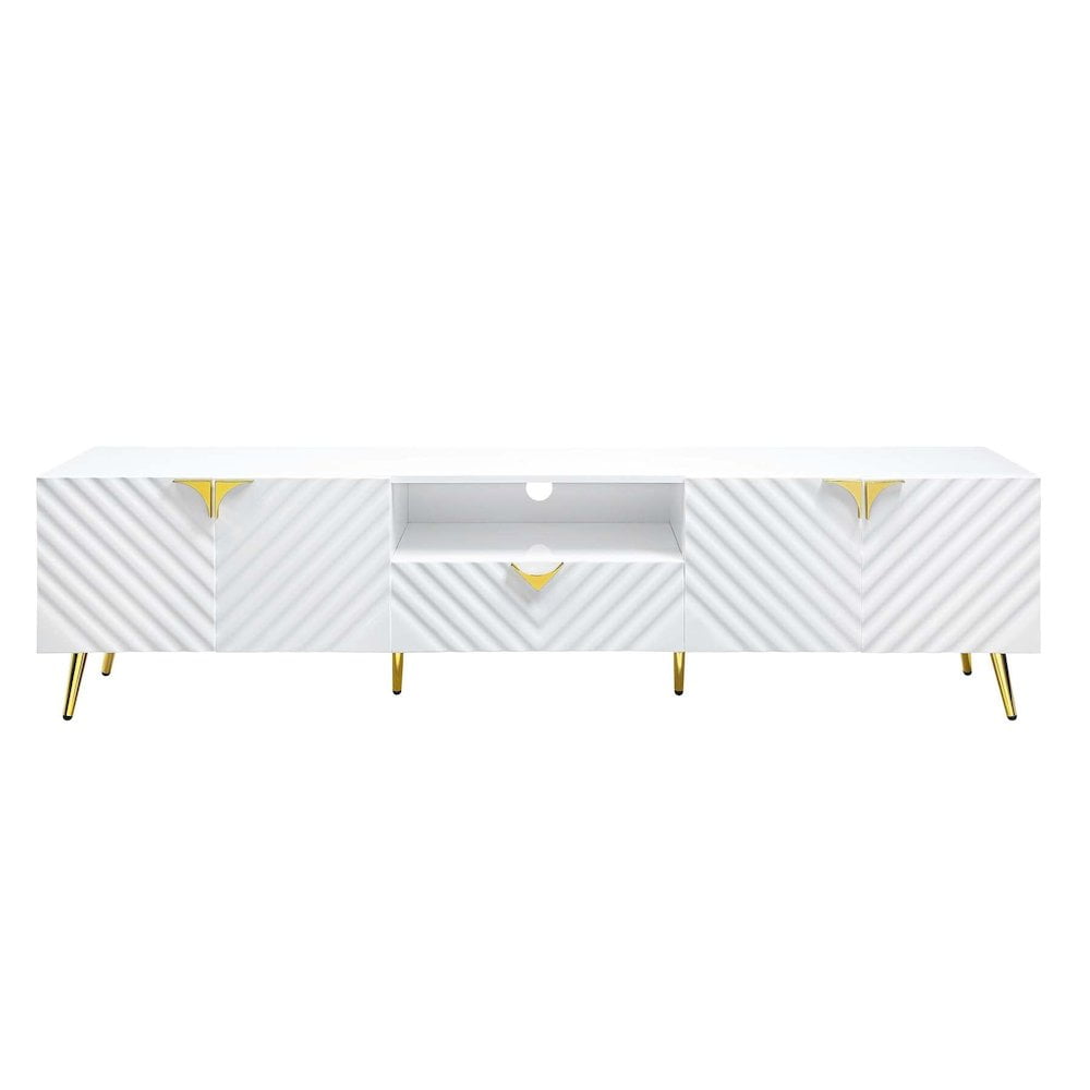Elevate your home entertainment system setup with this exquisite, elegant TV stand. Designed with a white high gloss finish and polished gold accents, this sophisticated television stand boasts a glam vibe to modern living rooms and entertainment areas. The long rectangular shape rests on tapered flared legs in a gleaming gold finish, mirrored by the contoured gold hardware on each cabinet door and drawer. Along the front facade is a textural diagonal wave pattern motif that lends a stunning visual intrigue to a space. Inside the TV stand are adjustable shelves to keep games, DVDs and other media for an organized and within your grasp. Features: 2/3 extension drawer Metal side drawer glide Max TV size recommanded: 80″ Cord management included 2 support legs Material:MDF, Metal Color of White High Gloss Finish Specifications: Product Dimensions: 79″L x 17″W x 20″H Product Weight: 102 lbs