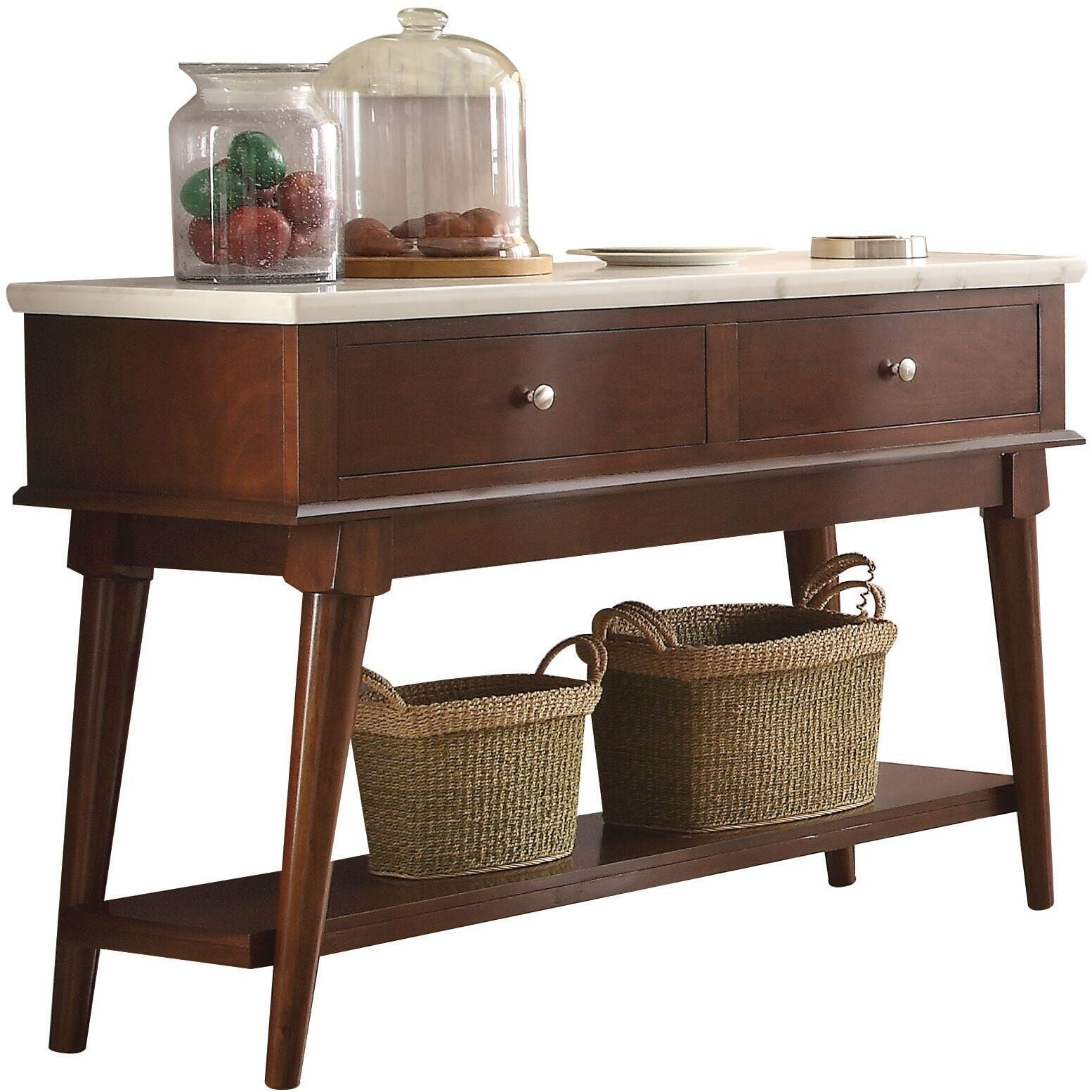 Keep all of your dining essentials close at hand with the Gasha server. The smooth, white marble surface space is ideal for serving or display while each of the walnut wood drawer’s welcome flatware, linens and more. Rectangular legs offer support while a lower shelf provides an additional place to store or display any number of items. Features: Rectangular Leg Server 2 Drawers Bottom Shelf Wooden Framespill occurs clean inmediately. Do not place cold or hot items directly on the marble surface. Wooden Tapered Leg Mid-Century Style Specifications: Product Dimensions: 51″L x 18″W x 34″H Product Weight: 110 lbs