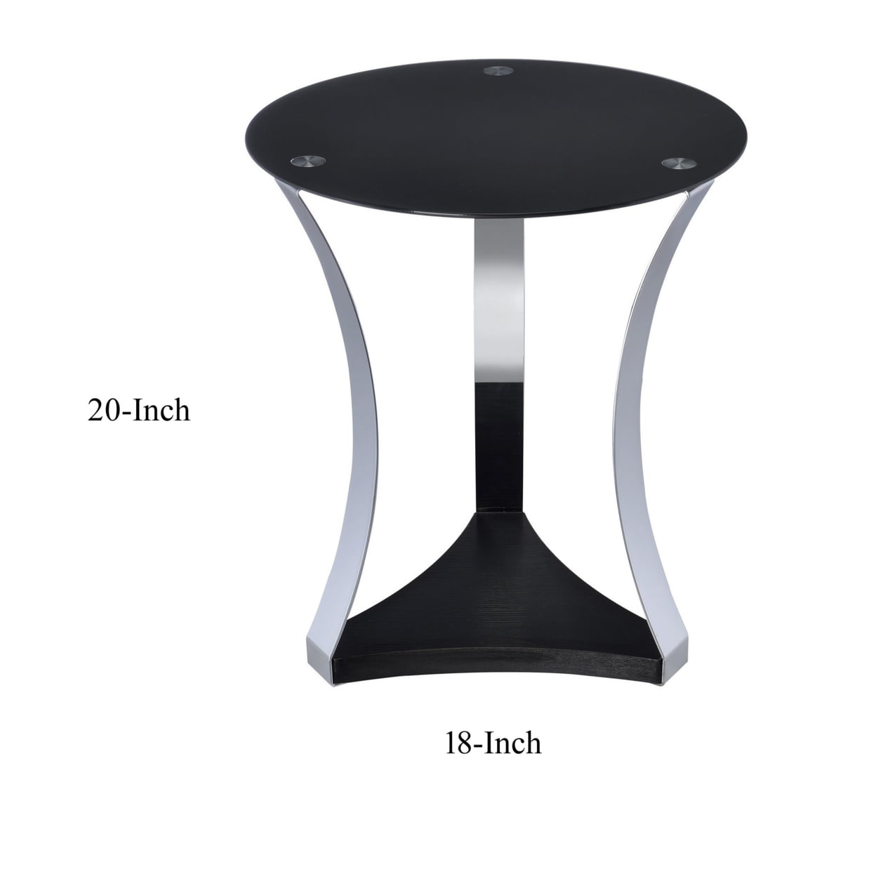 Round Table OPEN STORAGE:Bottom Shelf Round Top:Black Tempered Glass Metal Stand Included:KD Round End Table- Open Storage: Bottom Shelf- Round Top: Black Tempered Glass- Metal Stand: Chrome Finish Metal Tube- Wooden Shelf Black Finish Materials:Glass PB Metal Product Height:19.68 Product Width:17.71 Product Length:17.71 Product Dimensions:18″Dia x 20″H Click here to view the assembly guide