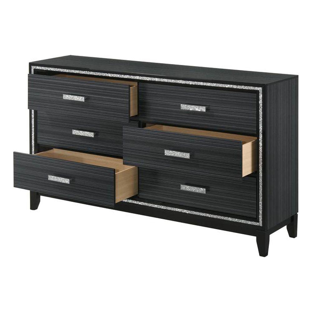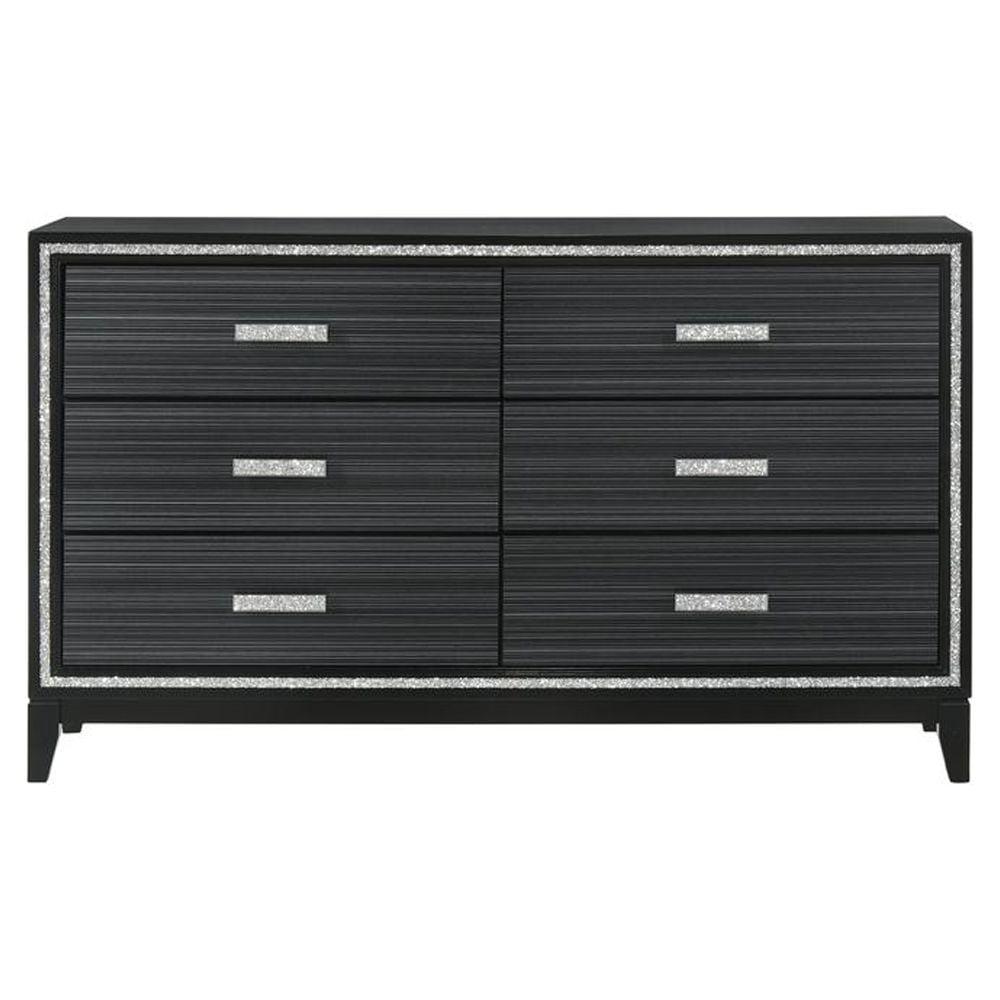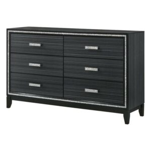 Classic design with touches of modern aspects makes this Haiden Dresser ideal for any bedroom. The piece offers a rectangular tabletop and six storage drawers for displaying or organizing. It also features a glamorous shimmering silver accent trim that adds richness to design. The drawer handles with the same shimmering silver tie them all together to create a cohesive look. The black finish makes it easy to fit into already existing decor.