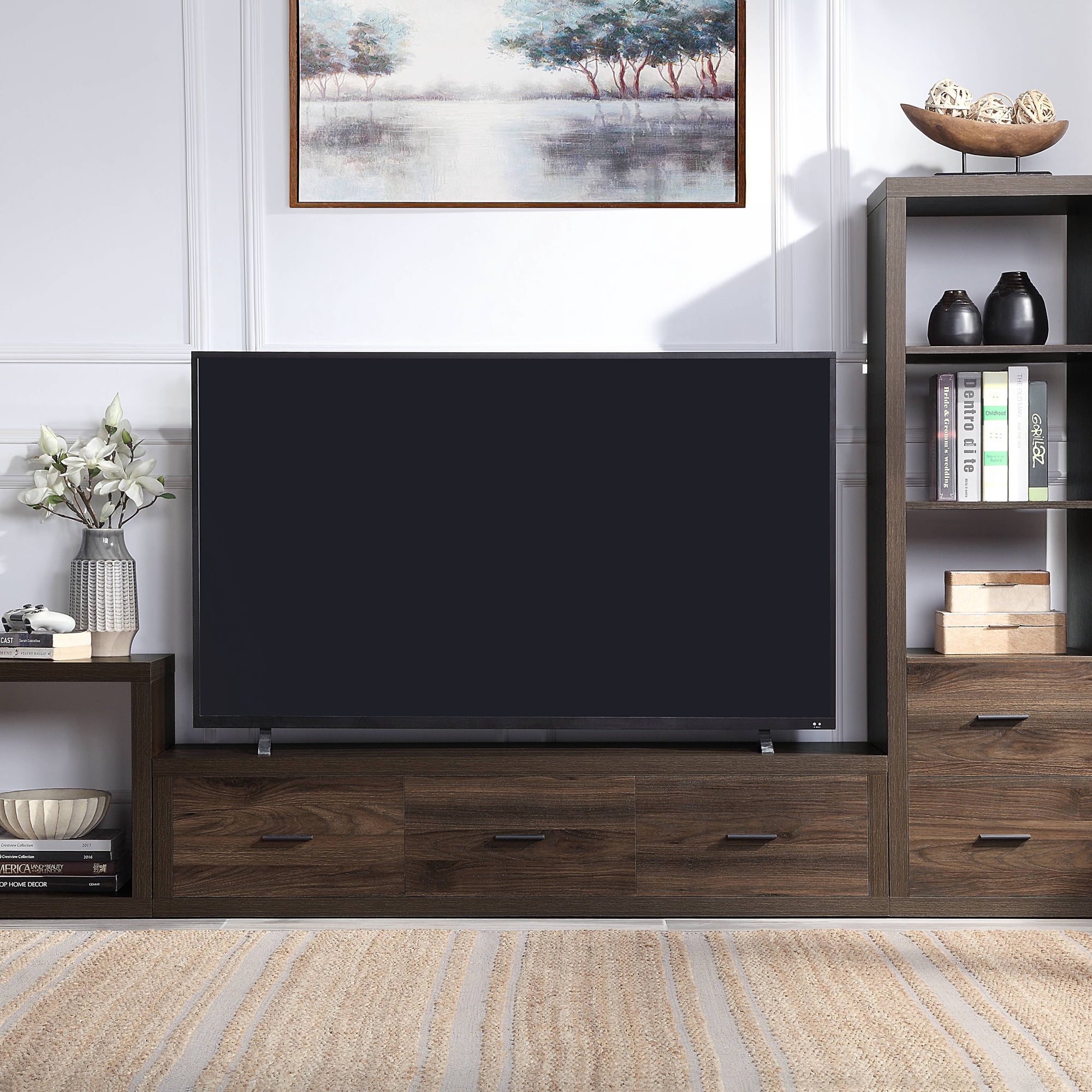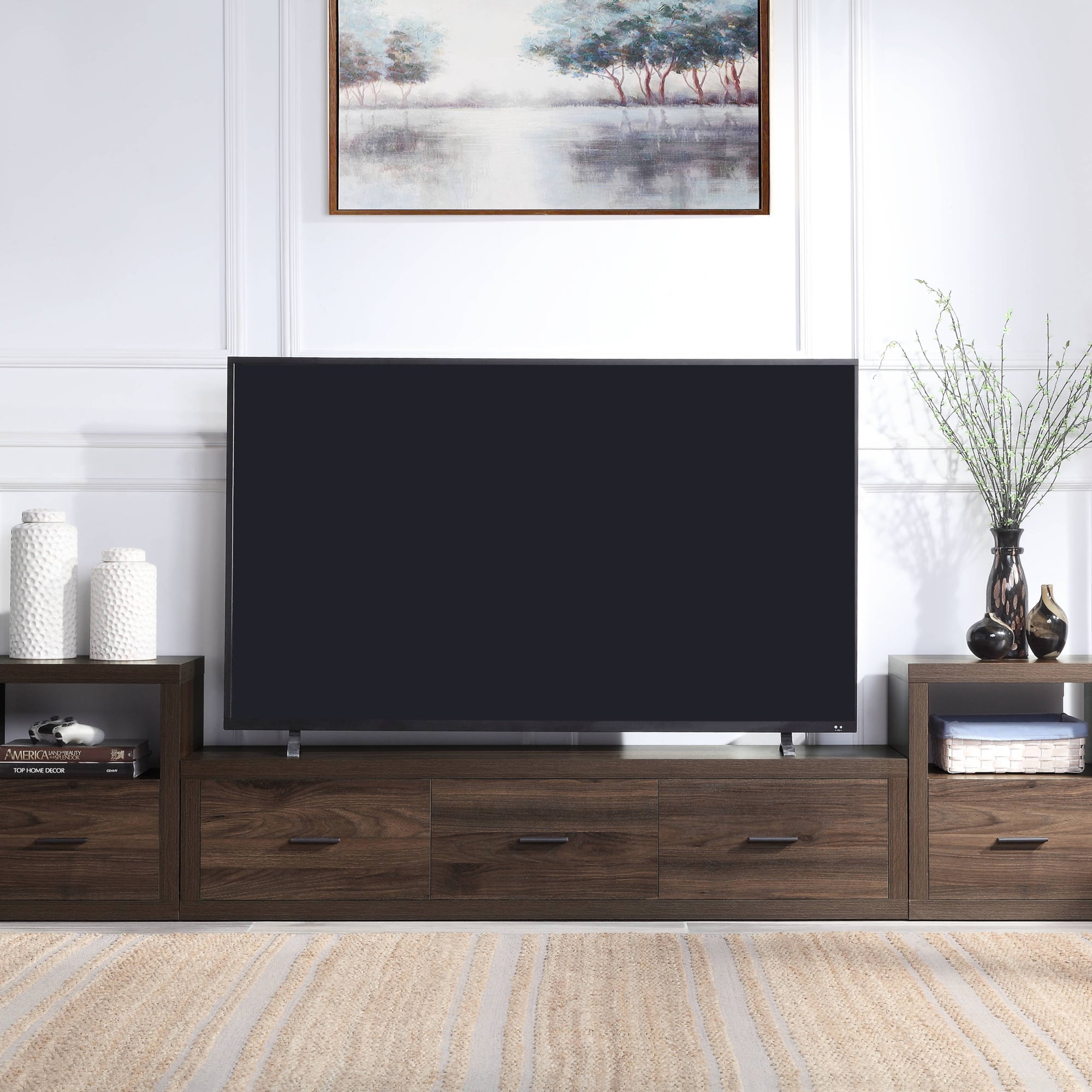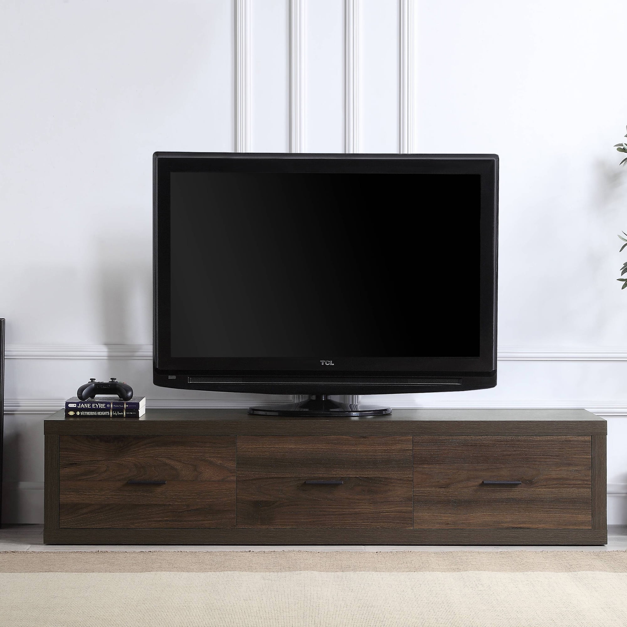 The Harel TV stand provides a clean, contemporary addition to your home decor. This amazing TV stand is perfect for most flat screens. The Harel TV stand is the ideal blend of style and functionality, with three large storage drawers. This versatile piece of furniture provides space to store your gaming consoles and accessories, components for your television, DVDs, blu-rays, board games, books, or anything else you need to stow away to keep your space clutter-free. The sleek walnut finish complements a variety of interior decor styles. The TV stand provides the perfect display and storage solution for any room in your home.
