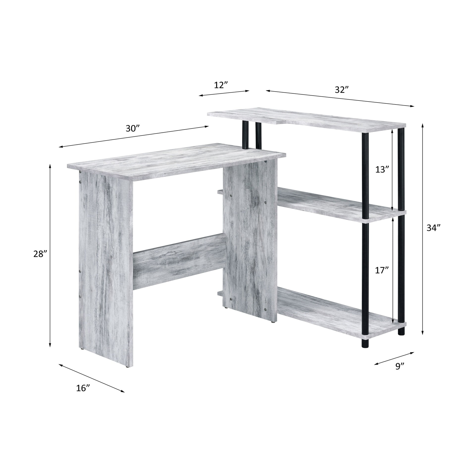 Warm, cozy while remaining functional, the Ievi Desk helps you find a good balance between work and life. It features a low bookshelf built into the right side, providing two open storage compartments for book or file organization. An elegant all wood design is used on desk and shelves, while metal frame secures the bookshelf to the desk. Complete your project or enjoy a leisure reading with the Ievi Desk. Features: L-shaped writing desk Desk with side shelf attached Number of shelf: 3 Leg space dimension: 28″W x 11″D x 28″H Weight capacity: 44 lbs Materials: Paper Veneer, Particle Board, Metal Specifications: Desk Dimensions: 39″W x 32″D x 34″H Product Weight: 40 lbs Color/Finish: Antique White and Black Shelf Weight Capacity: 11 lbs Weight Capacity: 44 lbs Assembly Required: Yes